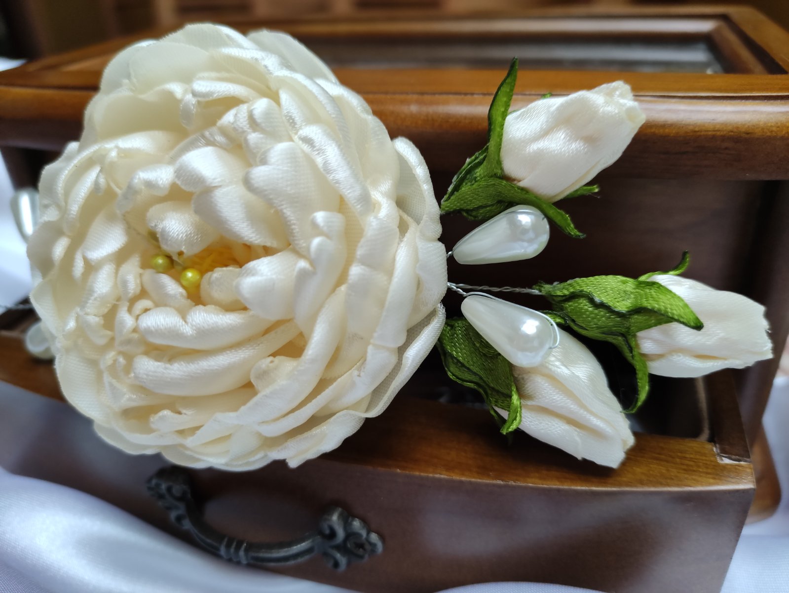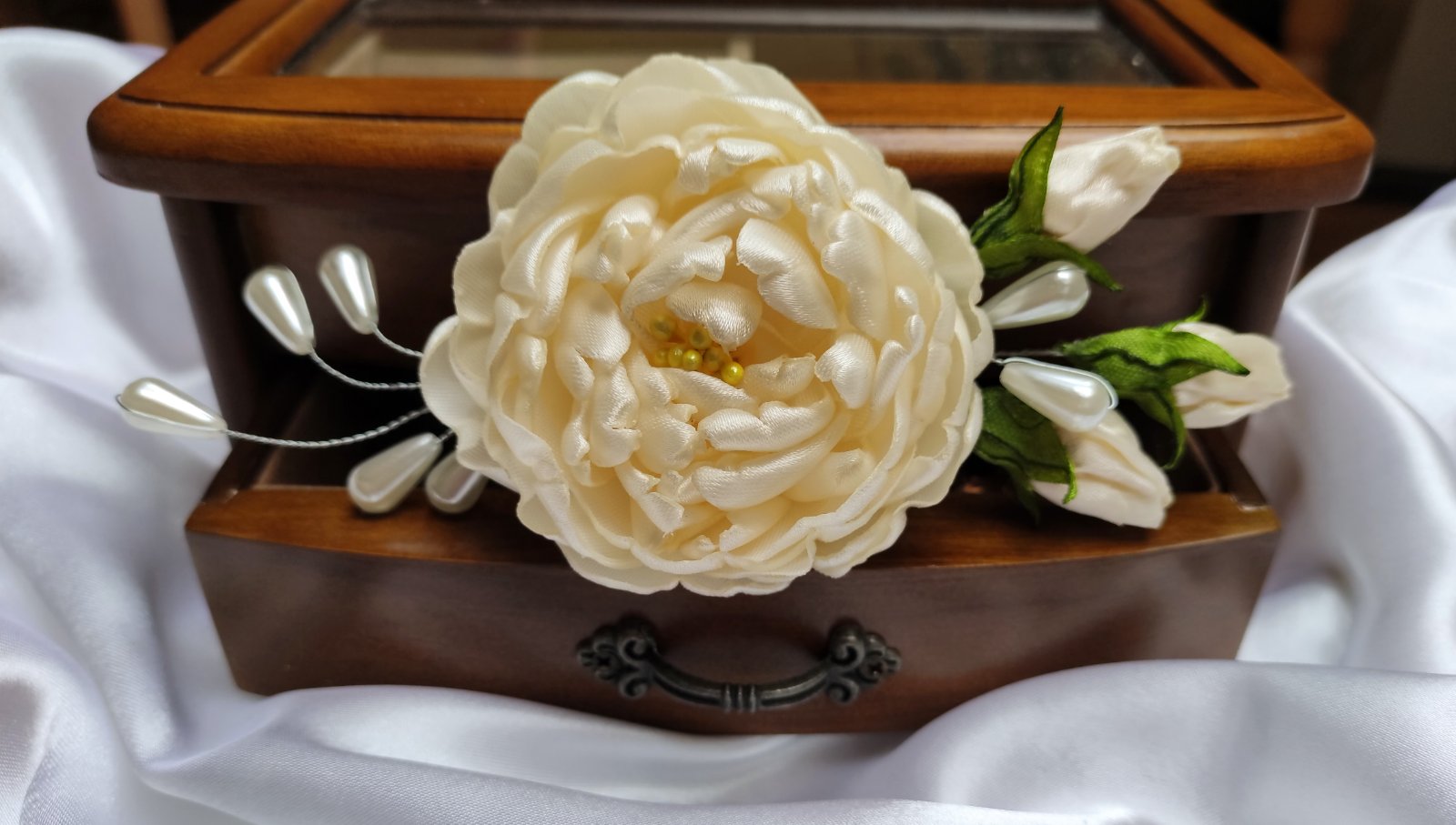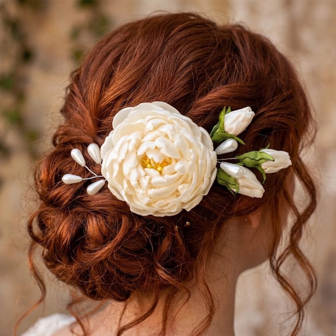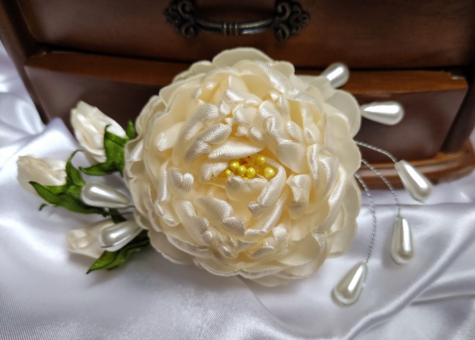 Na lupienky bohatá saténová pivónia s púčikmi dodá šmrnc blondýnkam, tmavovláskam či ryšavkám. Perličkové korálky, ako aj púčiky sa vďaka ohybným drôtikom dajú zapracovať do každého účesu. Vo vlasoch drží na malom štipci. Farba môže byť podľa vášho želania.