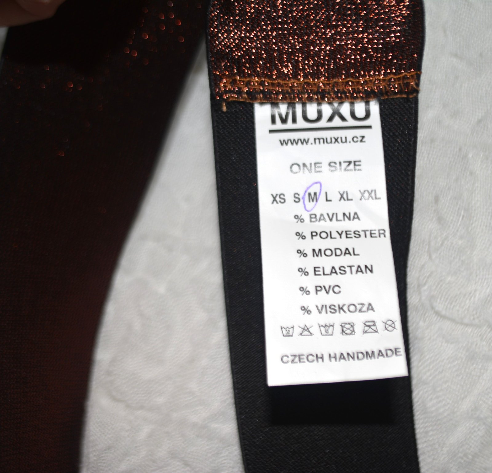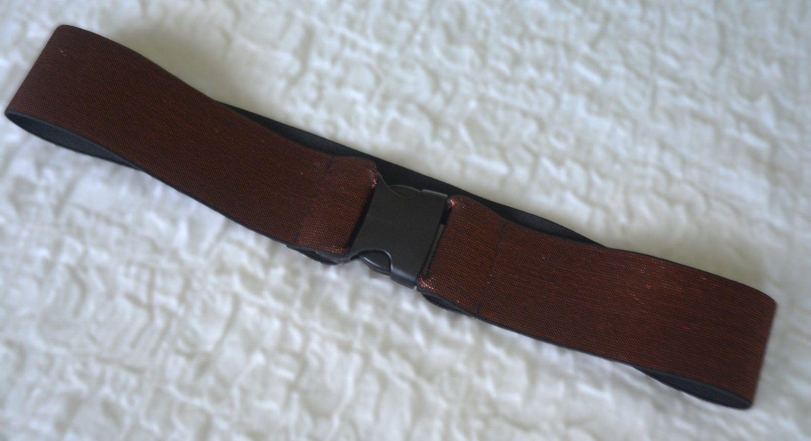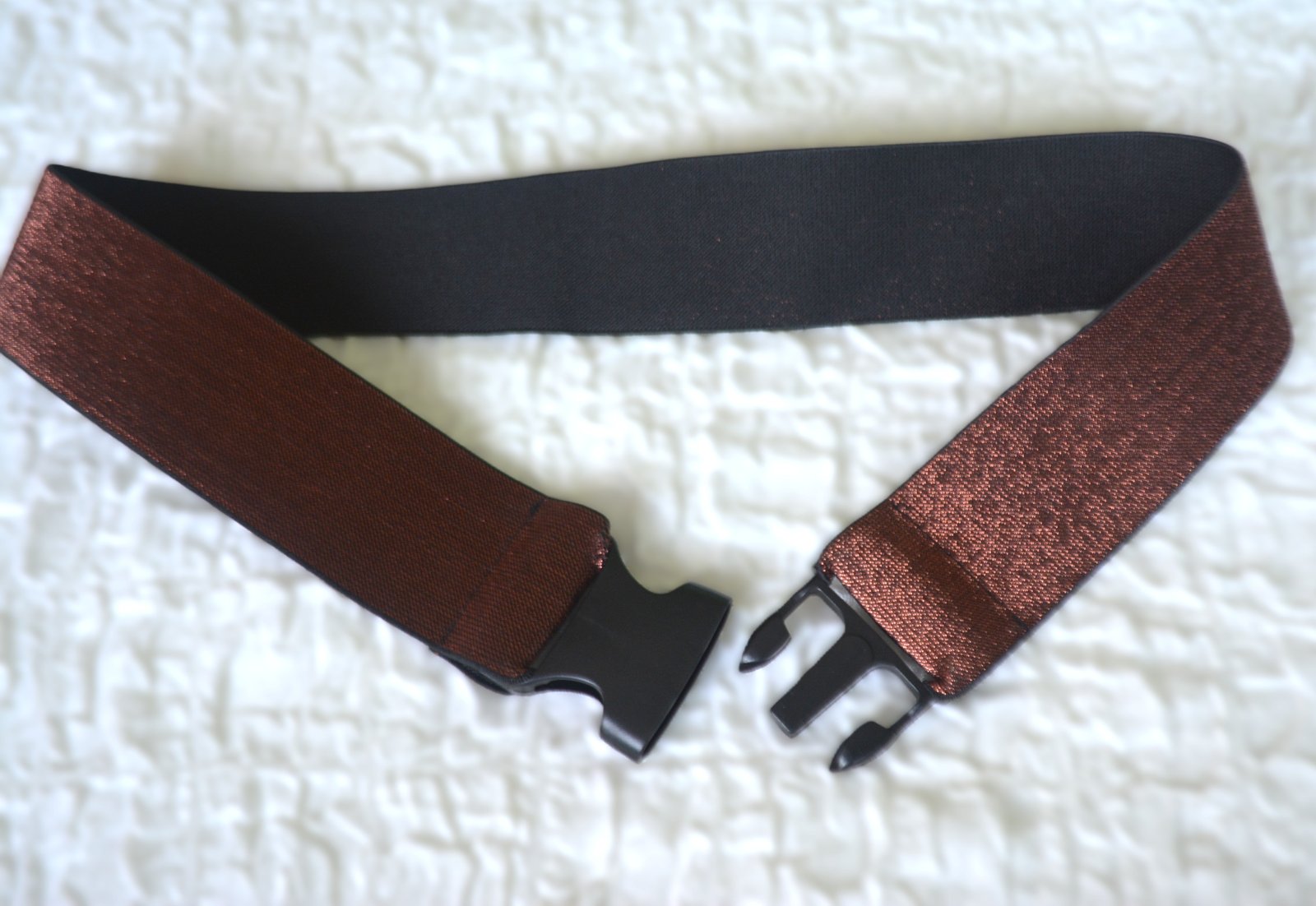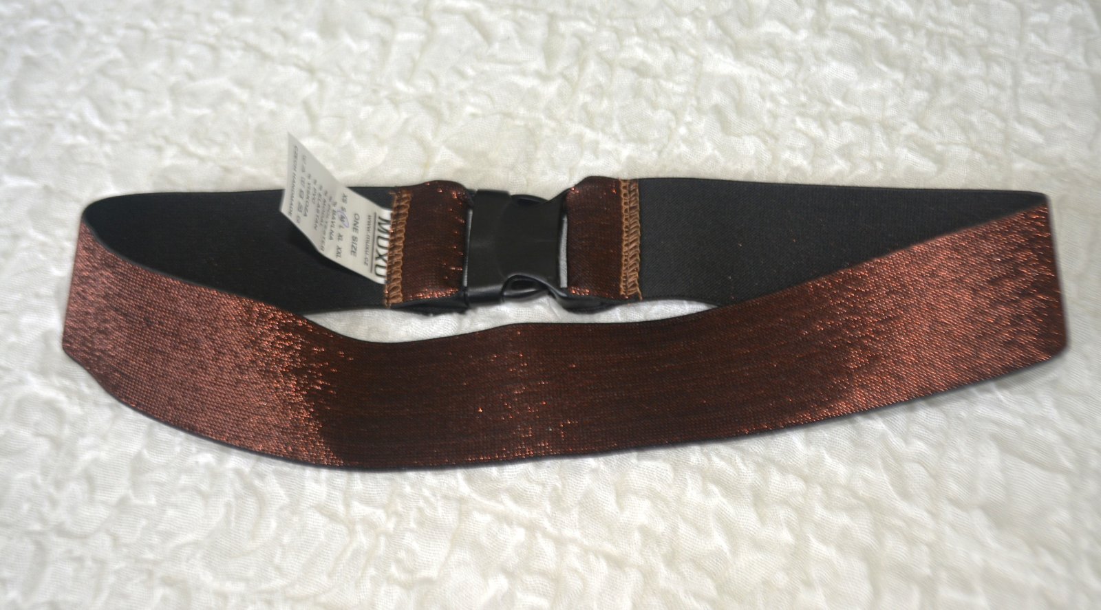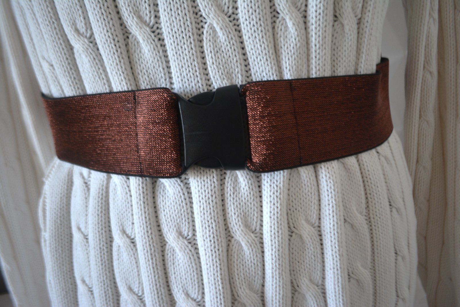 Dámsky trblietavý elastický opasok českej značky MUXU, veľkosť M - dĺžka voľne položeného je 70cm, natiahne sa do 80cm. Šírka 5cm.