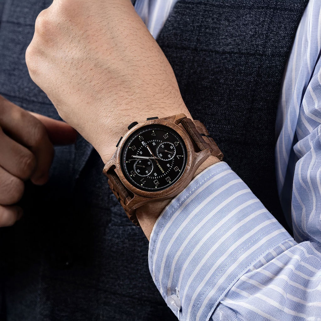 sa vďaka svojmu nadčasovému dizajnu stanú obľúbeným pánskym doplnkom, ktorý doladí k dokonalosti každý elegantný aj športový outfit. Hodinky sú vyrobené z orechového dreva a kombinácie nerezovej ocele. Športovo elegantný ciferník disponuje funkciou chronografu (stopky) a funkciou zobrazovania dátumu.