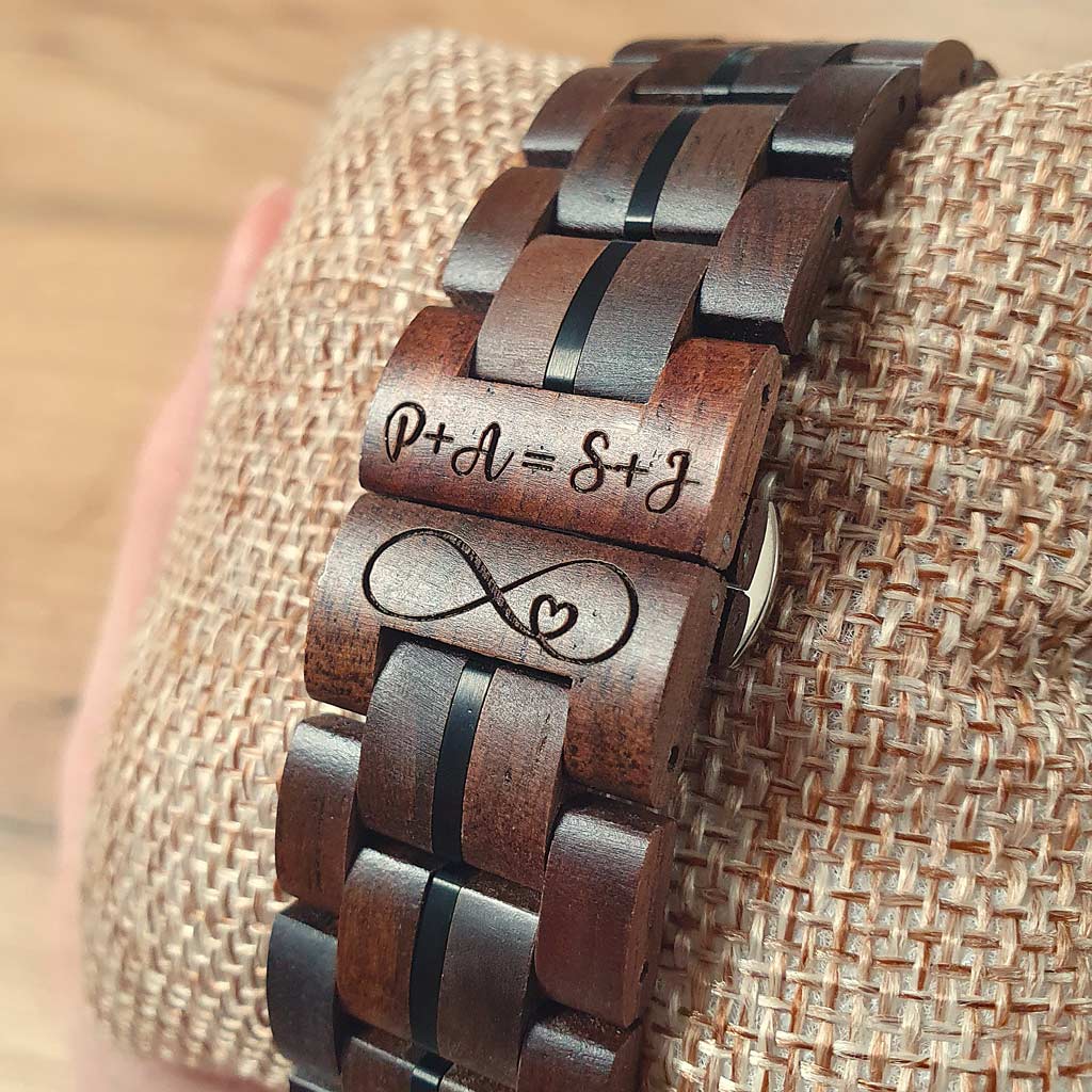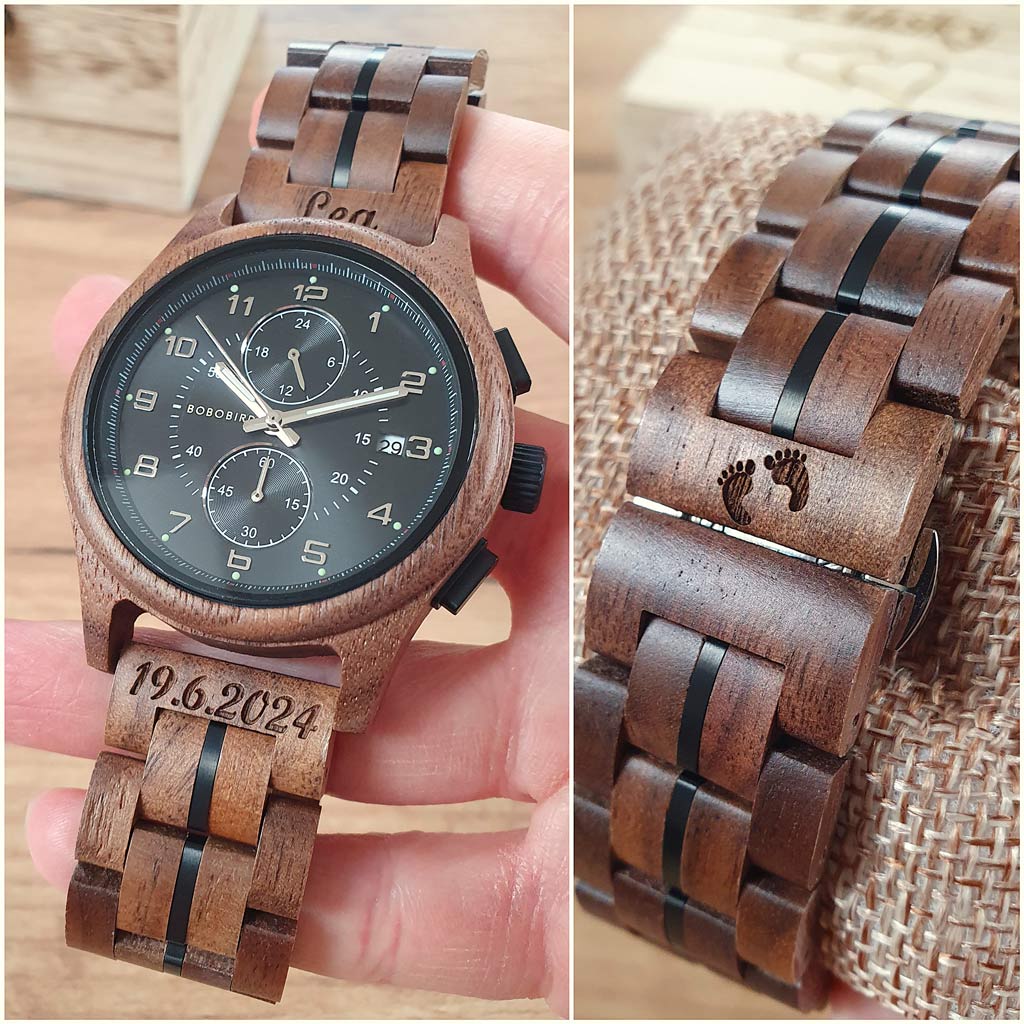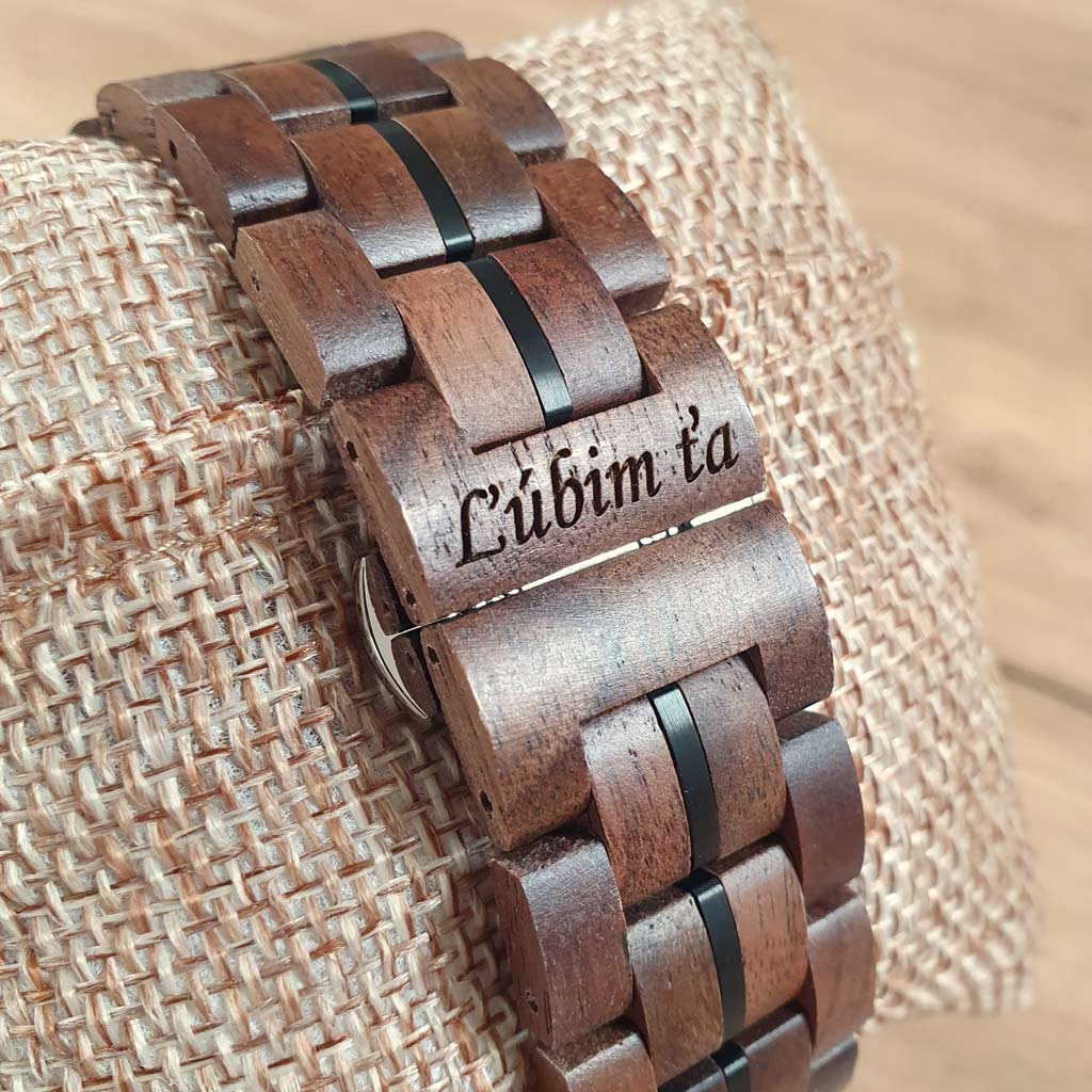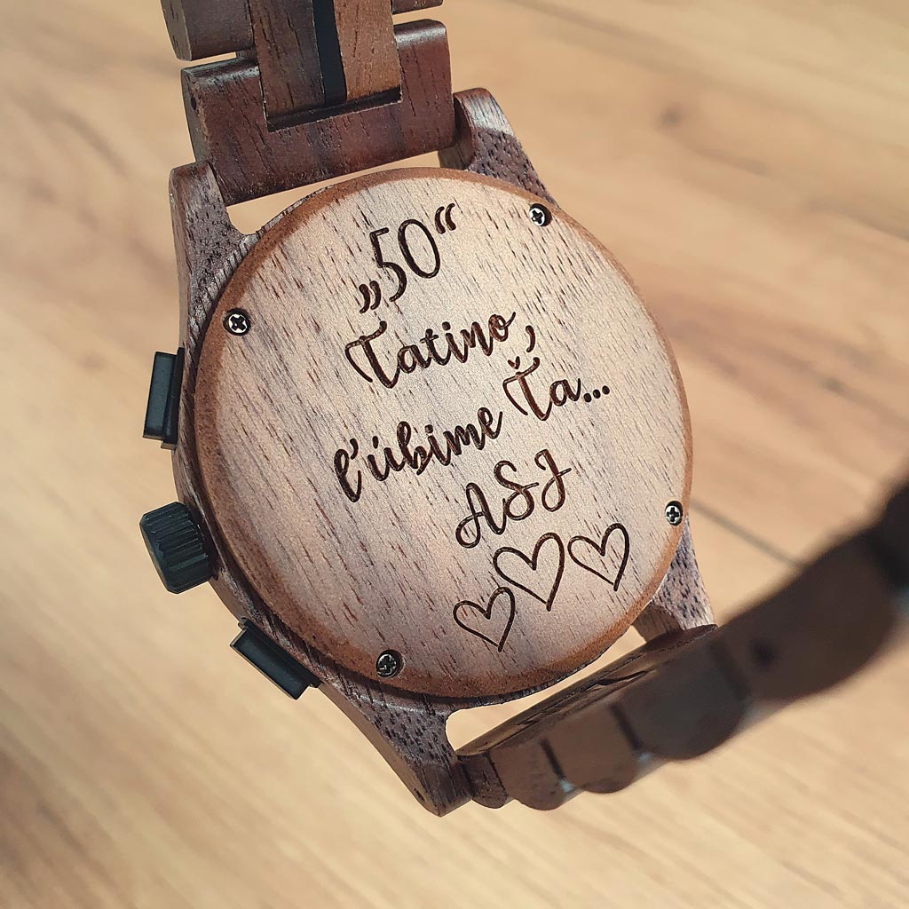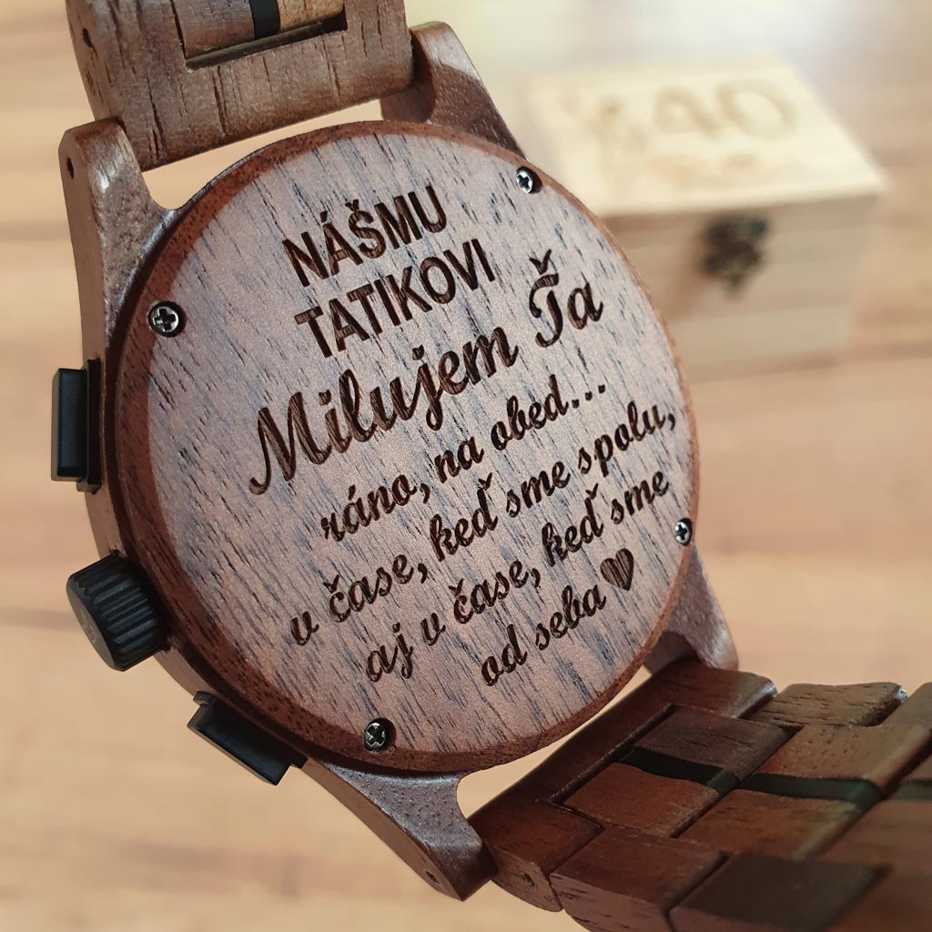 Na hodinky si môžete pridať vlastné venovanie (text a motív) ktorý vám vygravírujeme podľa vášho želania: na zadnú stranu hodiniek, remienok a drevenú krabičku.