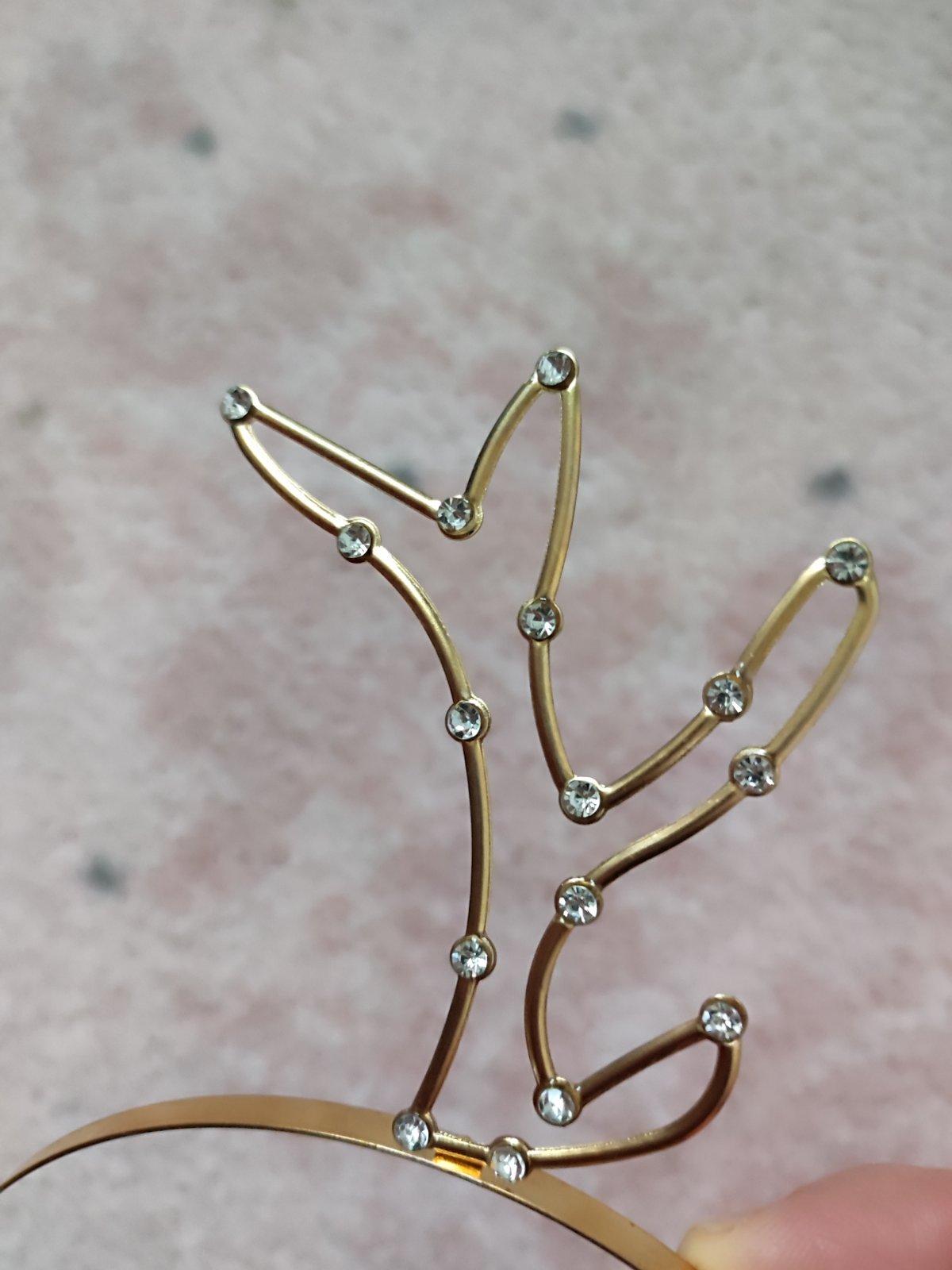 Krásna a elegantná čelenka, určená na výnimočný deň, vo farbe ružového zlata, posiata čírimi zirkónmi. Vhodná na upnutie pomocou stúh, no rovnako dobre poslúži aj bez nich. Použitá len raz, vo výbo...