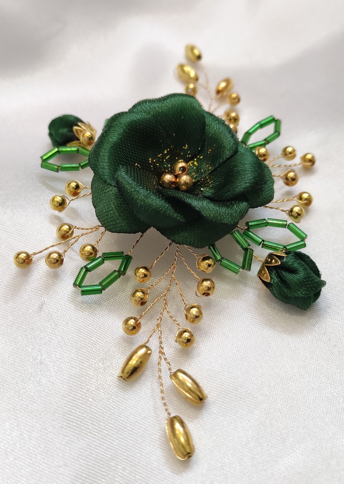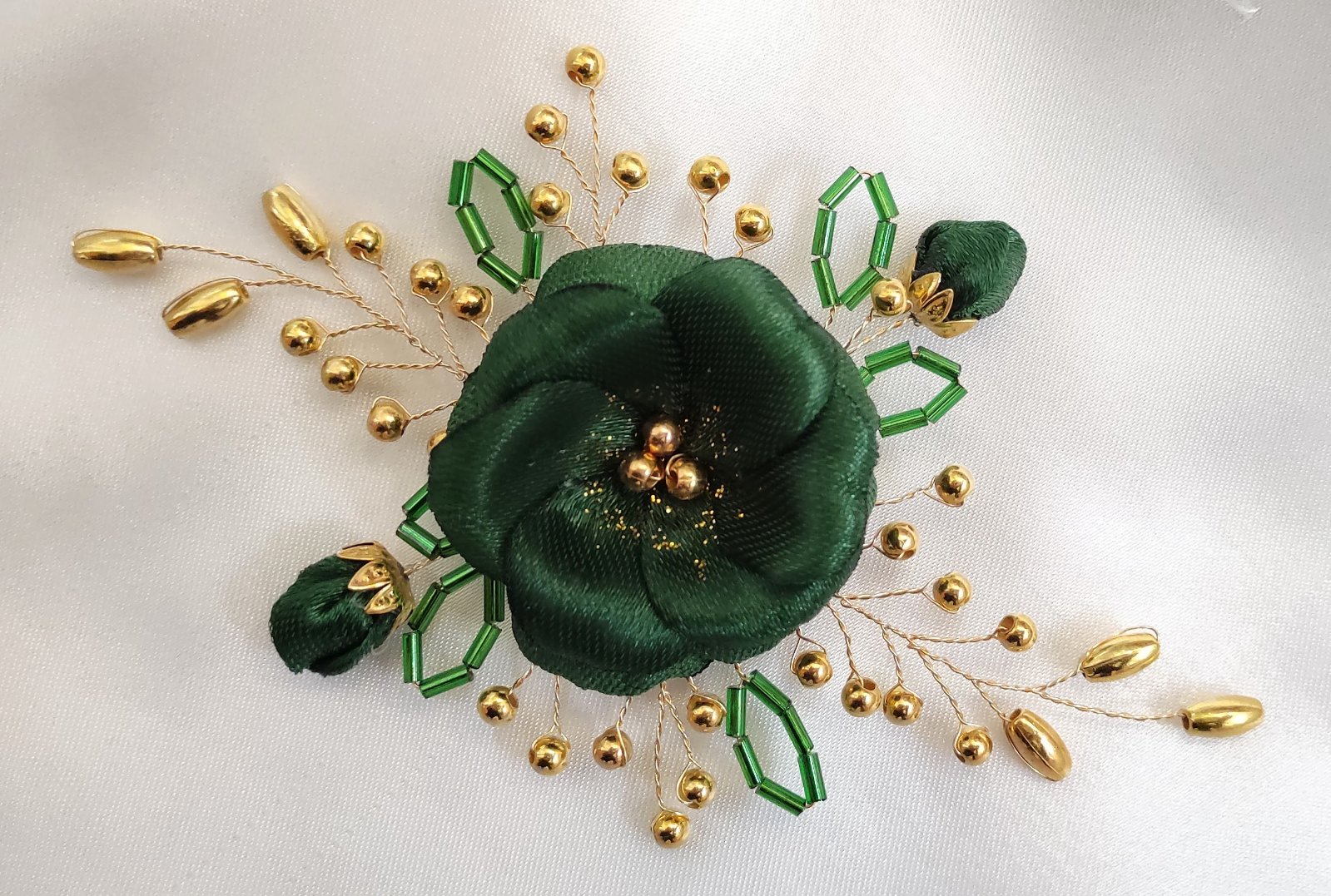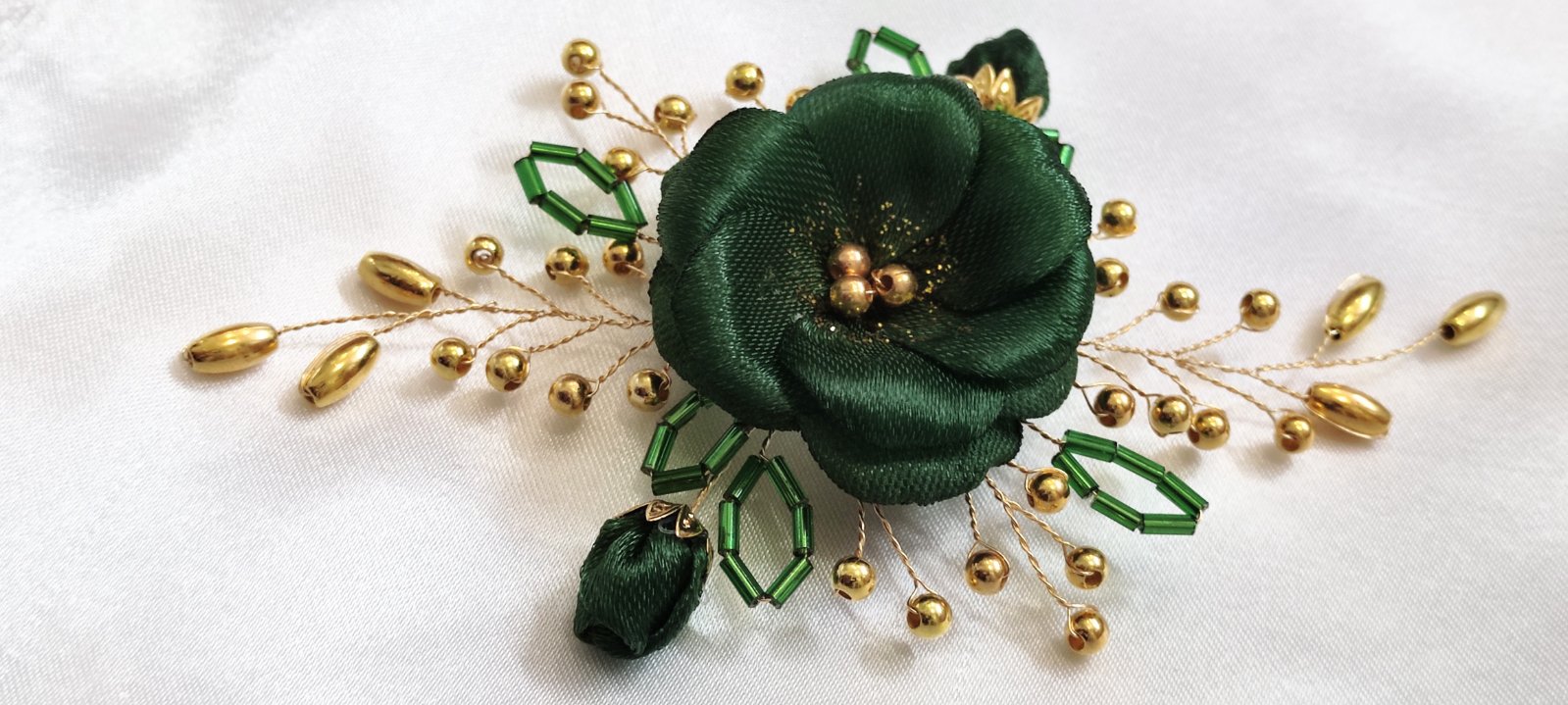 Kvet a púčiky sú nádherne doplnené zlatými korálkami, ktoré sú pripevnené na ohybných zlatých drôtikoch, čo umožňuje ľahké tvarovanie podľa vašich predstáv.