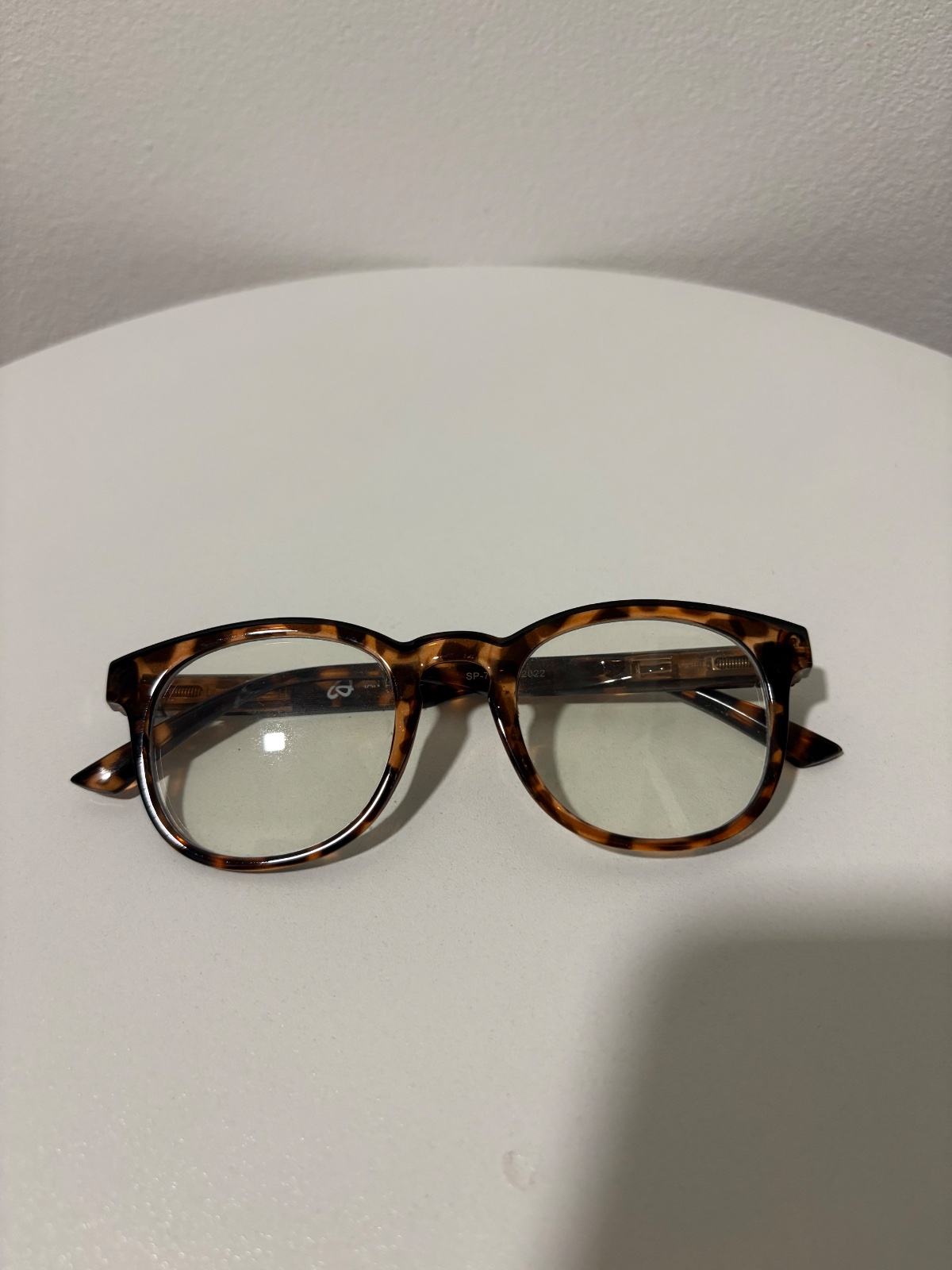 Pekné slnečné okuliare, strakatý "leo" vzor horčicovo-hnedej farby, s kovovými zlatými ozdobnými rúčkami. Výborne zachovalé, bez poškodení.