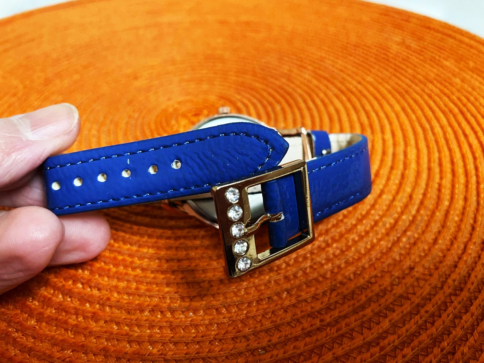 remienok lakový - parížska modrá,priemer ciferníka = 3,5 cm,lemovaný bielymi kryštálikmi - kameňmi