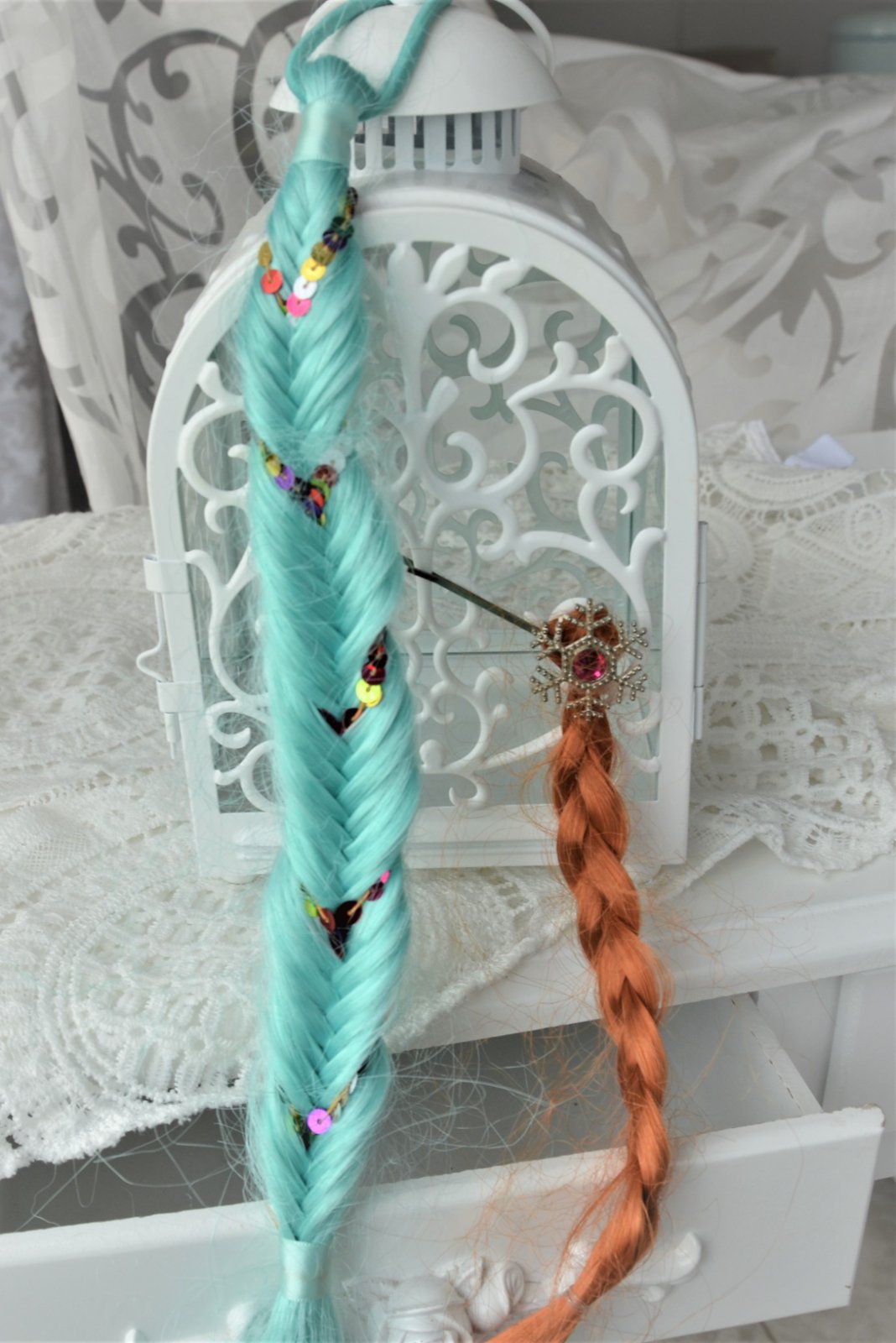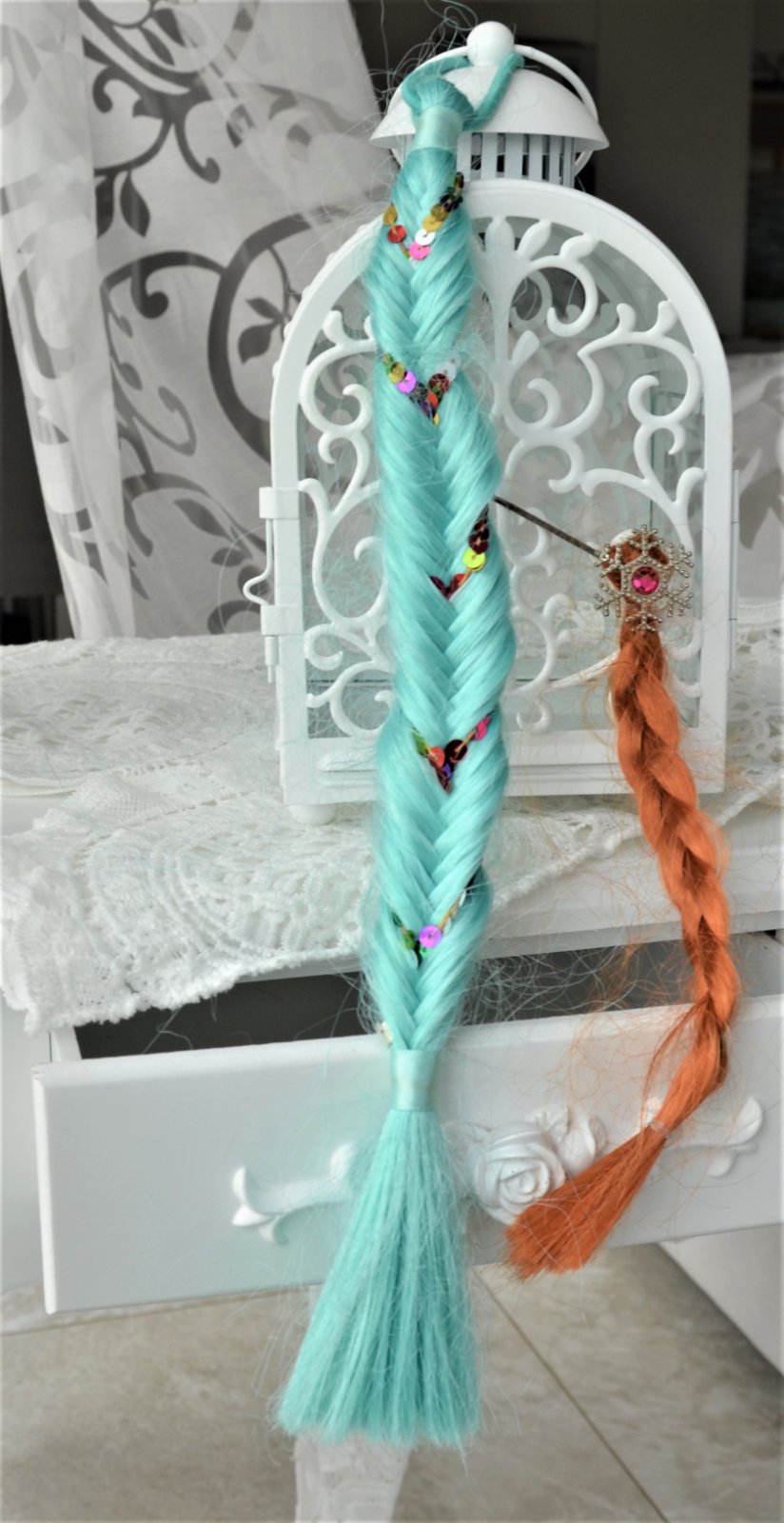 nevymieňam!!cena za oba!!predaj len spolu!!vrkoč sme mali asi 2x na hlave,pri skladovaní sa mi trochu "zachlpil"viď foto,na gumičke,dĺžka 39cm,ryšavý má zapínanie na sponku-dĺžka 23cm..kuk aj na iné moje inzeráty