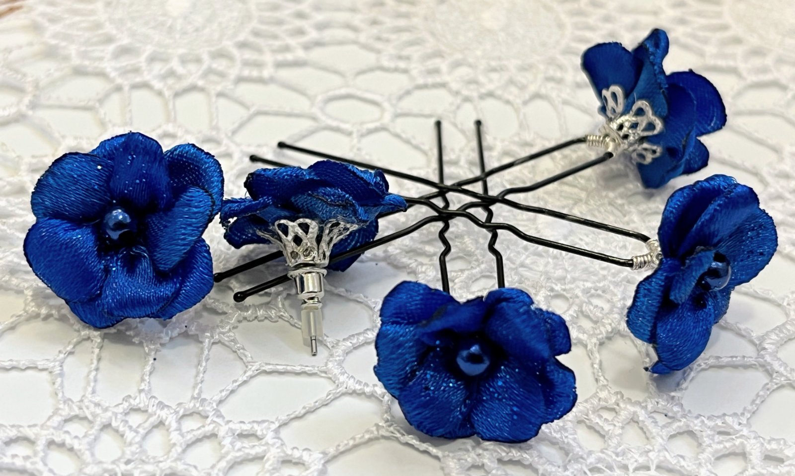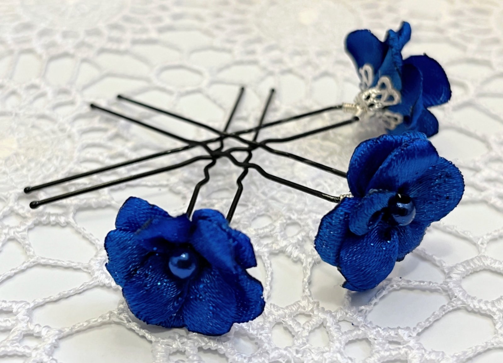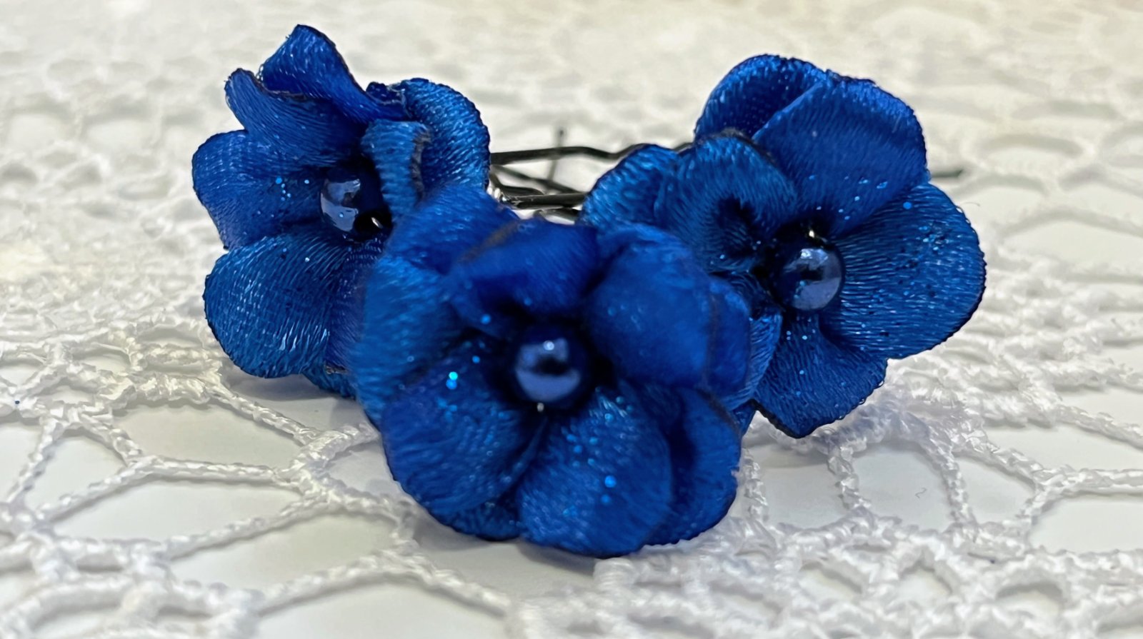 Saténová nezábudka na vlásenke je ideálnym doplnkom k plesovým šatám alebo na iné slávnostné príležitosti.