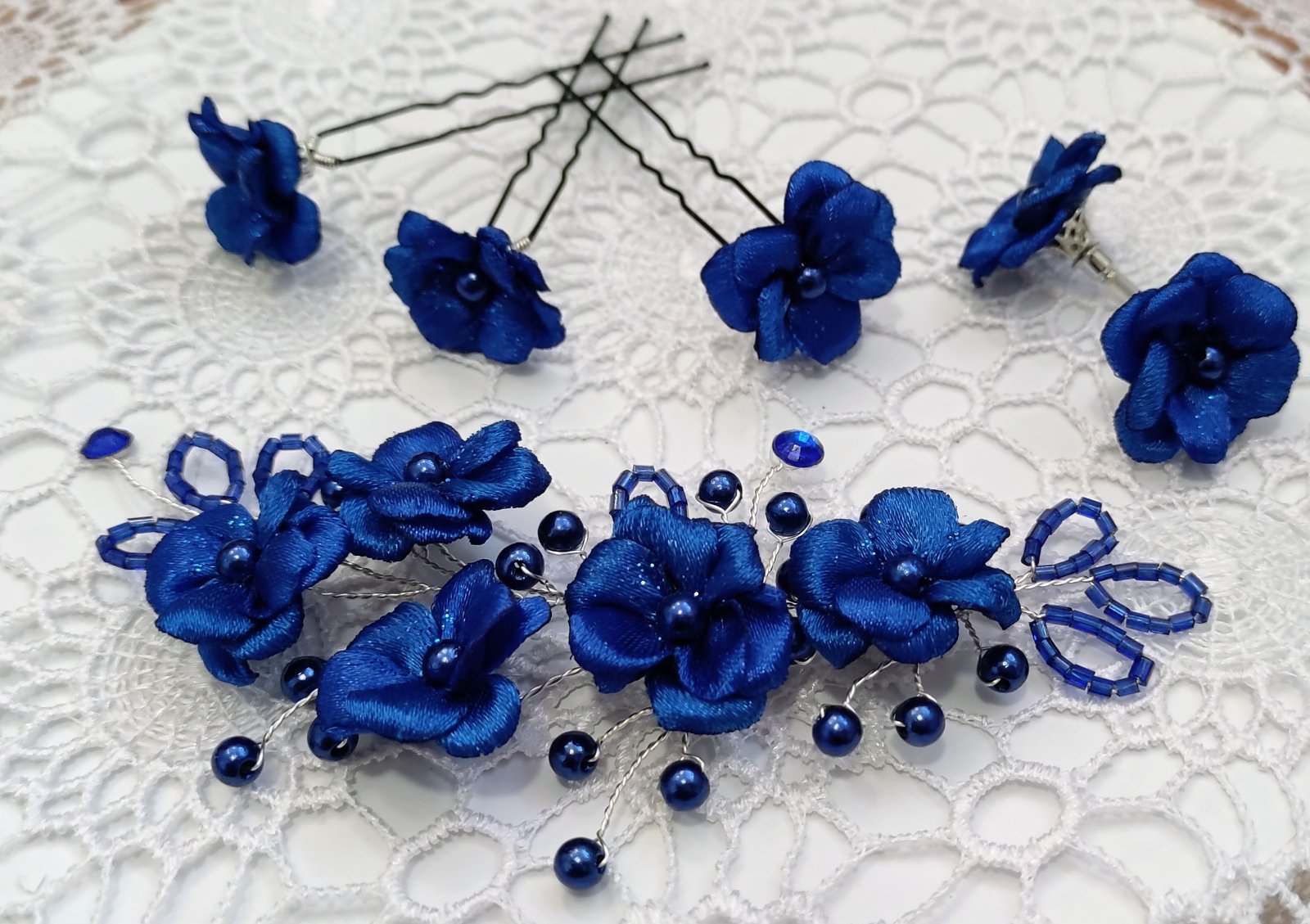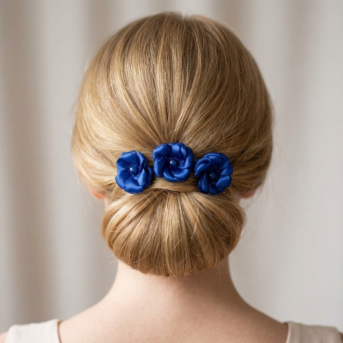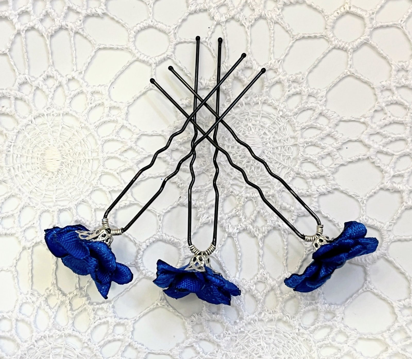Saténová nezábudka na vlásenke je ideálnym doplnkom k plesovým šatám alebo na iné slávnostné príležitosti.