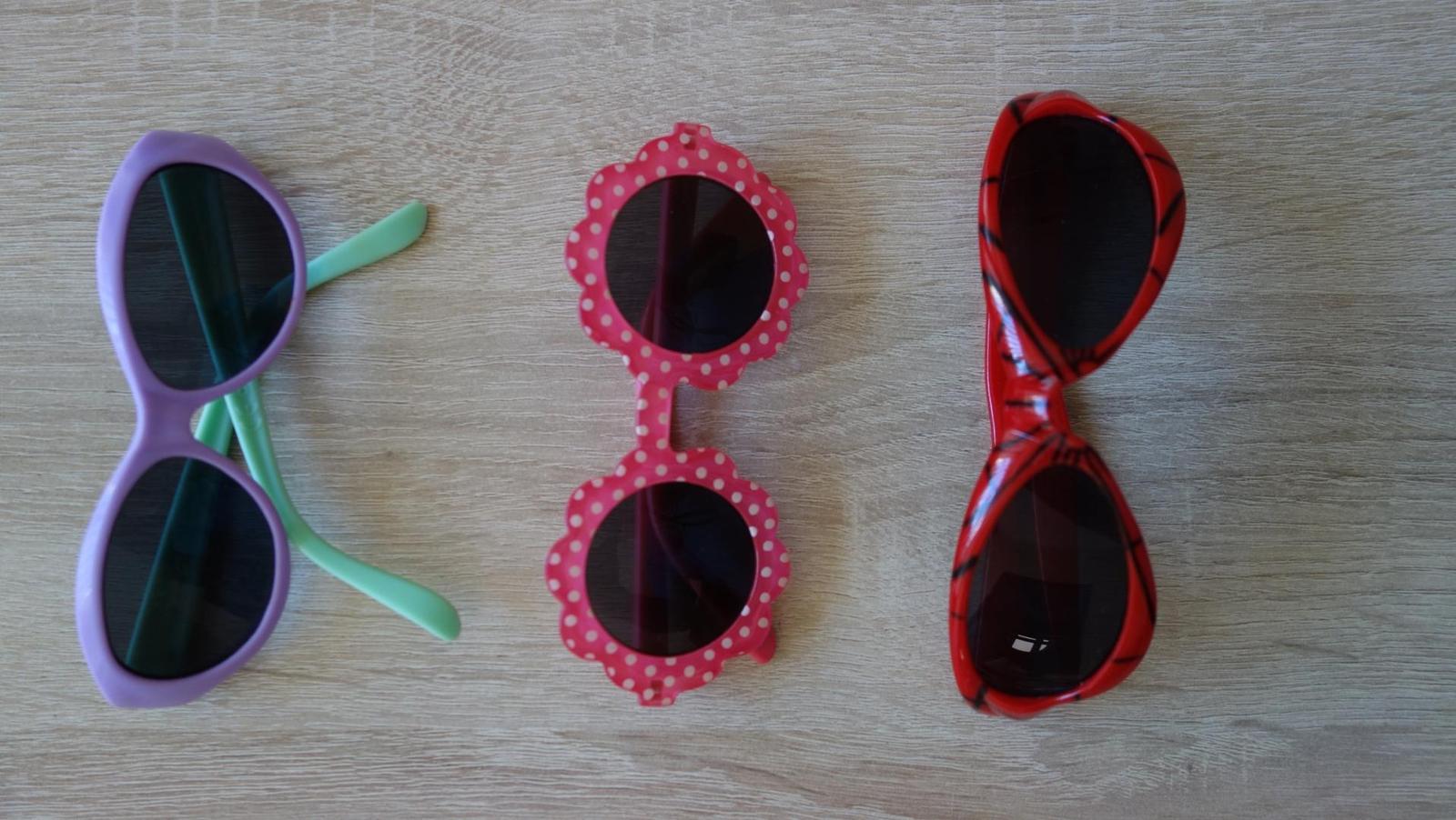 3 ks slnečných okuliarov. Fialkové a ružové sú približne na 1 rok. Červené sú pre chlapca asi tak na 5 rokov. Každé po 2,- eurá.