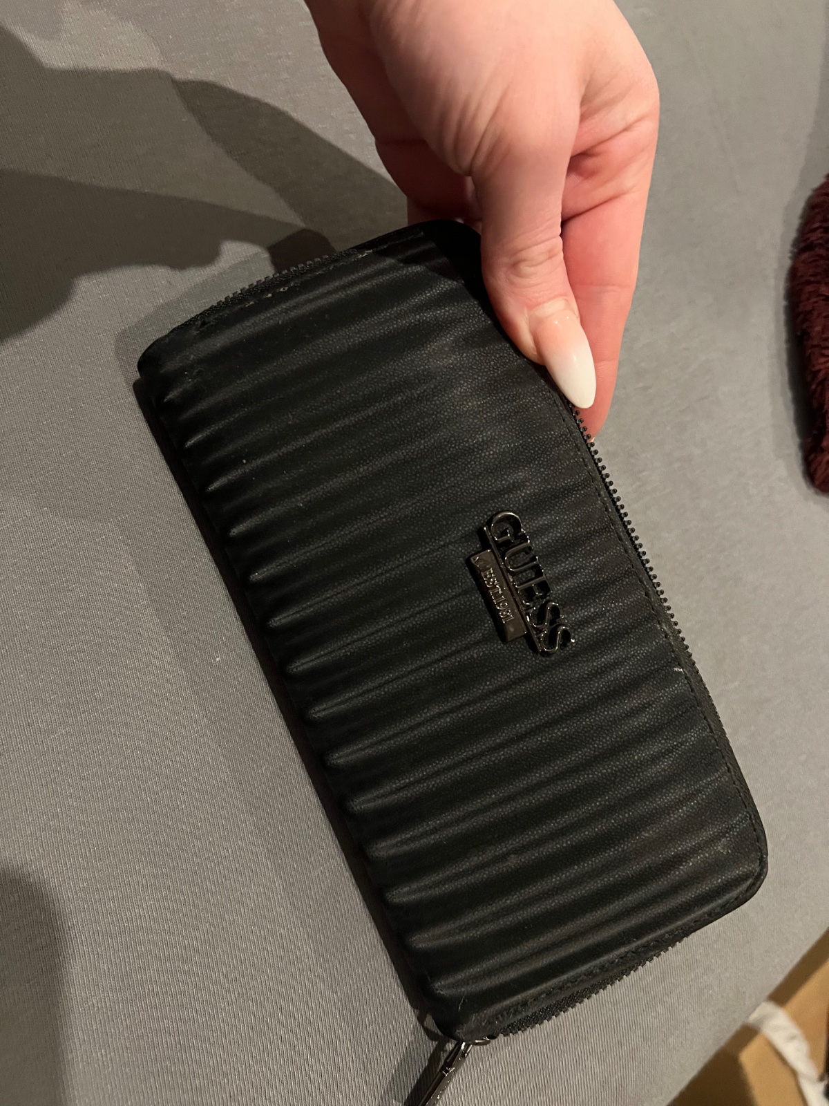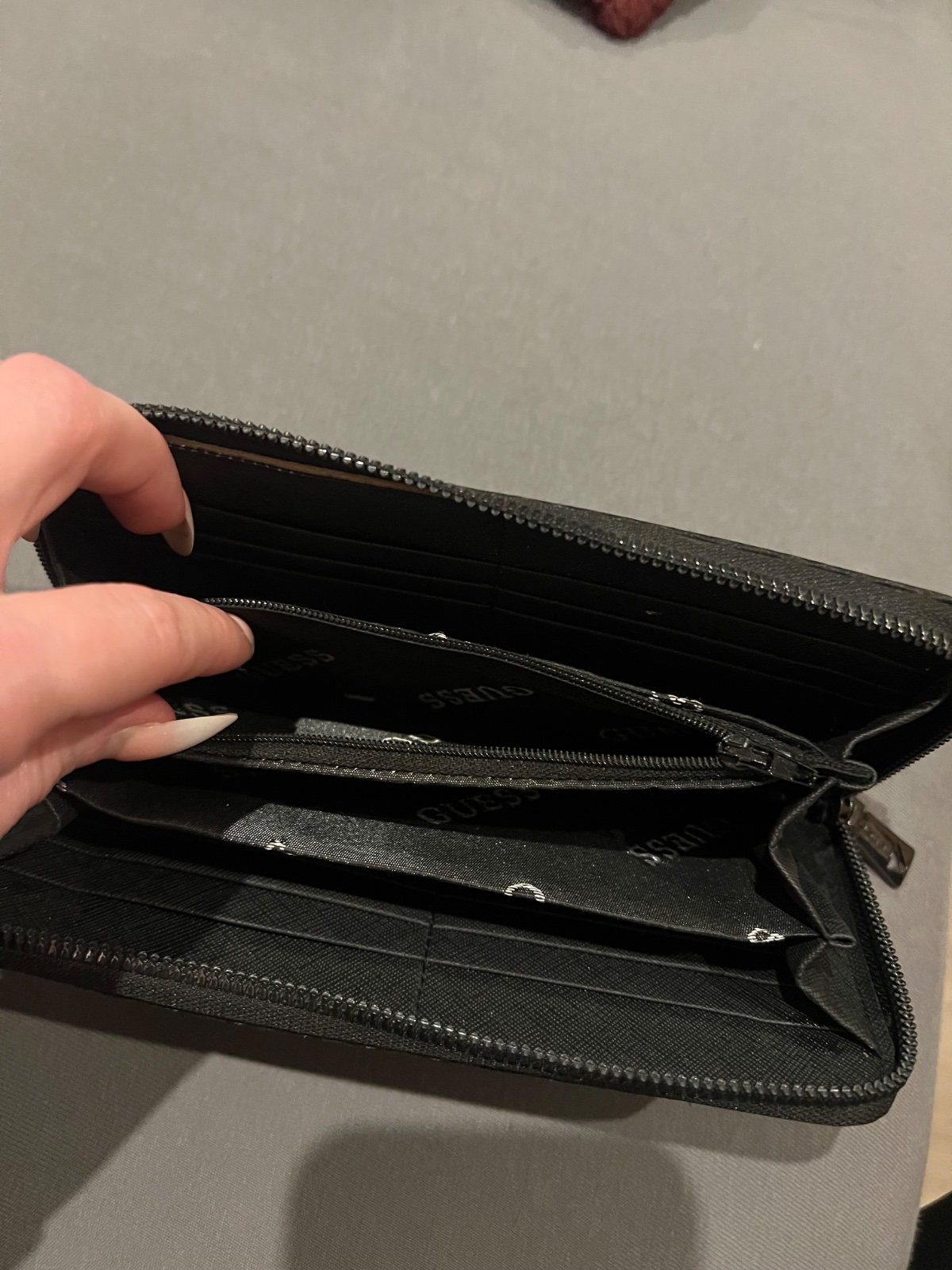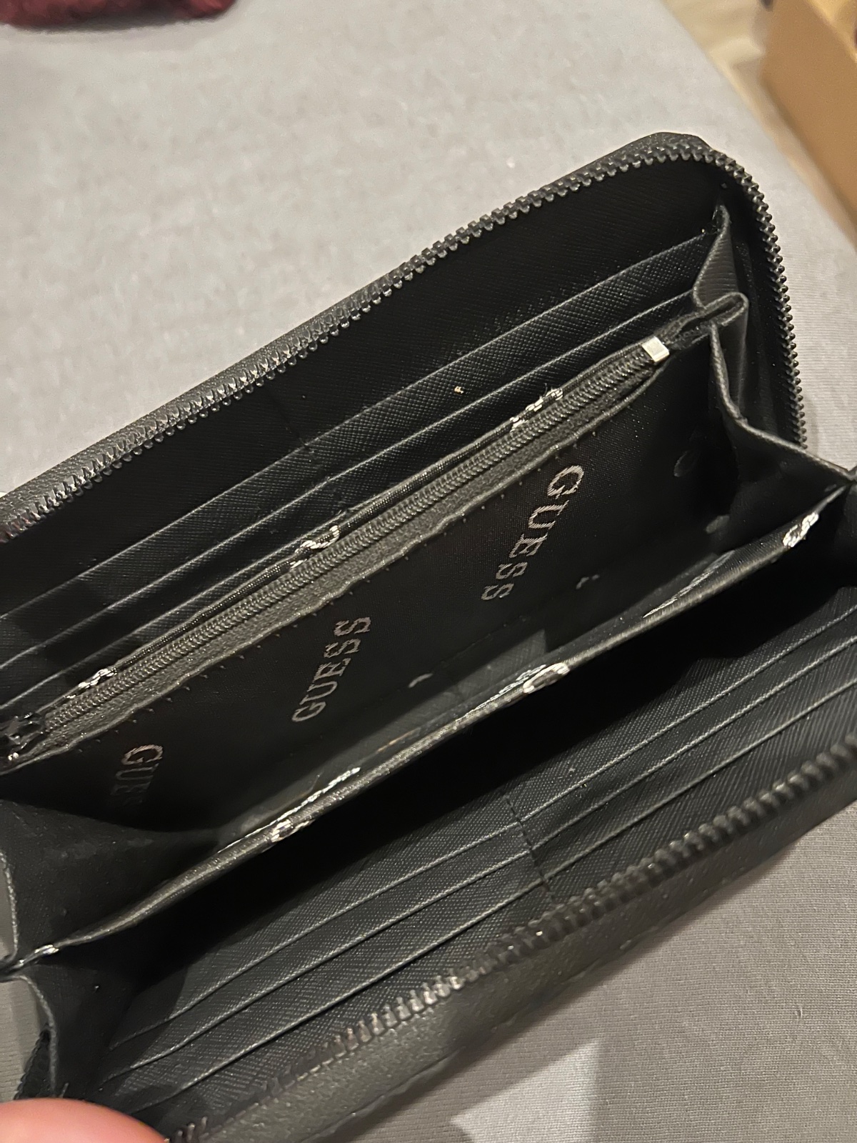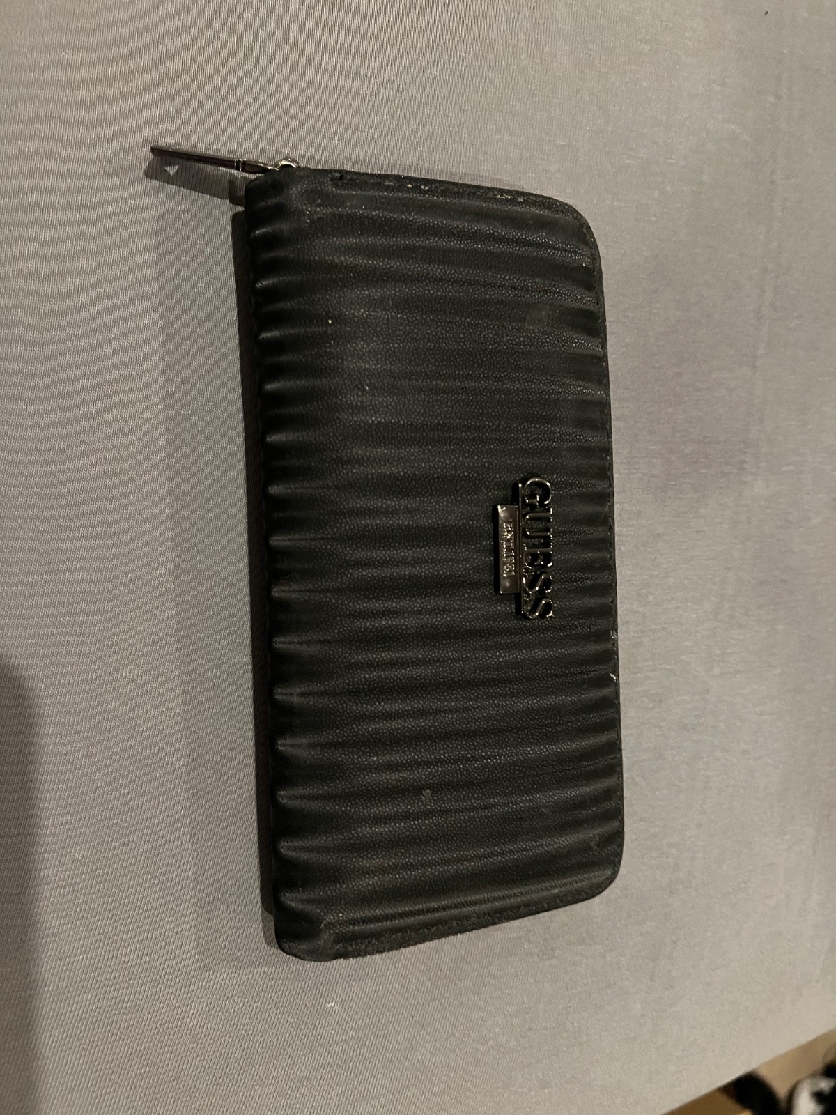 elegantná dámska peňaženka značky Guess čierna farba s jemným vzorom loga po celom povrchu výrazný kovový nápis GUESS vpredu – luxusný detail, ktorý zaujme, – mierne ošúchaný, no stále pôsobí štýlo...