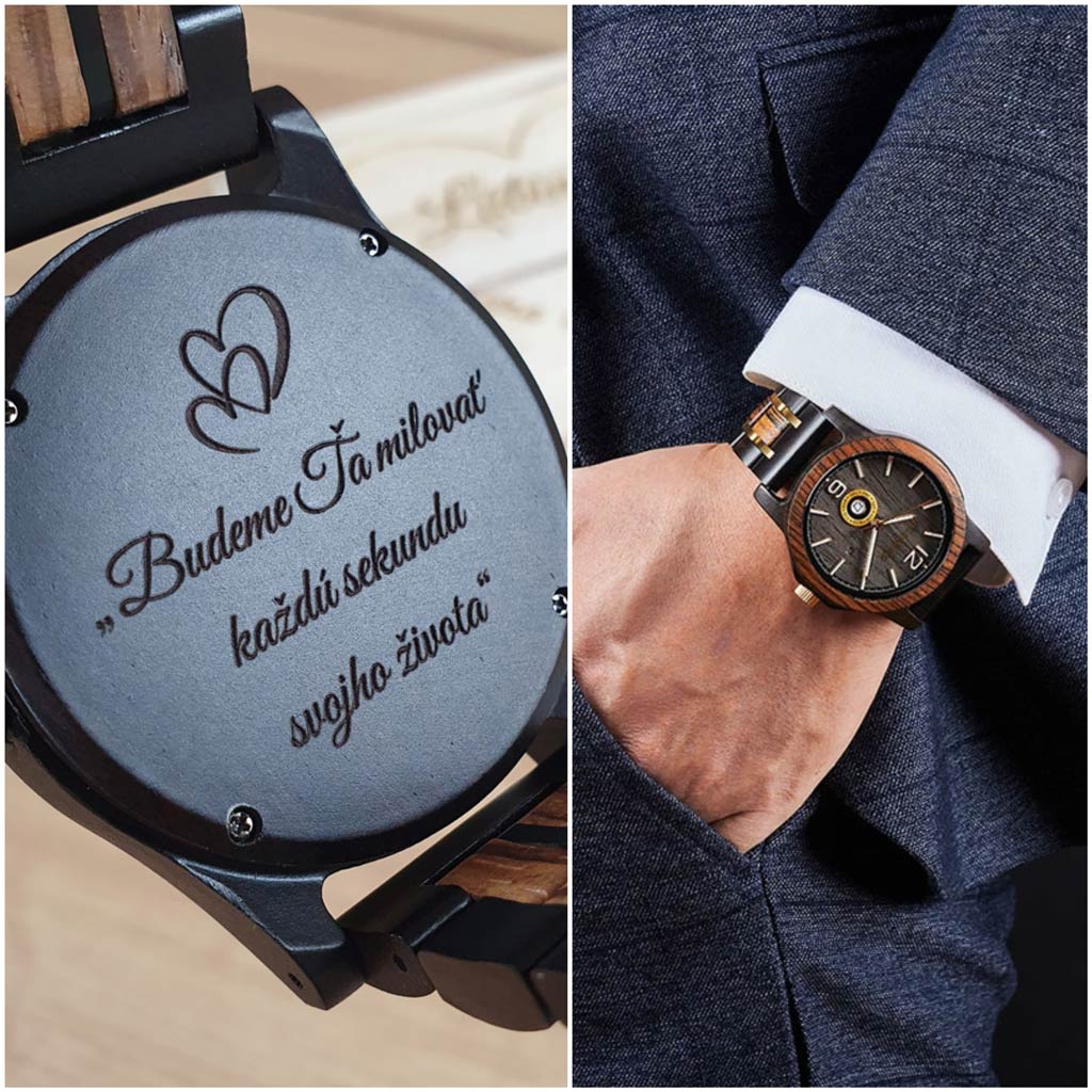 Na hodinky si môžete pridať vlastné venovanie (text a motív) ktorý vám vygravírujeme podľa vášho želania: na zadnú stranu hodiniek, remienok a drevenú krabičku.