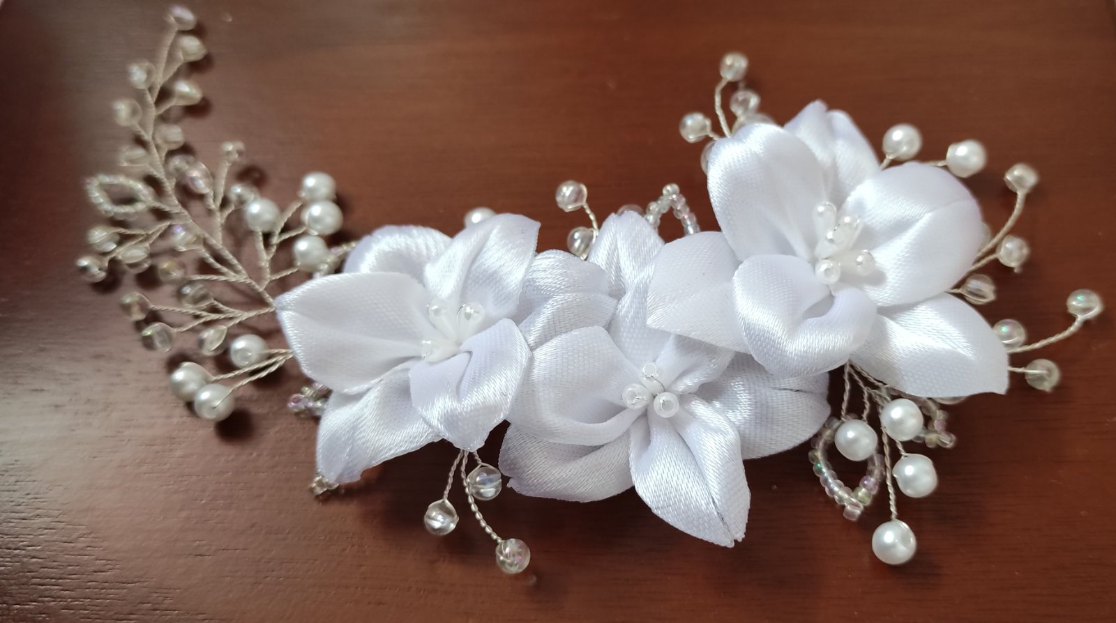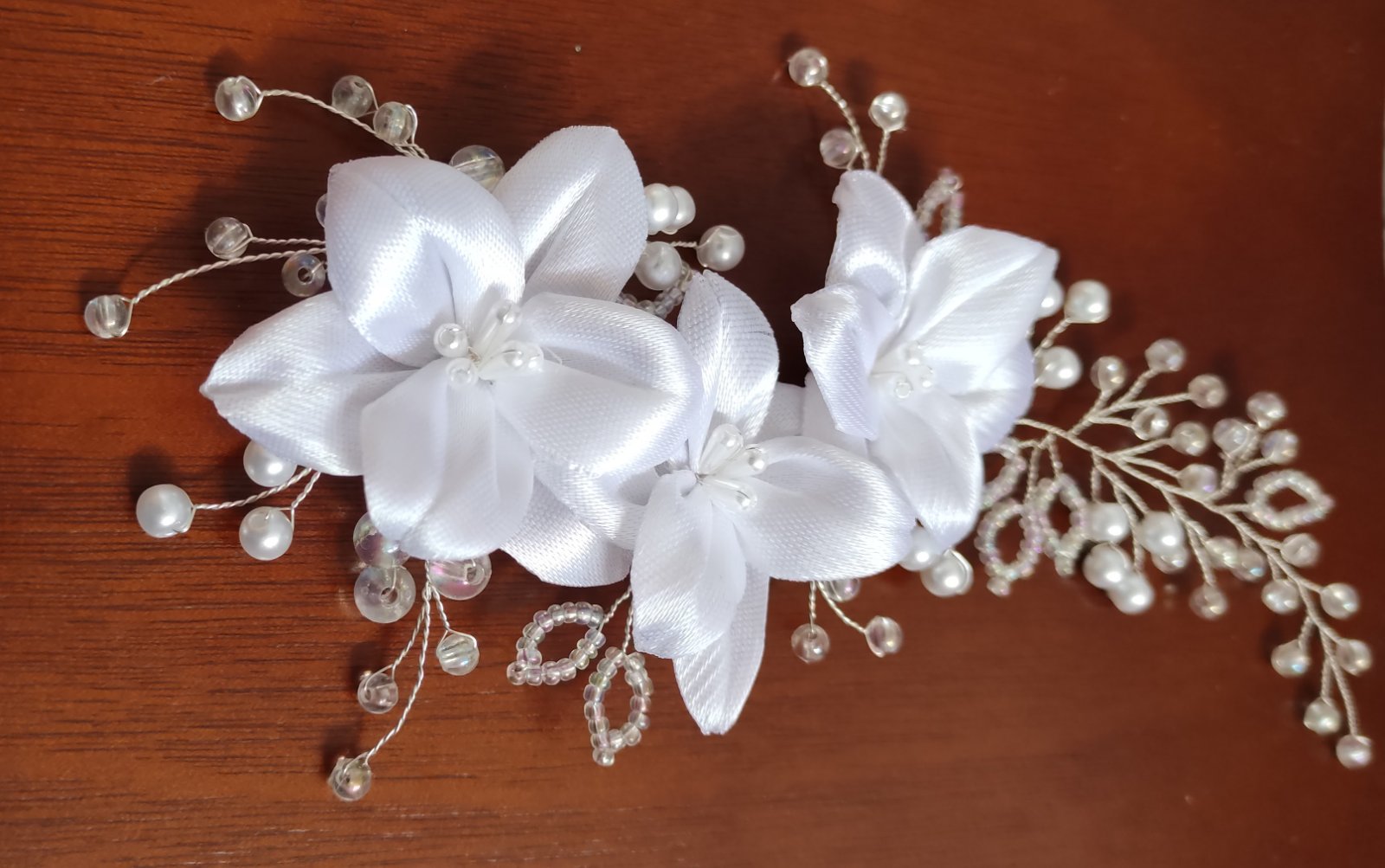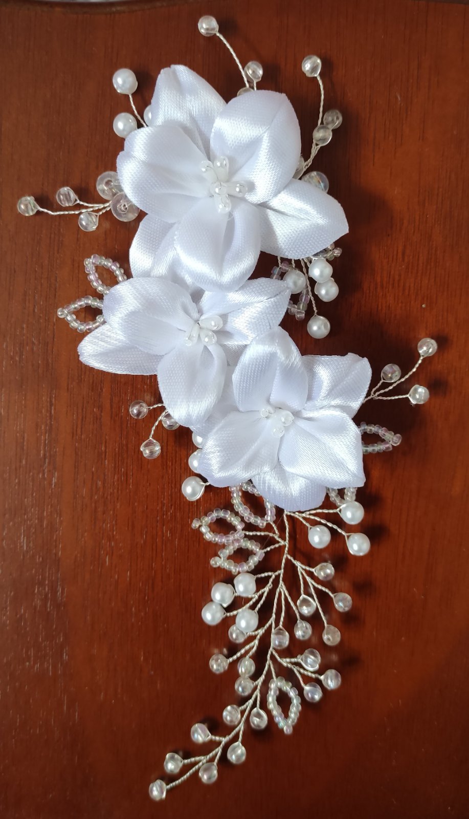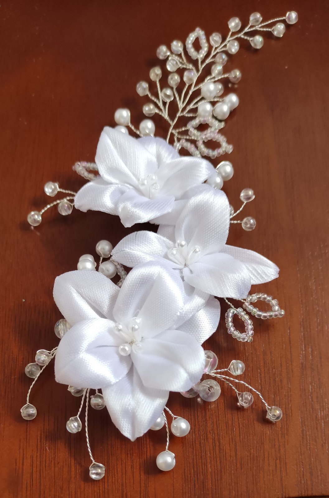 Jemná ozdoba do vlasov vytvorená zo snehobielych saténových ľalií, doplnená sklenenými a akrylovými korálikmi, sa ľahko upevní do účesu pomocou vlásenky alebo hrebienka.