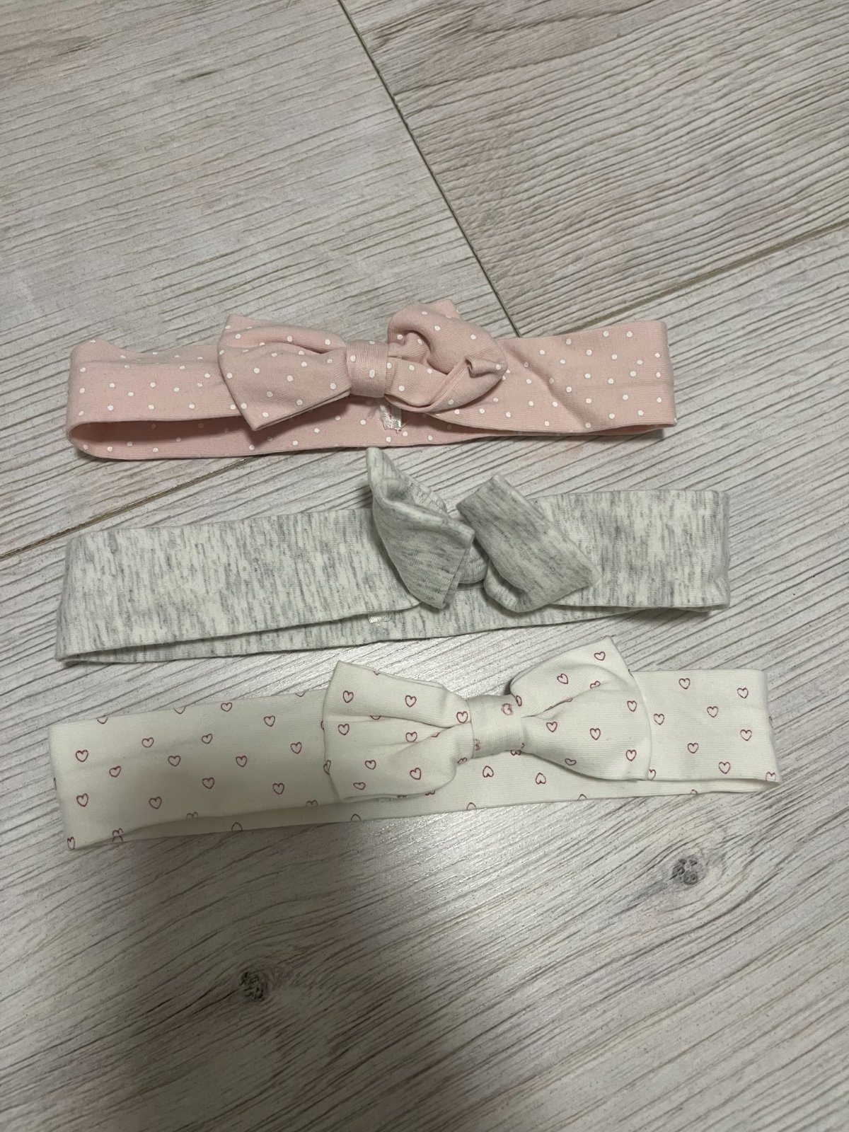 Predám trojbalenie užších čeleniek s mašľou (bledosivá/ružová s bodkami/biela so srdiečkami), veľkosť: cca 3 mesiace