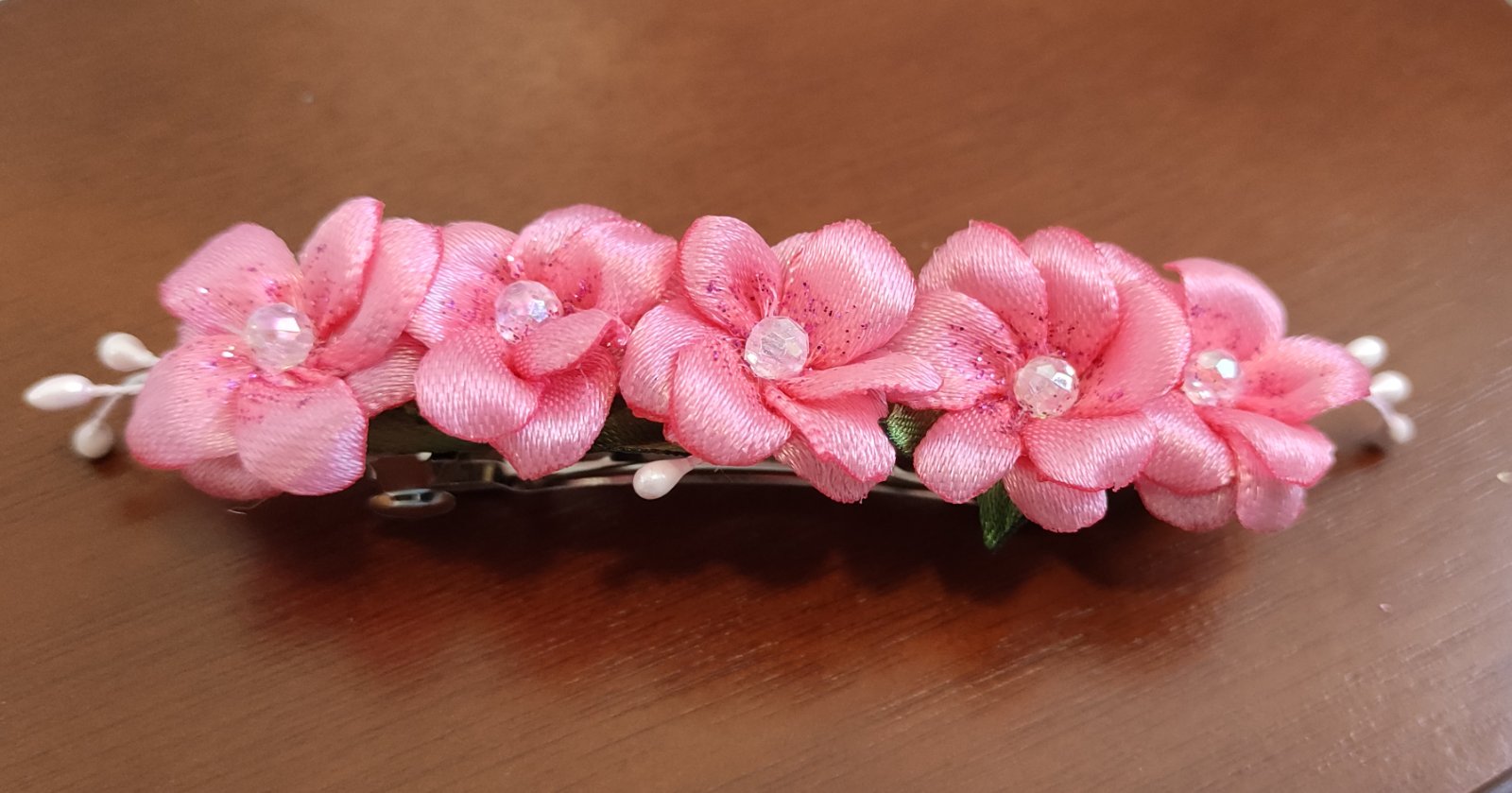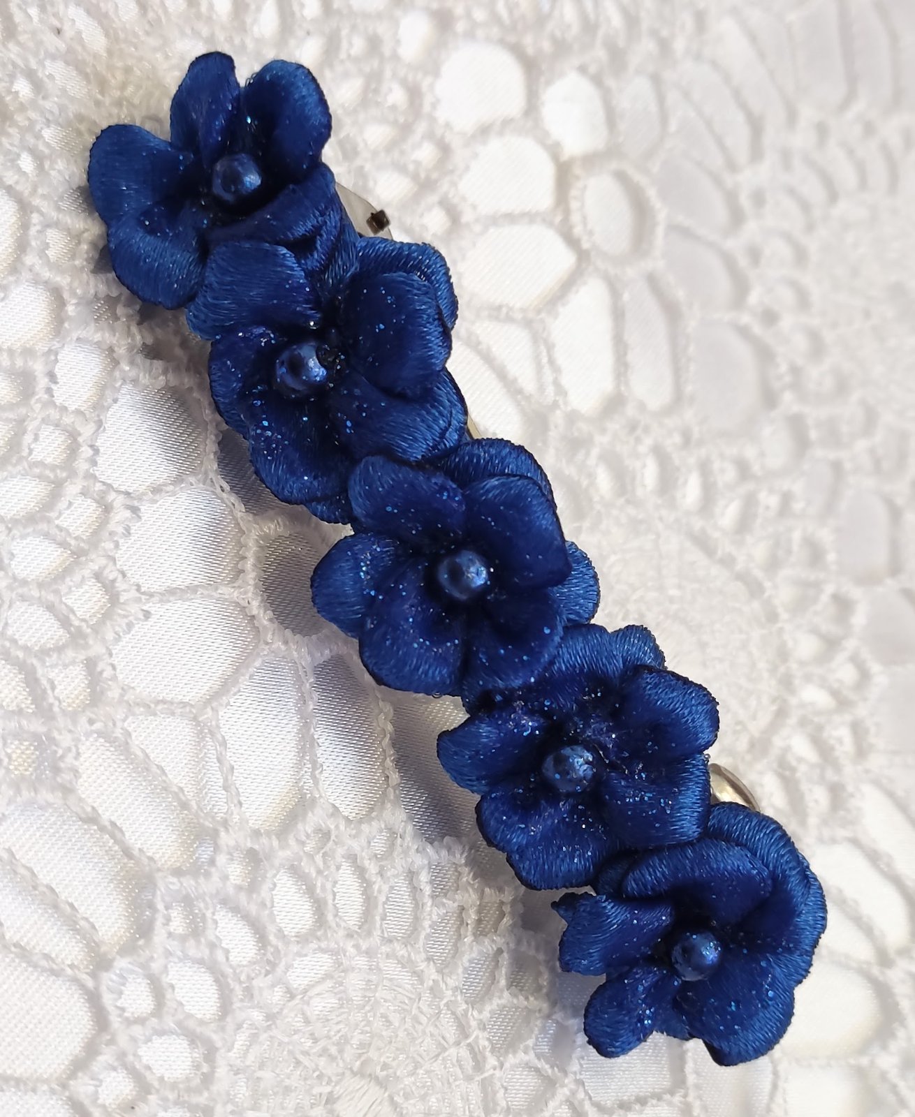 Každý kvet je doplnený trblietkami a ligotavou korálkou a uprostred, ktorá dodáva jemný lesk a eleganciu.