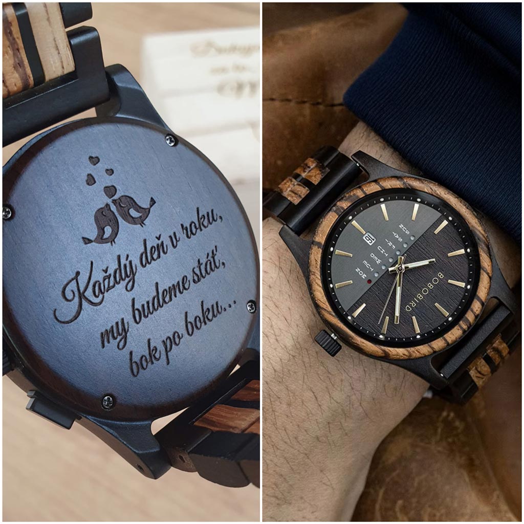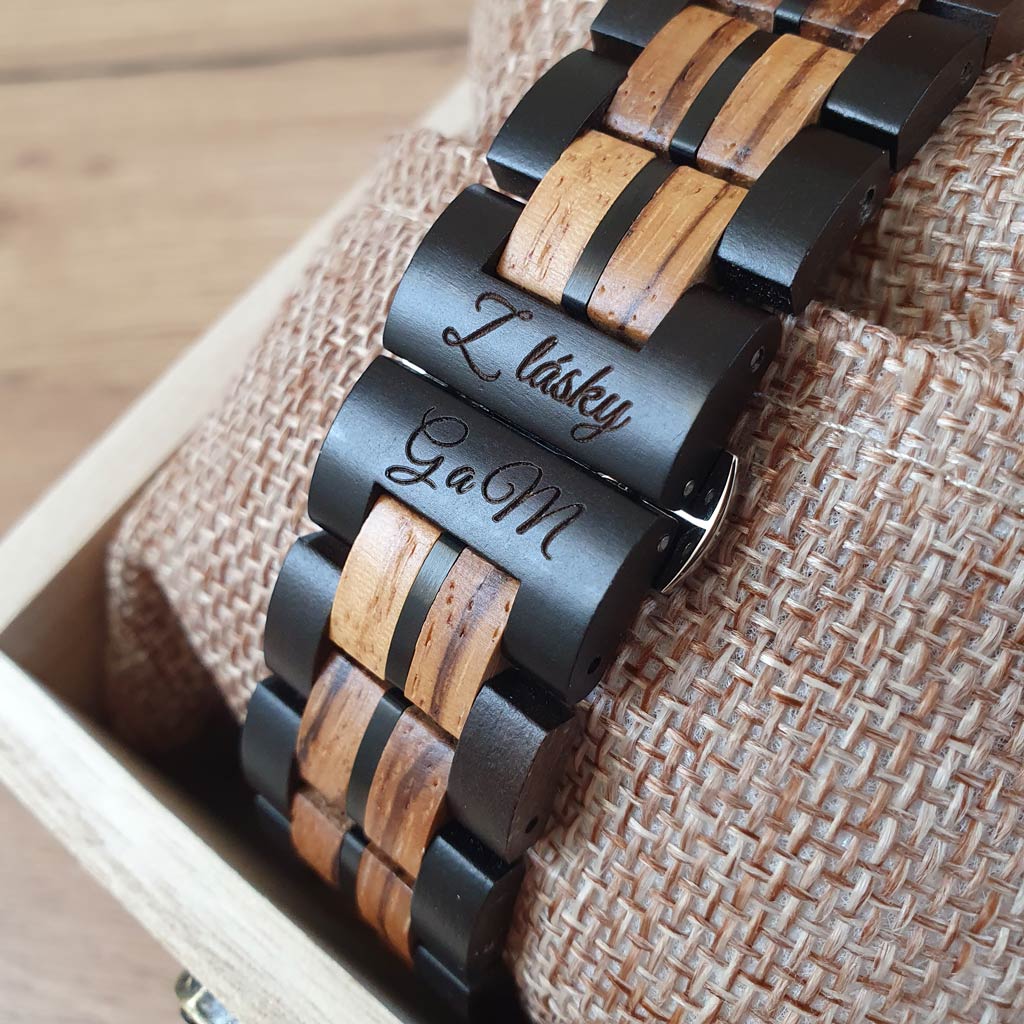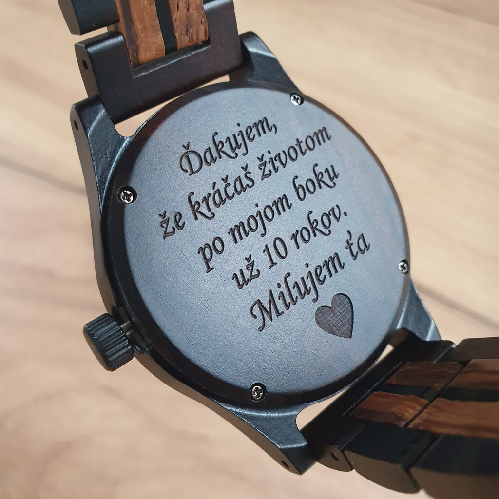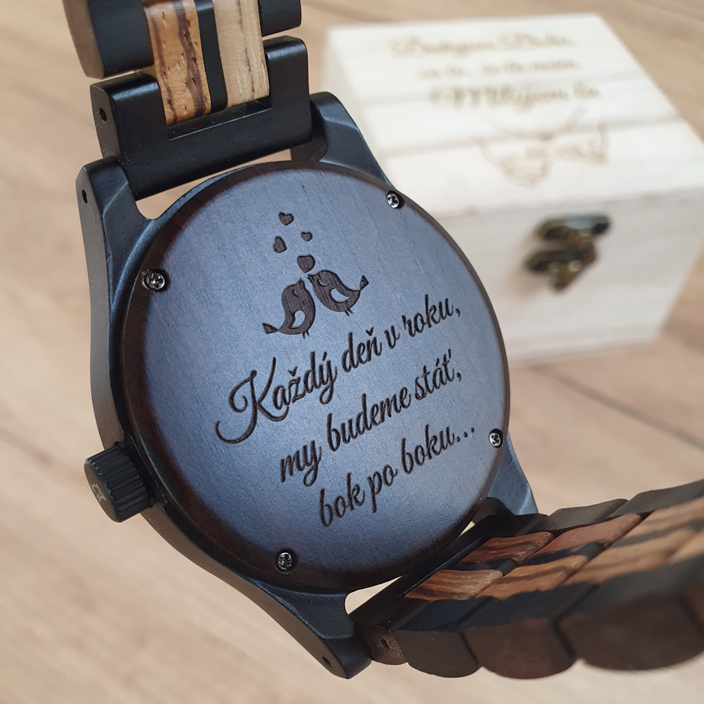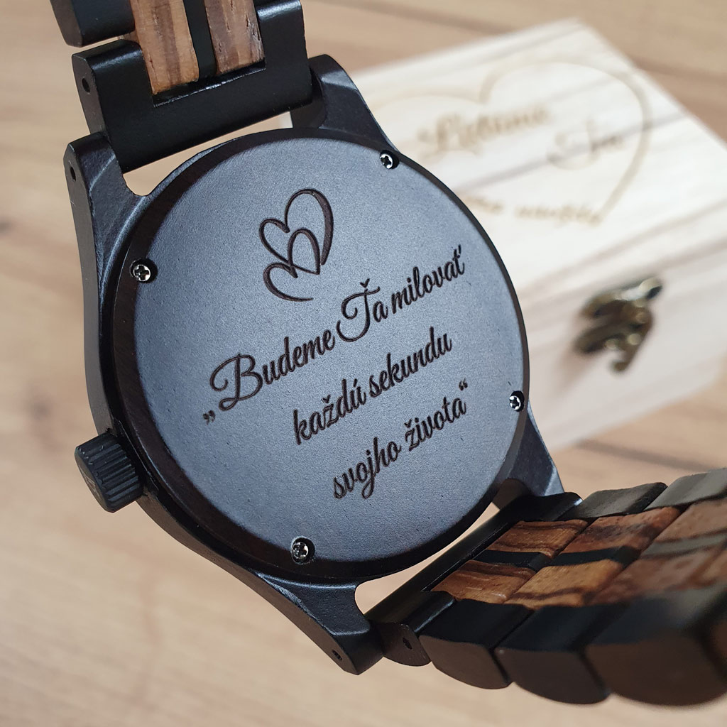 Na hodinky si môžete pridať vlastné venovanie (text a motív) ktorý vám vygravírujeme podľa vášho želania: na zadnú stranu hodiniek, remienok a drevenú krabičku.