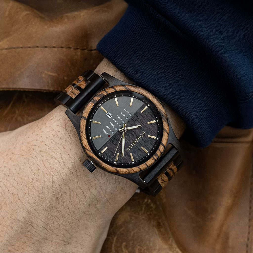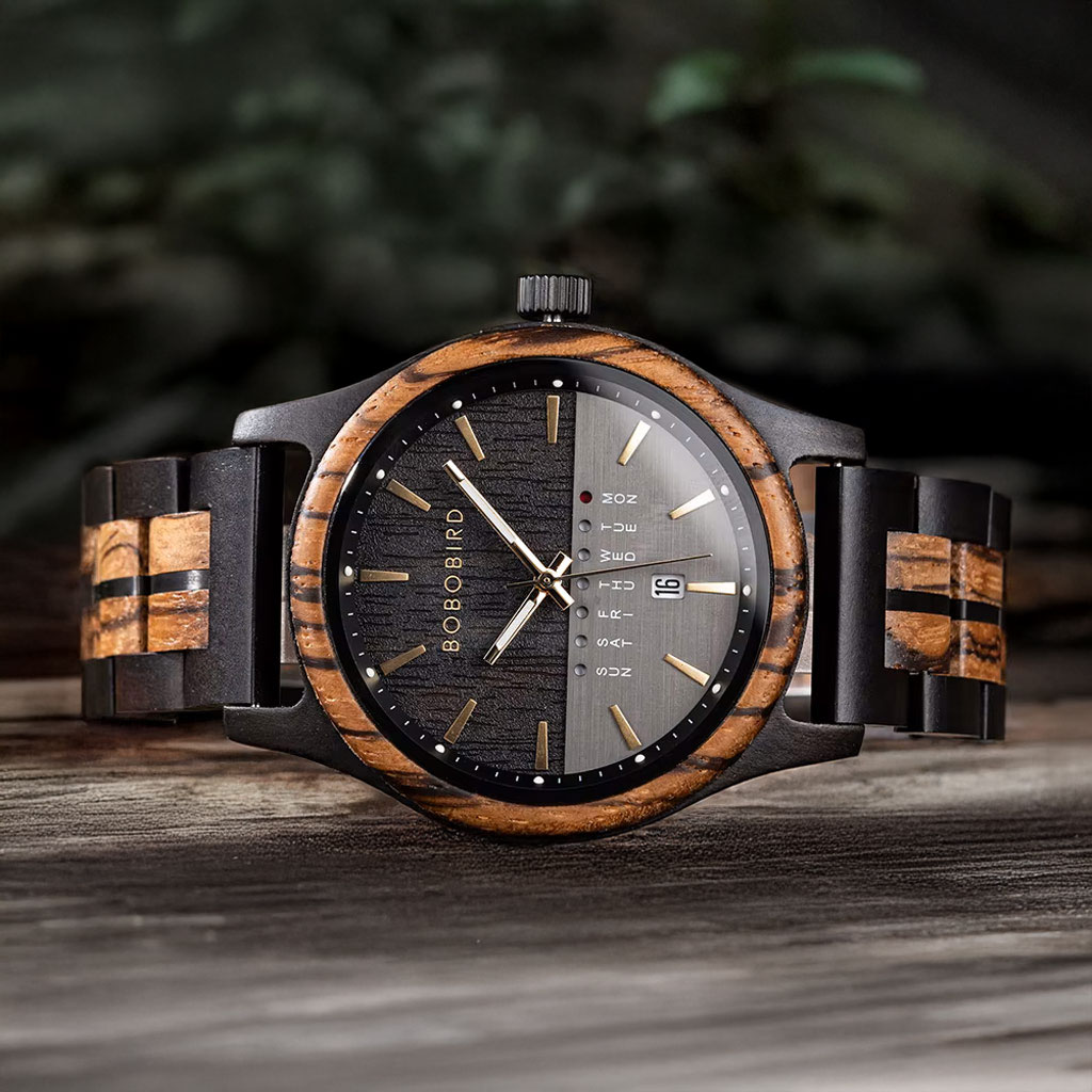 sa vďaka svojmu nadčasovému dizajnu stanú obľúbeným pánskym doplnkom, ktorý doladí k dokonalosti každý elegantný aj športový outfit. Hodinky sú vyrobené z exkluzívnej kombinácie ebenového a zebrového dreva. Prehľadný ciferník ponúka funkciu zobrazenia dátumu aj dňa v týždni, vďaka čomu sú hodinky nielen štýlové, ale aj praktické pre každodenné nosenie. Ručičky a indexy zobrazovania času sú luminiscenčné (fosforové) pre lepšiu viditeľnosť v tme.
