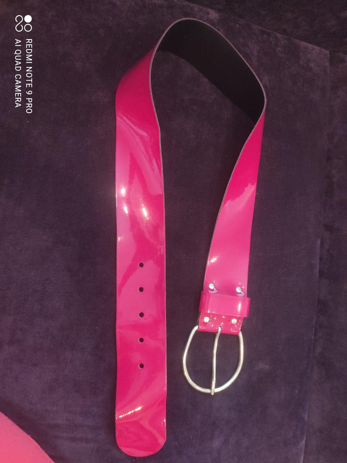 Kožený opasok ružovej farby, lakovaná koža, zlata pracka,uplne top stav!! 90 cm velkost, prava koža Made in italy K nakupu kozmetika zadarmo