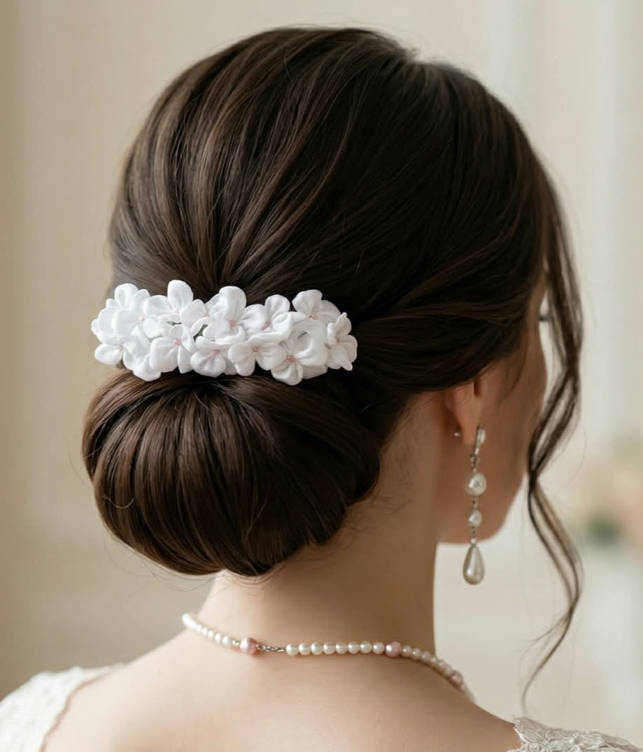 Jemná francúzska sponka do vlasov je ozdobená pôvabnými bielymi saténovými kvietkami, ktoré dopĺňajú ružové korálky v strede.