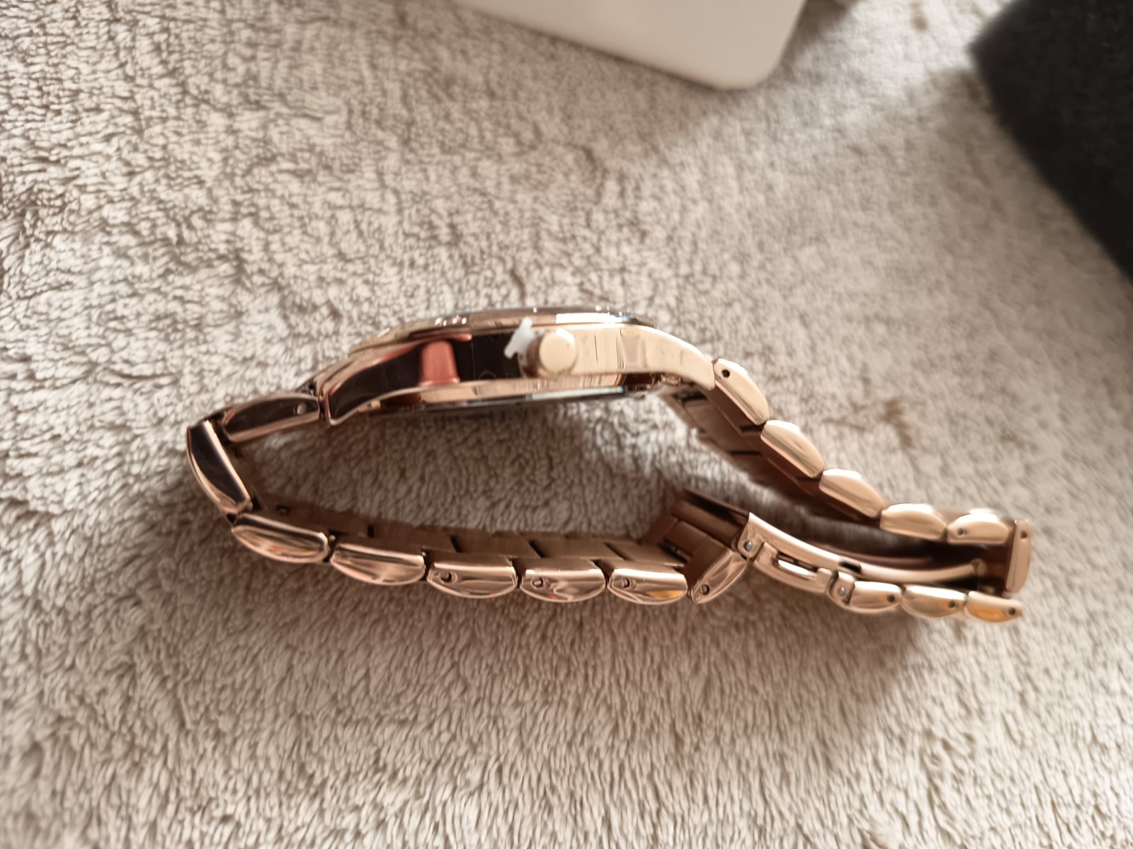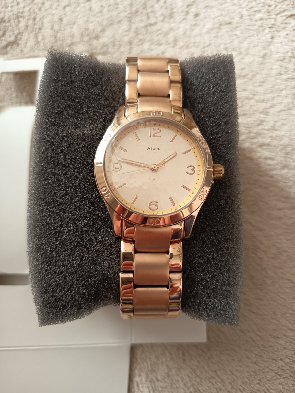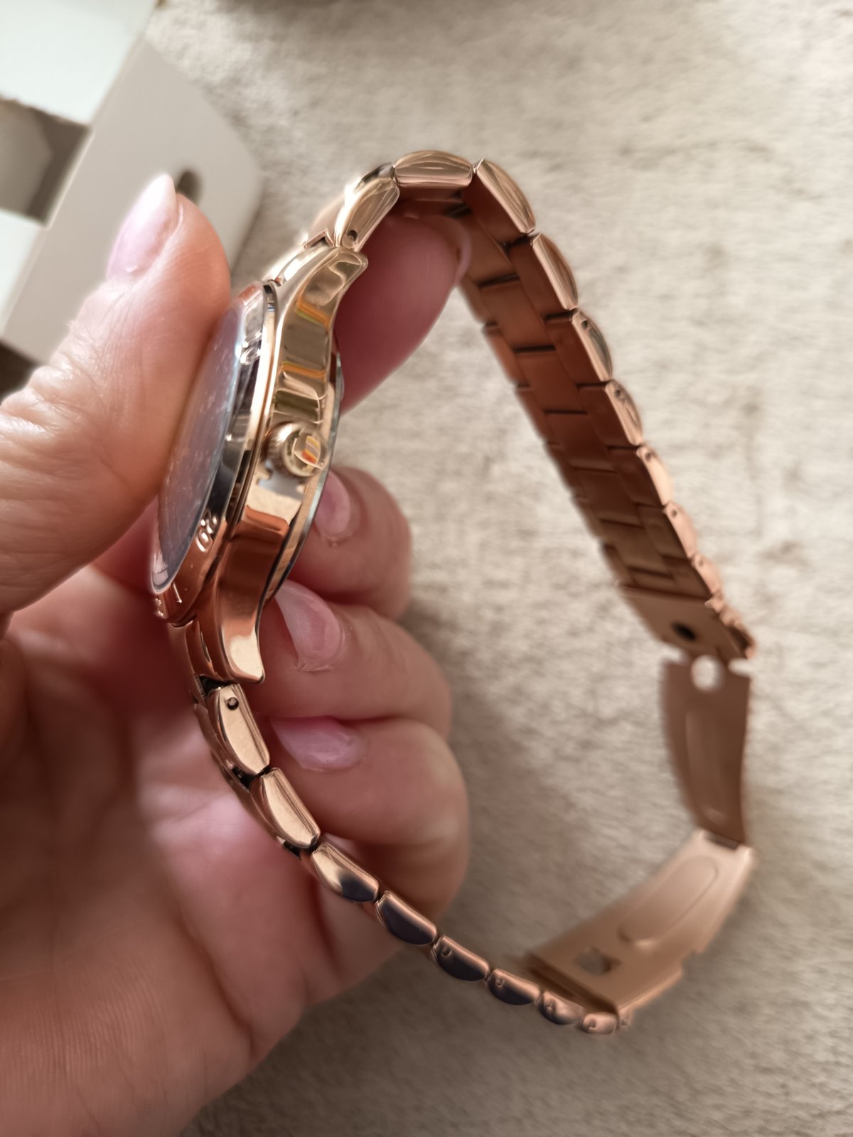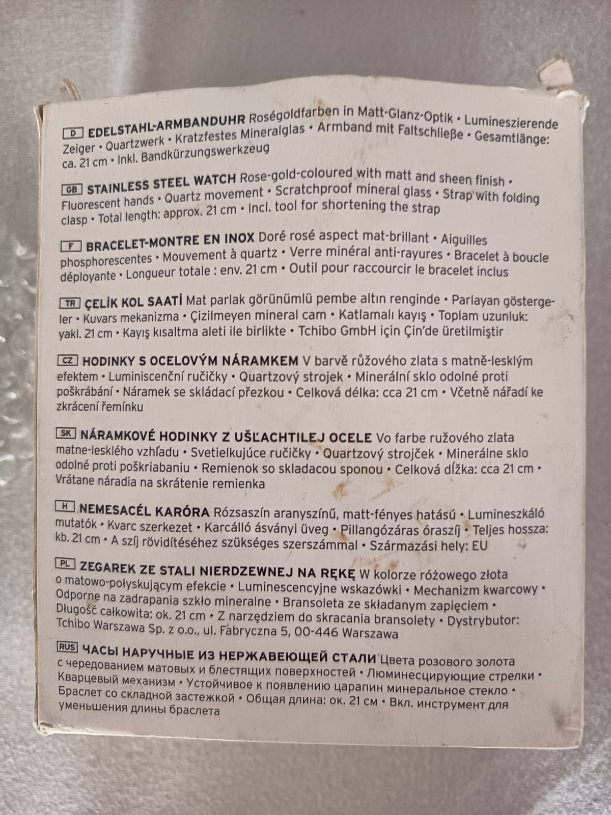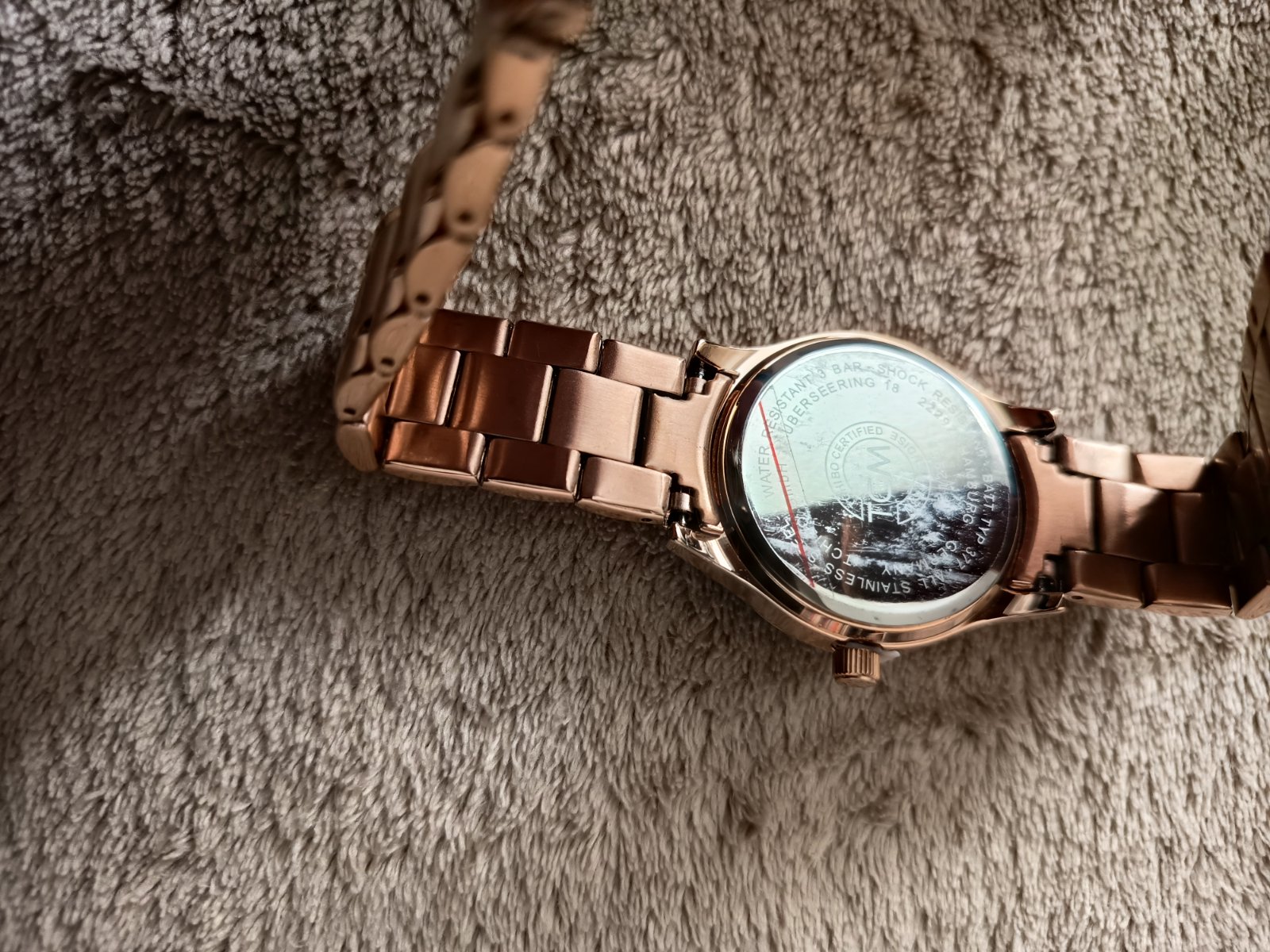 Nové náramkové hodinky Tchibo z ušľachtilej ocele vo farbe ružového zlata matne-lesklého vzhladu so svietielkujucimi ručičkami.