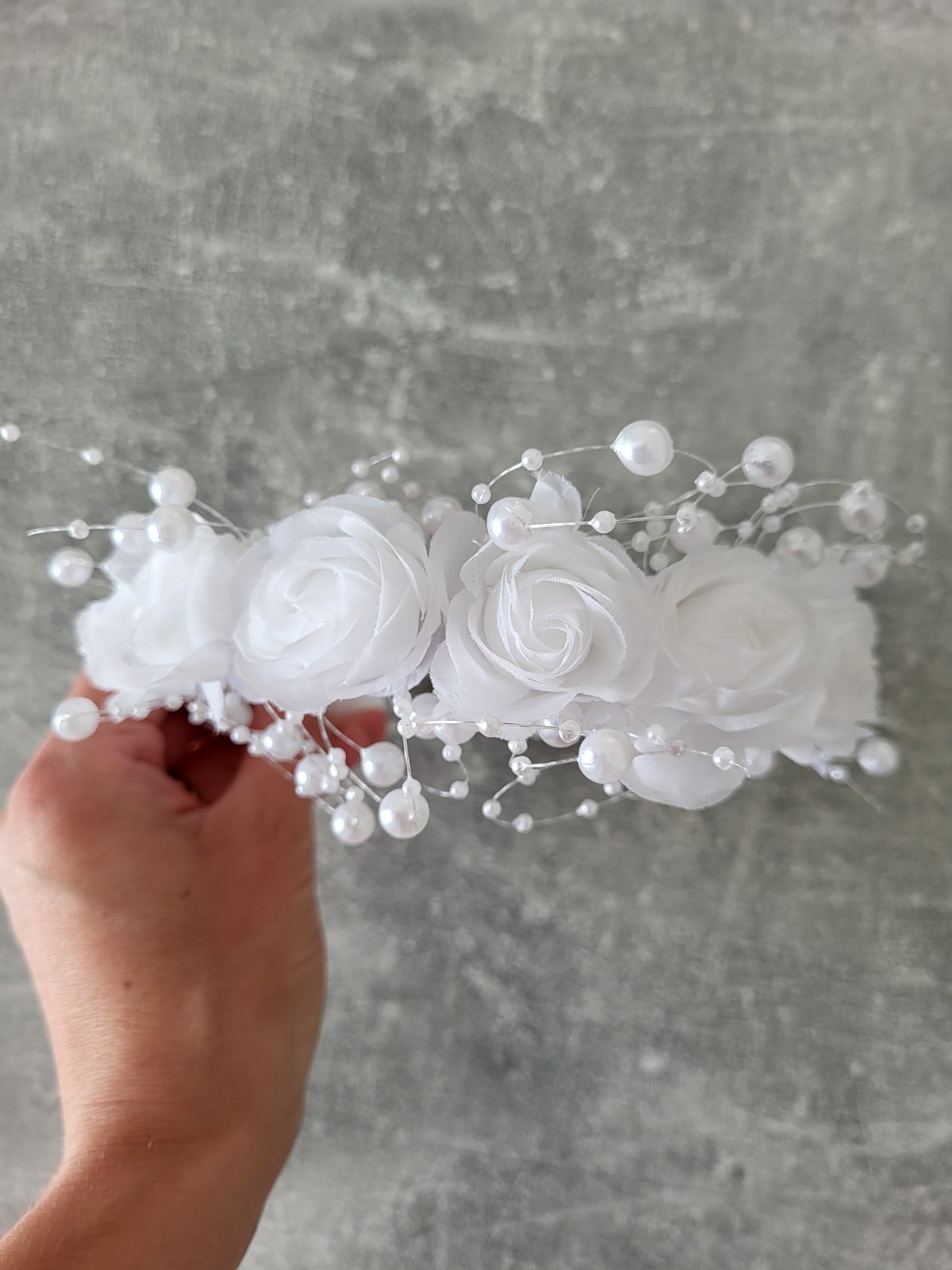 Predam svadobnu ohybnu drotenu celenku zdobenu bielo-kremovymi kvietkami, bielymi priesvitnymi kristalikmi a kremovymi perlami.K tomu 5 vlaseniek rovnakeho typu. Raz pouzite. Povodna cena celenka ...