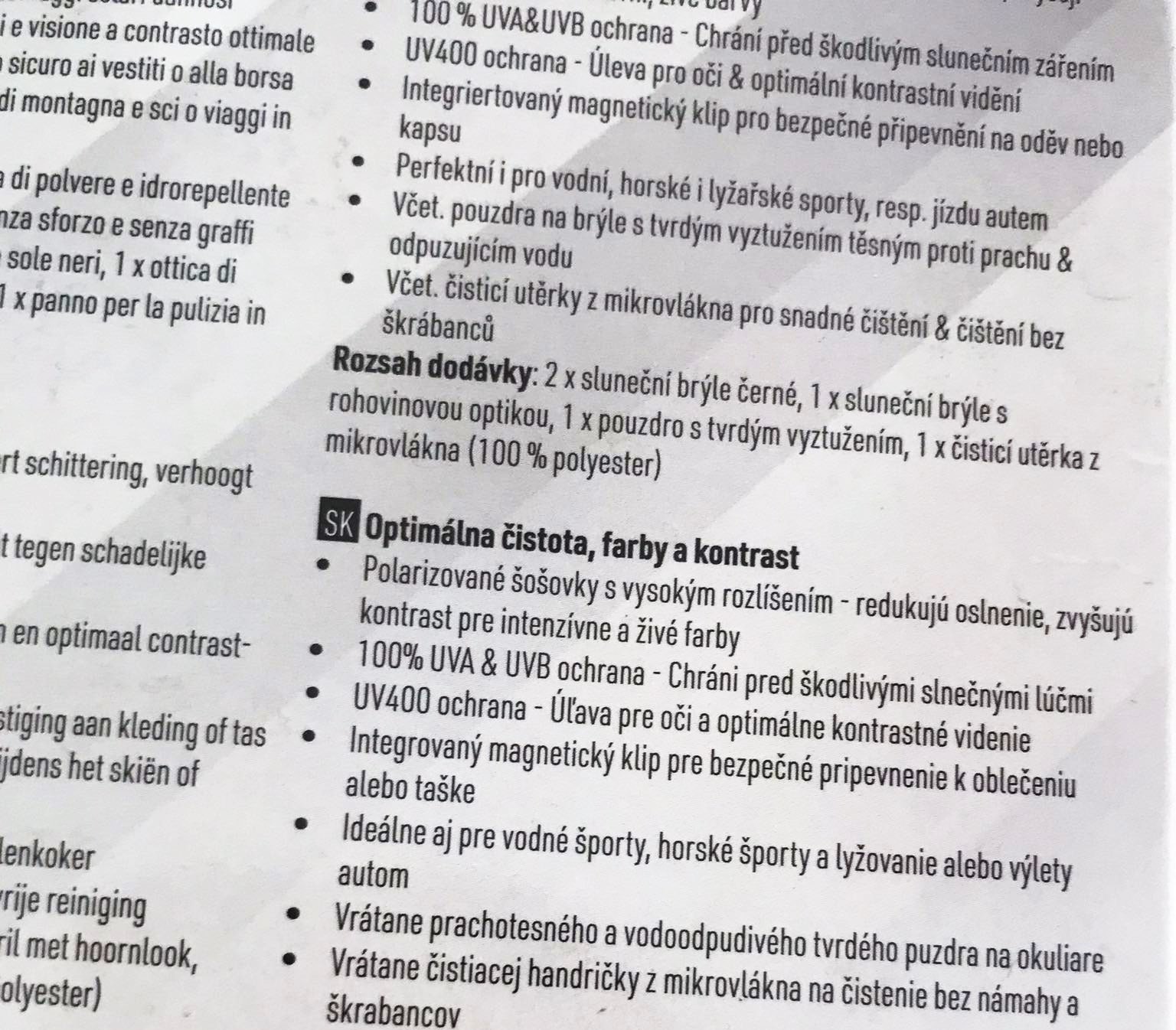 kvalitné min. nosené slnečné okuliare s polarizačným filtrom,ktorý eliminuje svetelné odrazy od lesklých povrchov a umožňuje tak lepšie pozorovacie schopnosti,polarizované šošovky s vysokým rozlíšením - redukujú oslnenie, zvyšujú kontrast pre intenzívne a živé farby,100% UVA & UVB ochrana,sú vyhľadávané najmä priaznivcami rybolovu. Rybári vďaka polarizačným šošovkám môžu vidieť pod hladinu. Ako to funguje? Okuliare "odfiltrujú" odlesk oblohy z hladiny a umožnia tak vidieť pod ňu. Okuliare s polarizačným filtrom sú tiež ideálnou voľbou pre vodičov. Vďaka eliminácií svetelných odleskov znižujú námahu a tým pádom aj únavu zraku. Zlepšujú kontrast pozorovaných objektov a umožňujú skoršie rozpoznanie prípadného nebezpečenstva,100% UV filter.Na rúčkach magnetky aby sa neroztvárali.