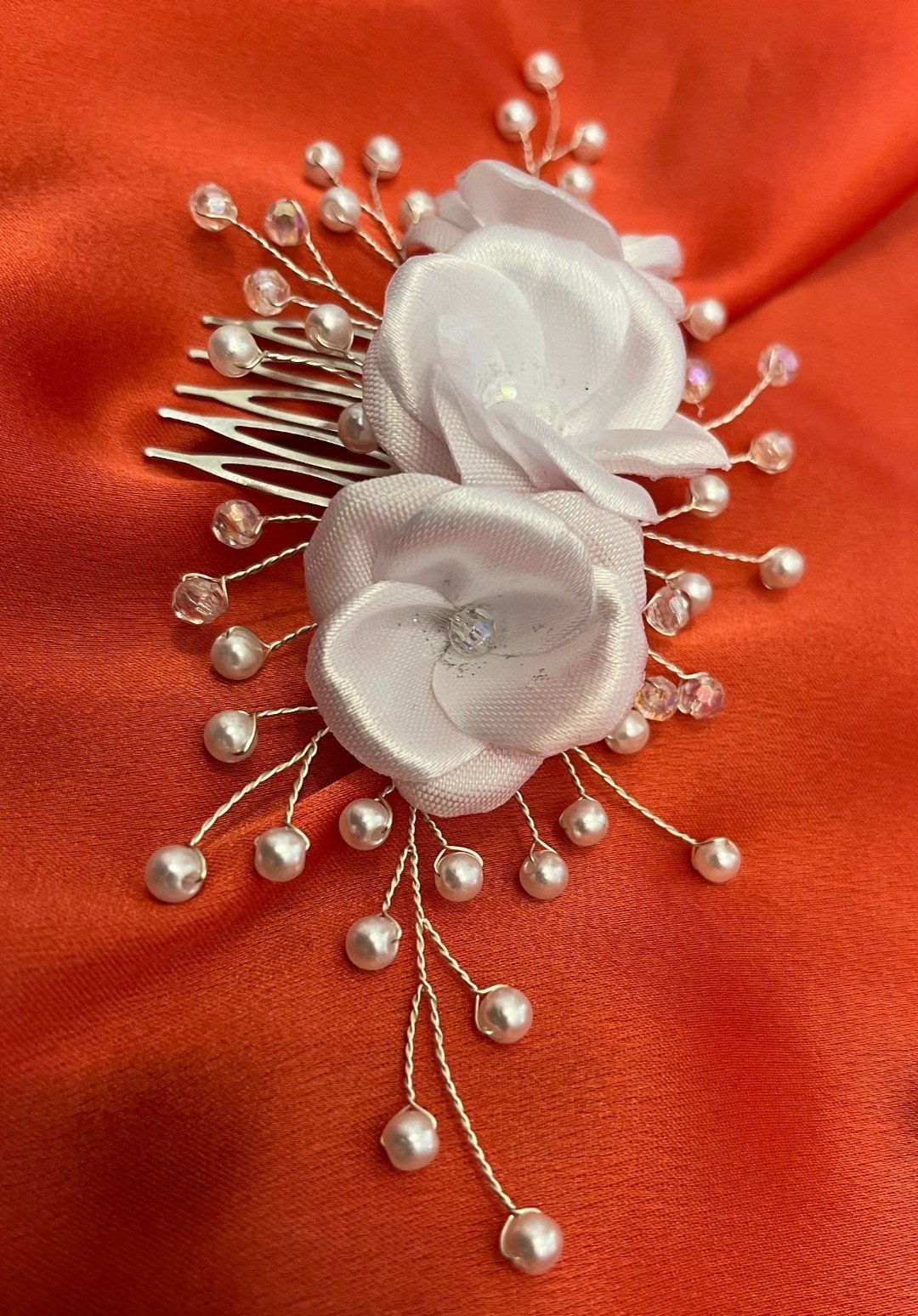 Tri saténové kamélie v snehobielej farbe sú zdobené perličkami a trblietavými korálkami, ktoré dodávajú ozdobe luxusný nádych.