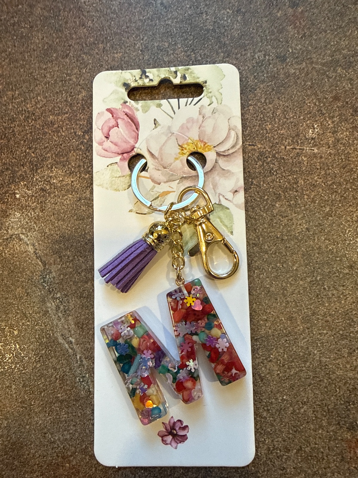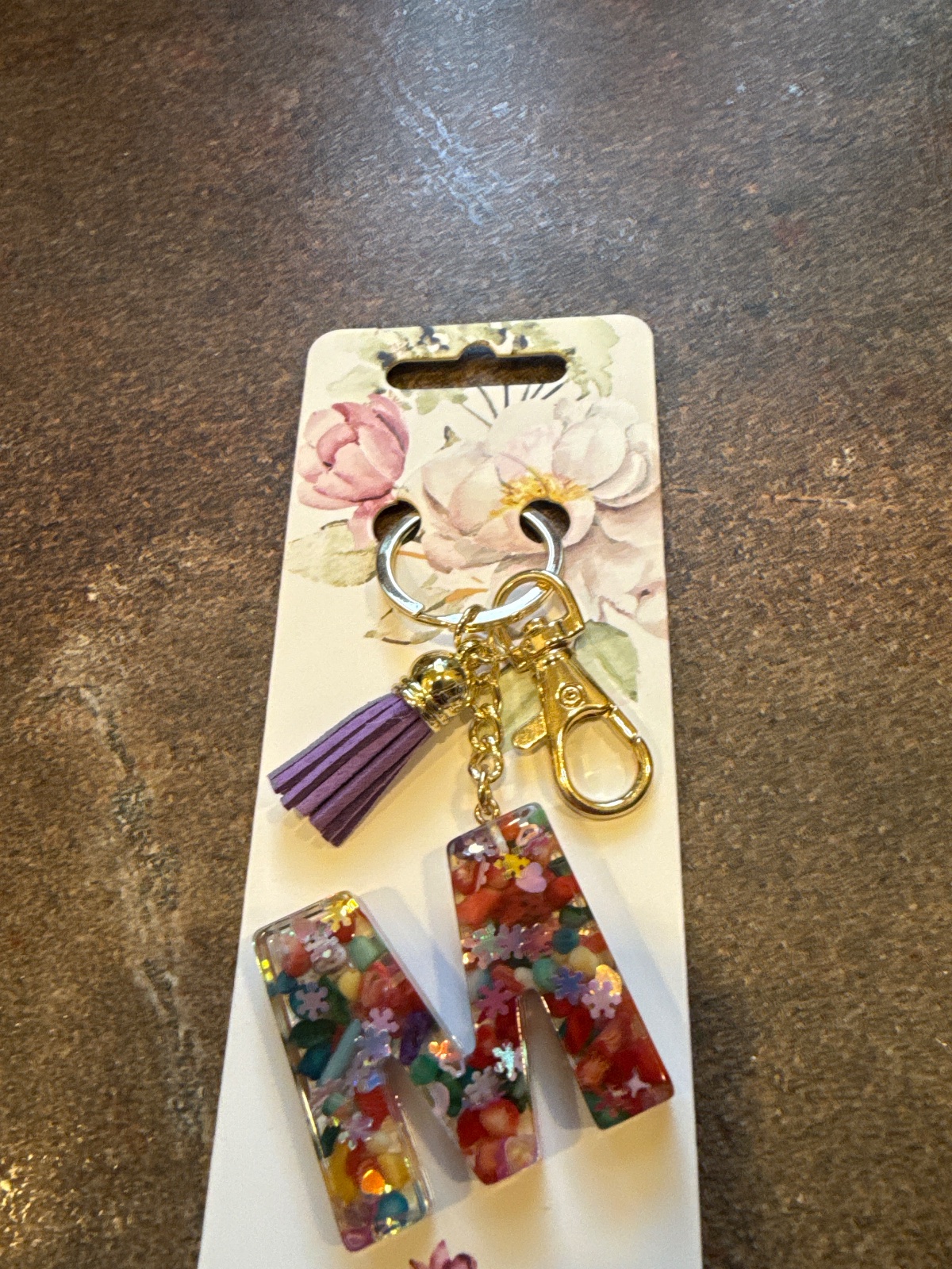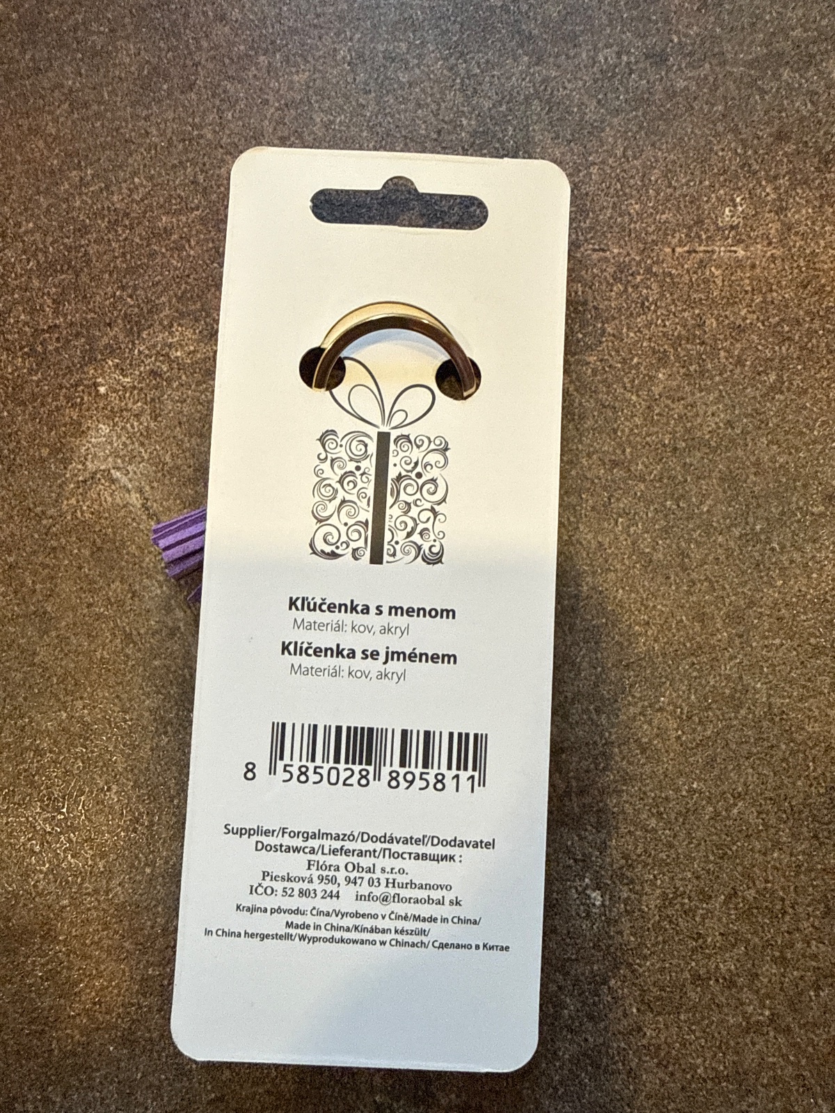 Predám krásnu dámsku kľúčenku s akrylovým príveskom v tvare písmena M. Vnútri sú zapustené drobné farebné kvietky a ozdoby, čo vytvára jemný a romantický efekt. Súčasťou je aj zlaté kovanie a dekoratívny fialový strapček.