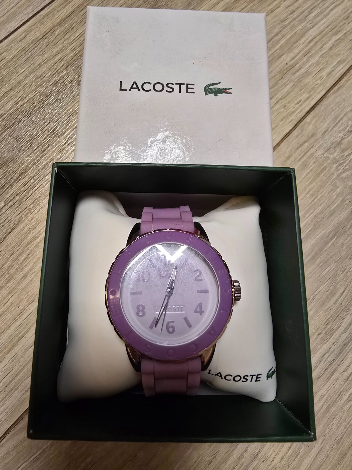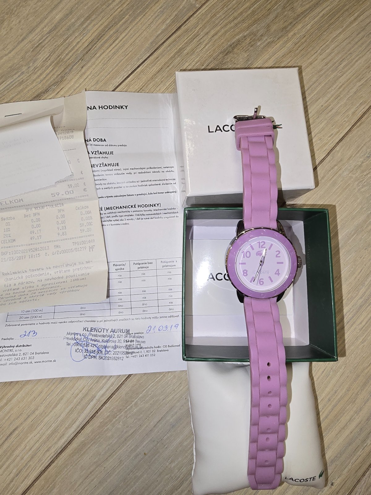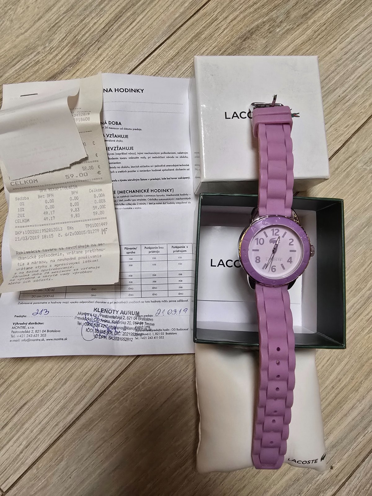 Športové hodinky Lacoste, kúpené v klenotníctve, pôvodná cena 59 eur. Sú originál, s bločkom. Silikónový remienok, treba vymeniť baterku. Možný osobný odber v TT.