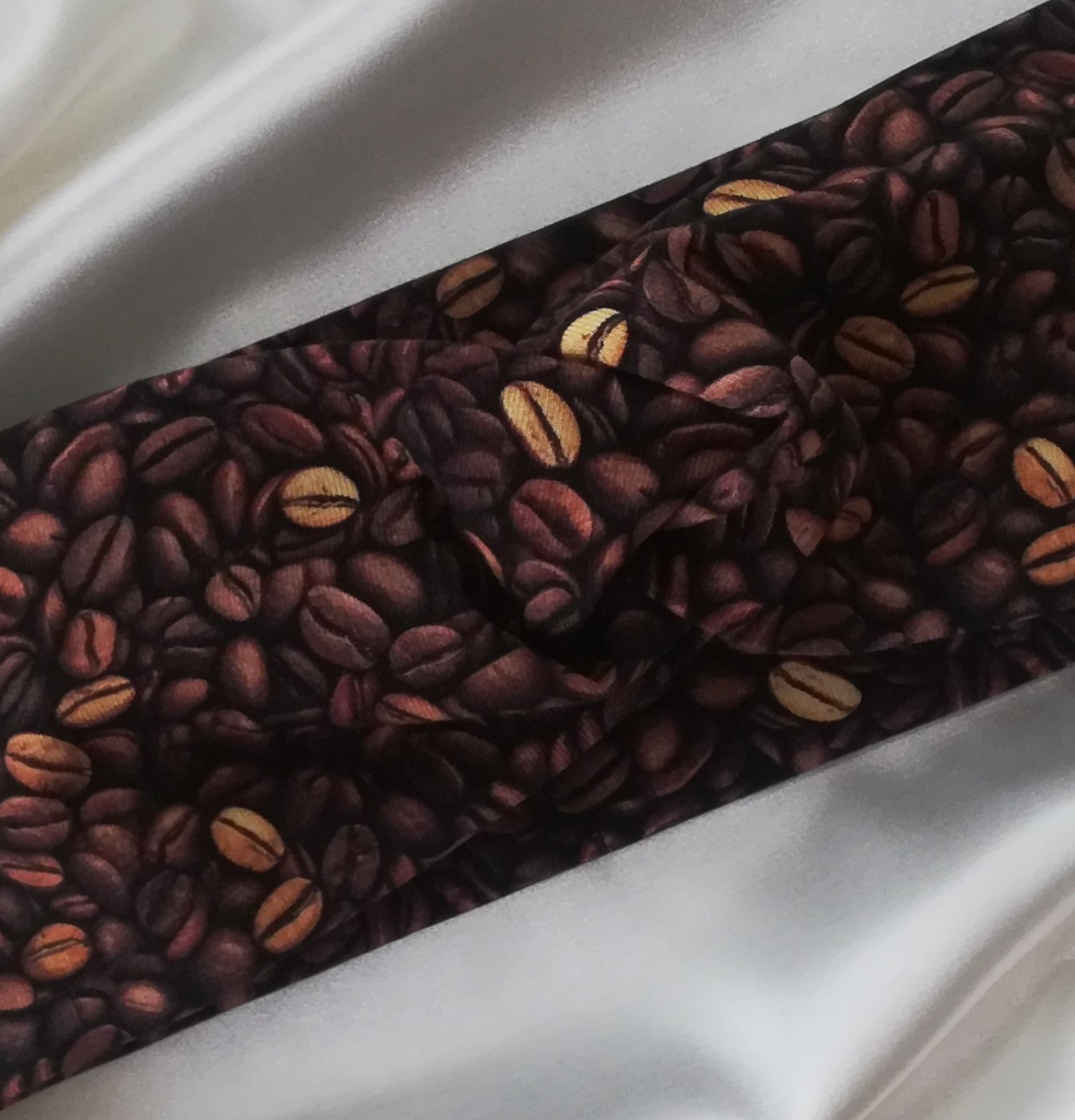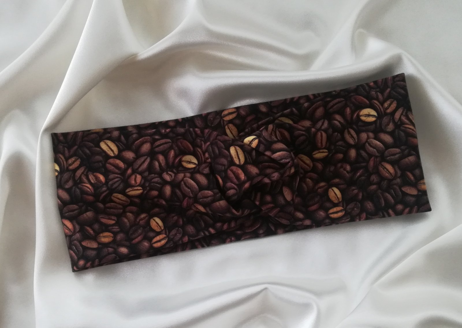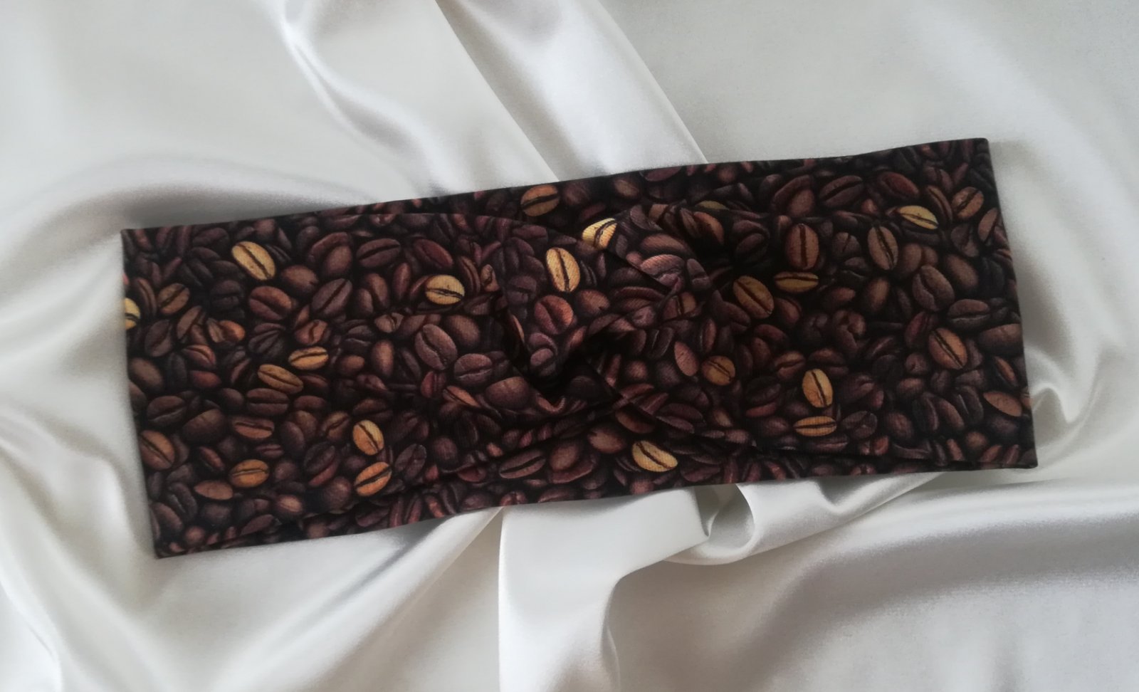 Nenosená twist/vpredu prekrížená čelenka z nádherného dizajnérského úpletu, kávové zrná na hnedom- I love coffee