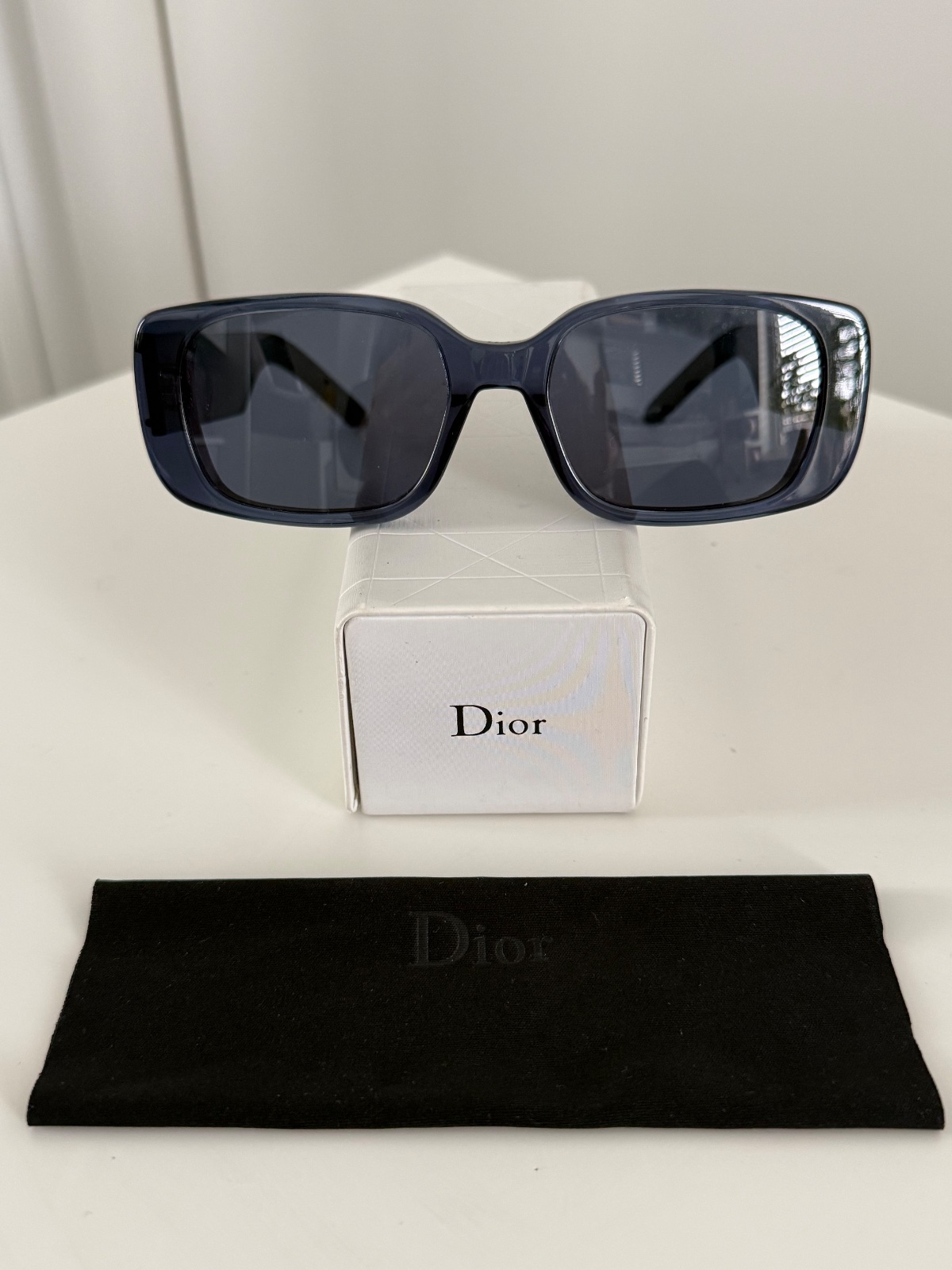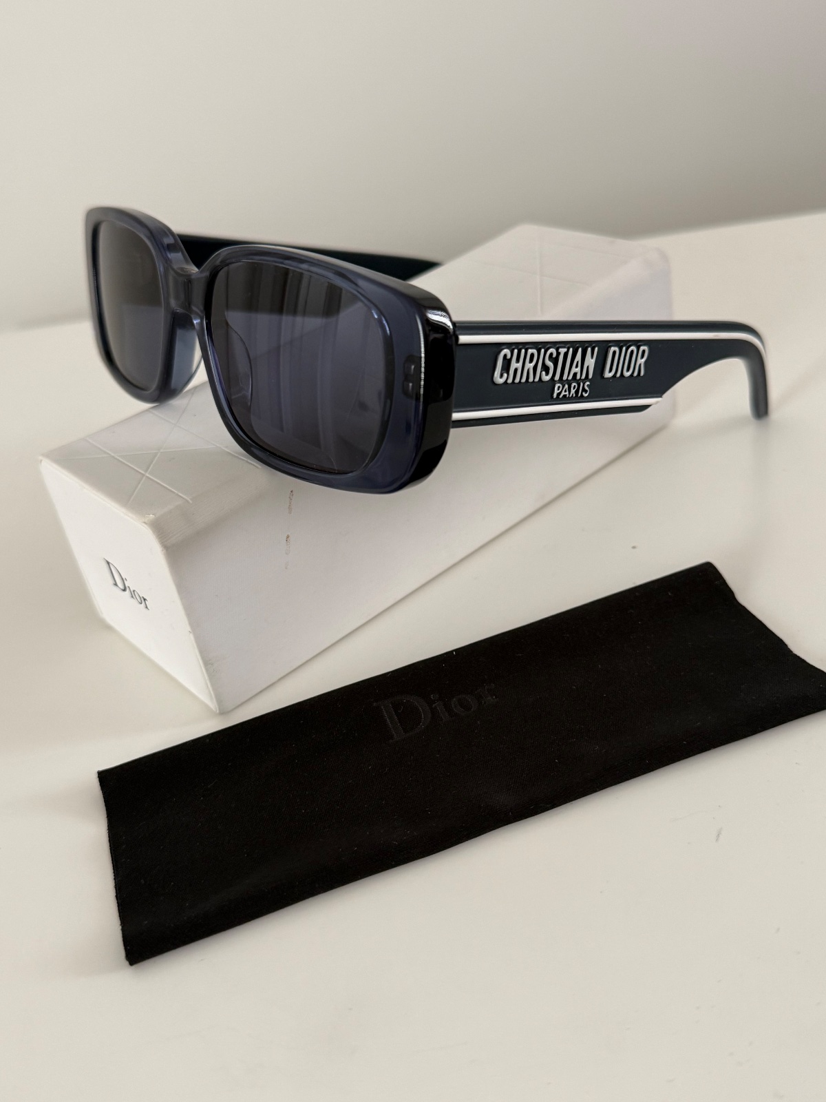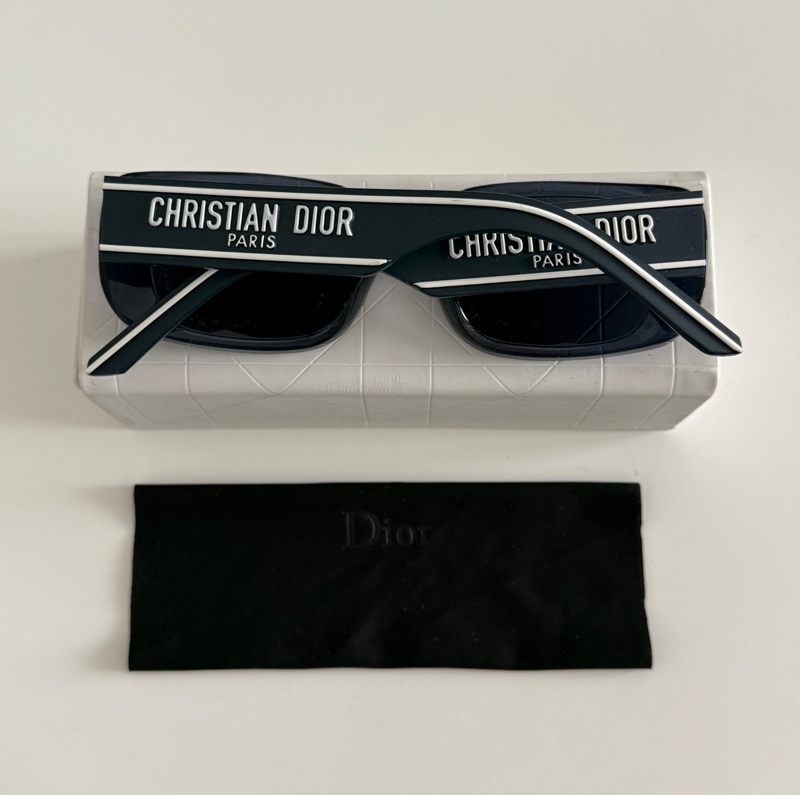 Ikonické slnečné okuliare Dior Wildior S2U v tmavomodrej farbe. Tento model sa vyznačuje moderným, nízkym obdĺžnikovým tvarom a masívnym acetátovým rámom. Dominantným prvkom sú široké stranice s kontrastným bielym nápisom „CHRISTIAN DIOR PARIS“ Super nosený stav, bez poškodenia. Puzdro+handrička Dior.