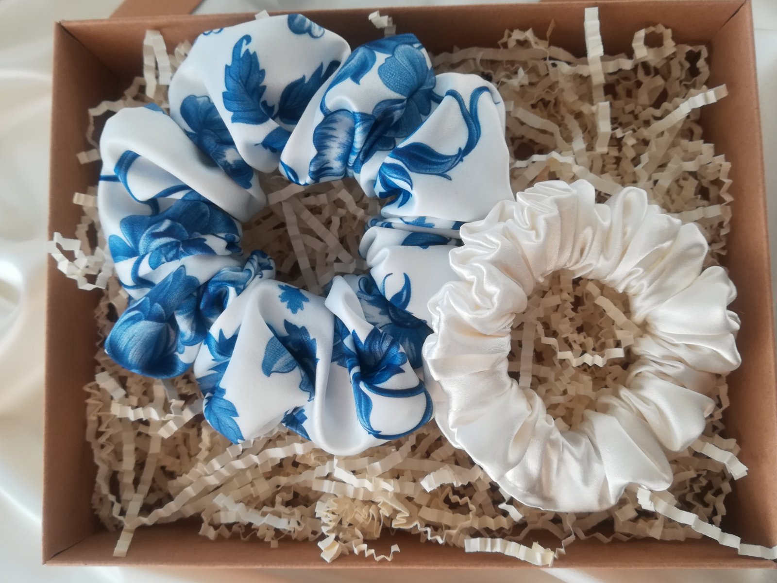 1 x saténovú gumičku, klasická veľkosť, vzorovaná- modré kvietky na bielom