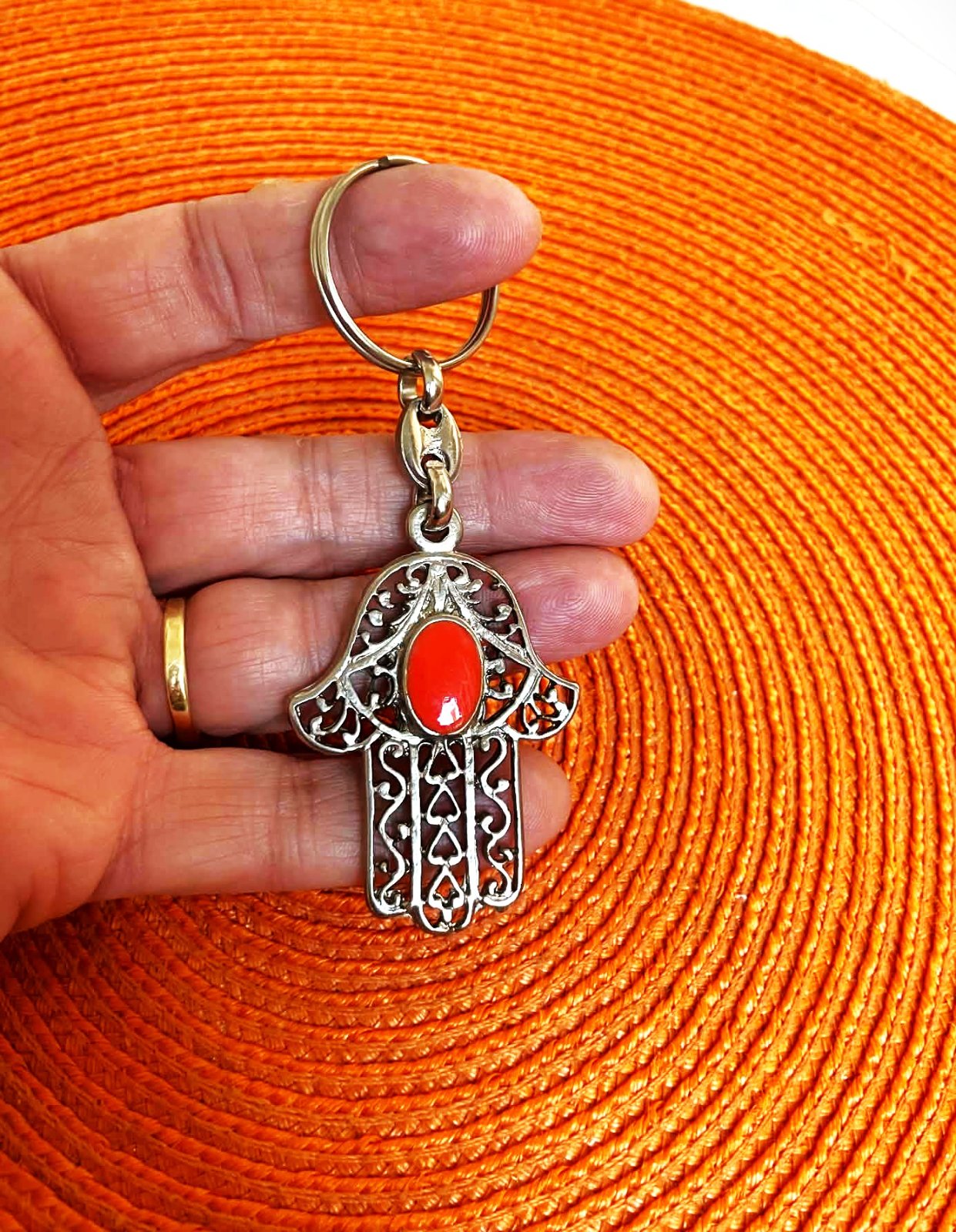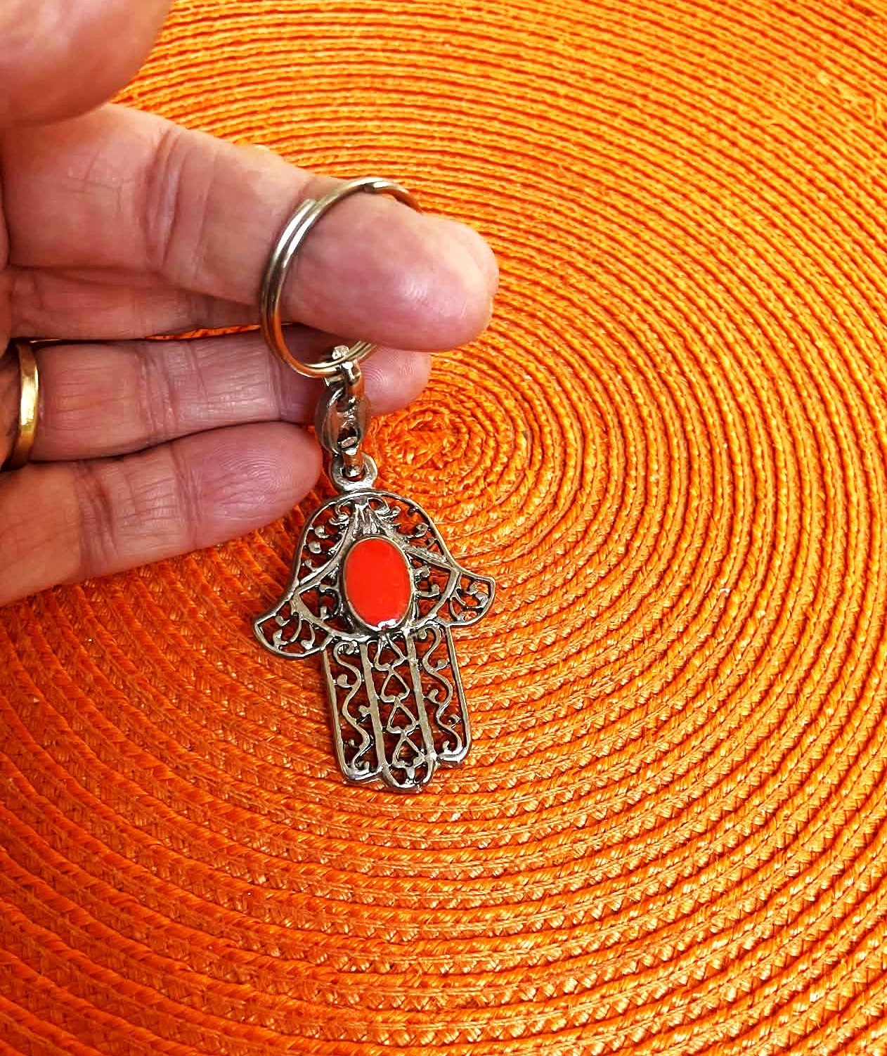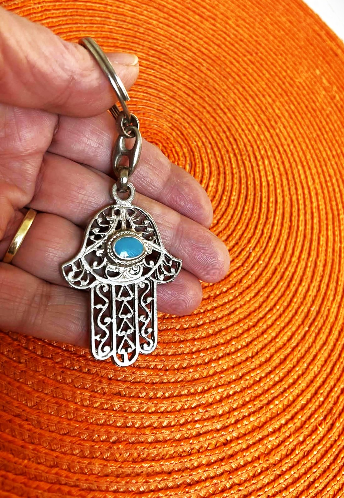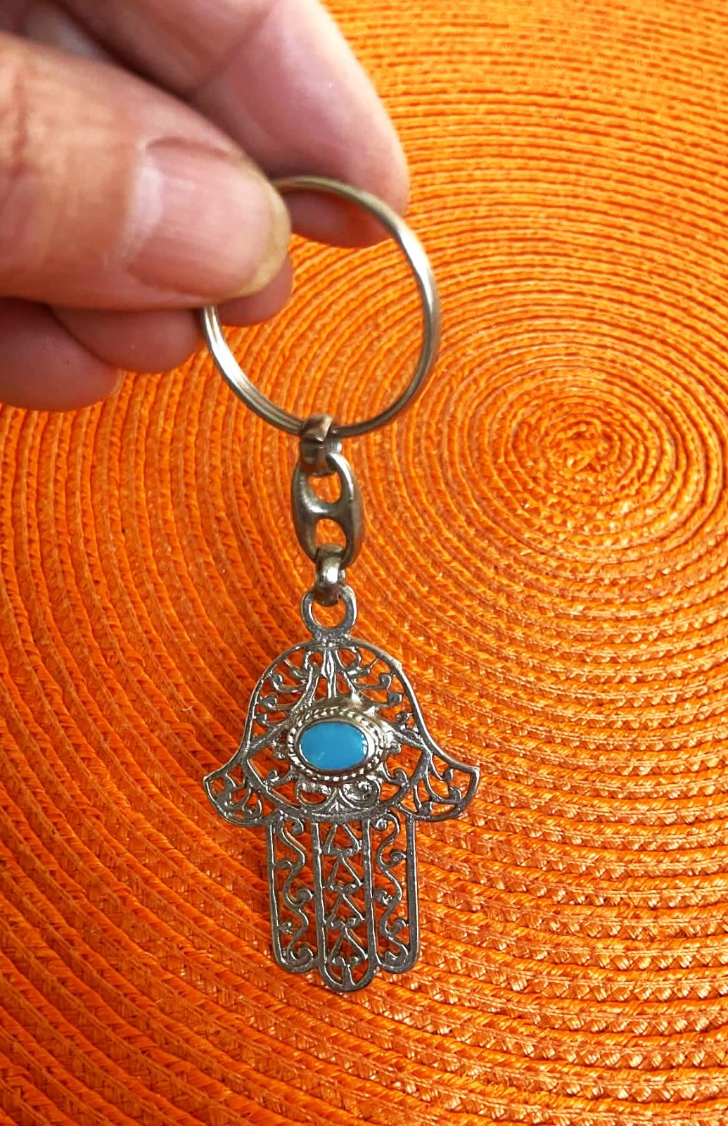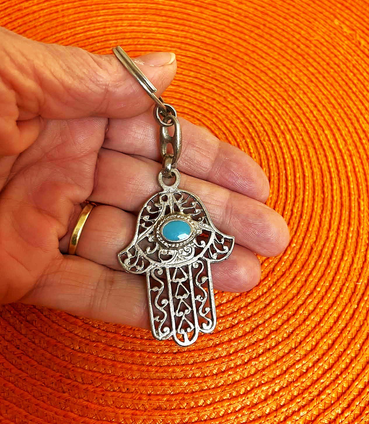 tepaný prívesok na kľúče s 1 x s tyrkysovým očkom a 1 x s koralovým očkom ,ručná práca,min.použitý,top stav,celková dlžka 10 cm, cena je za 1 ks