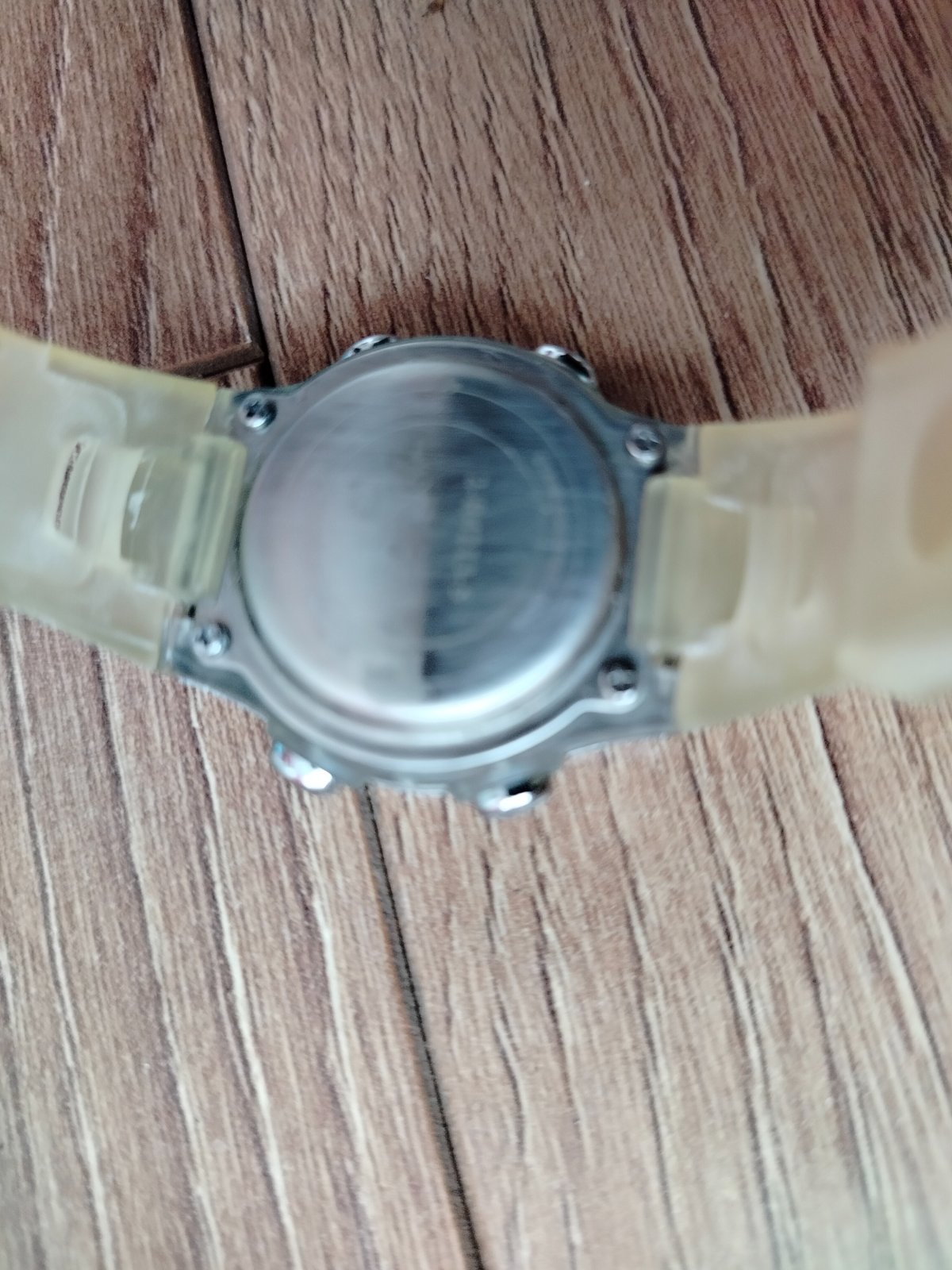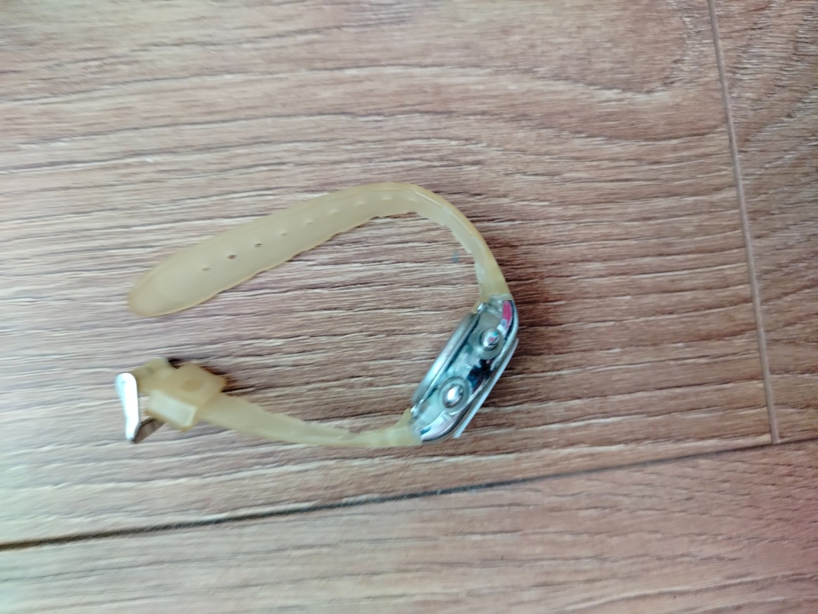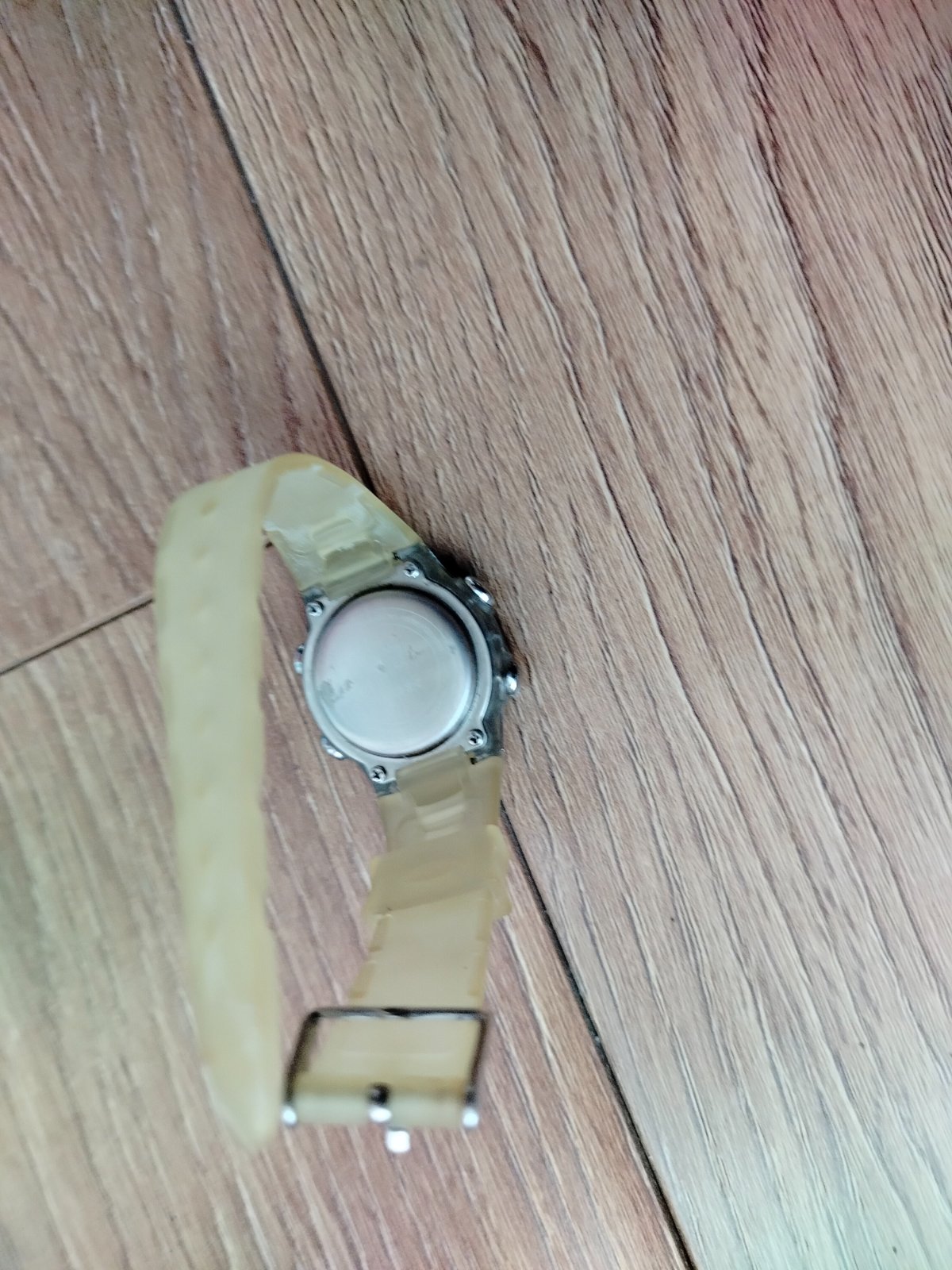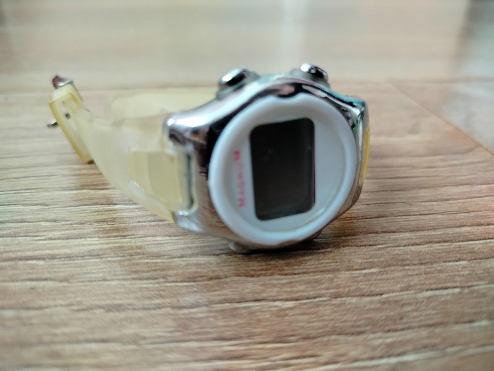 Puzdro: kov (chróm), okrúhly tvar, priemer 38mm. Ciferník: biely s LCD displejom, ružový nápis. Remienok: silikón/resin, priehľadný/žltkastý, dĺžka nastaviteľná, šírka cca 18 mm. Uzatváranie: kovová pracka