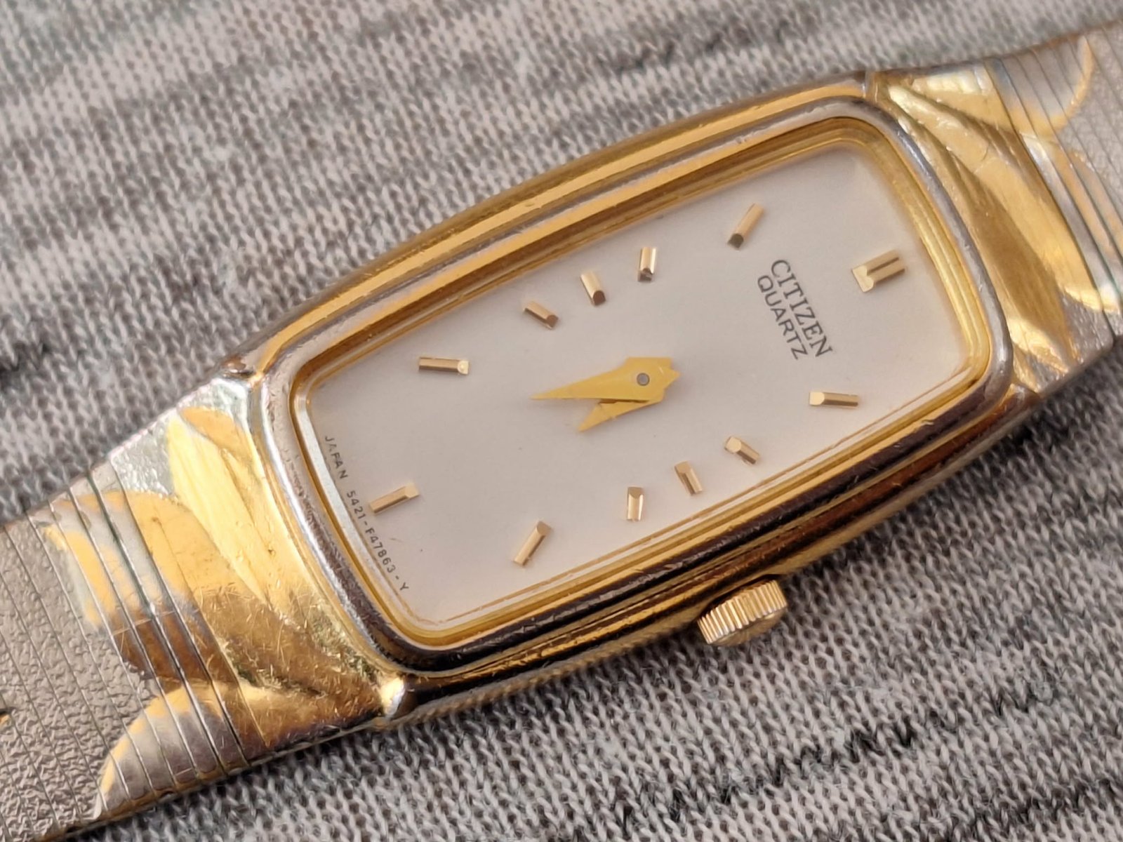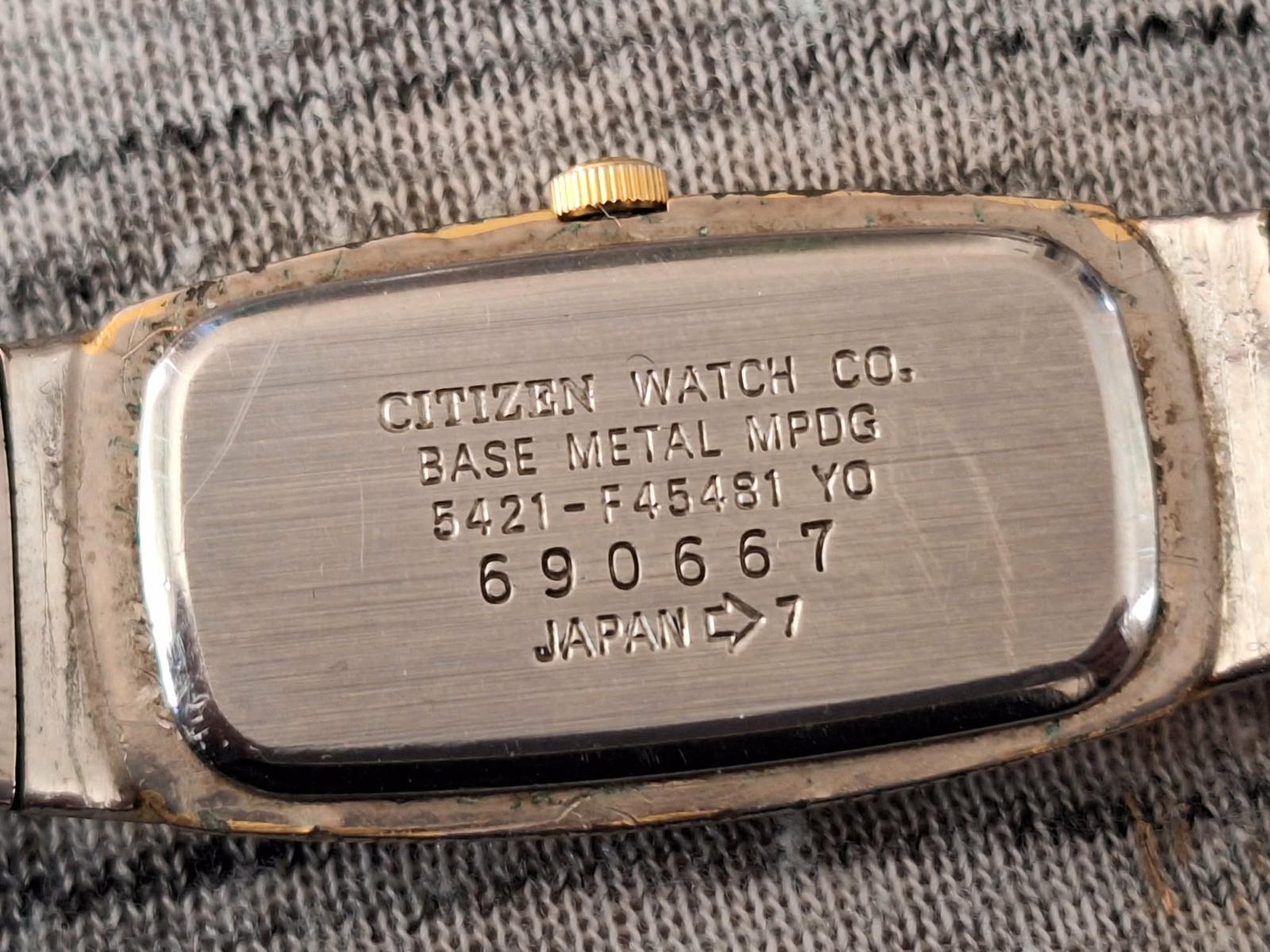 nosené pozlátené dámske hodinky Citizen, už trochu ošúchané zlaté lístky.