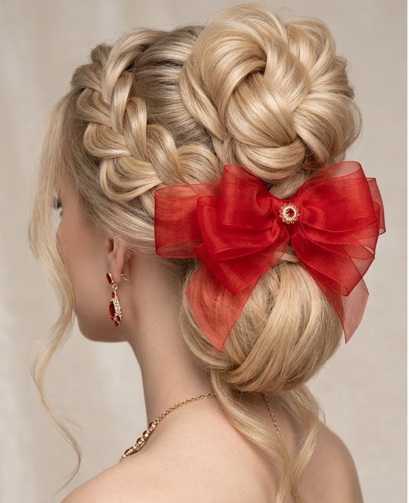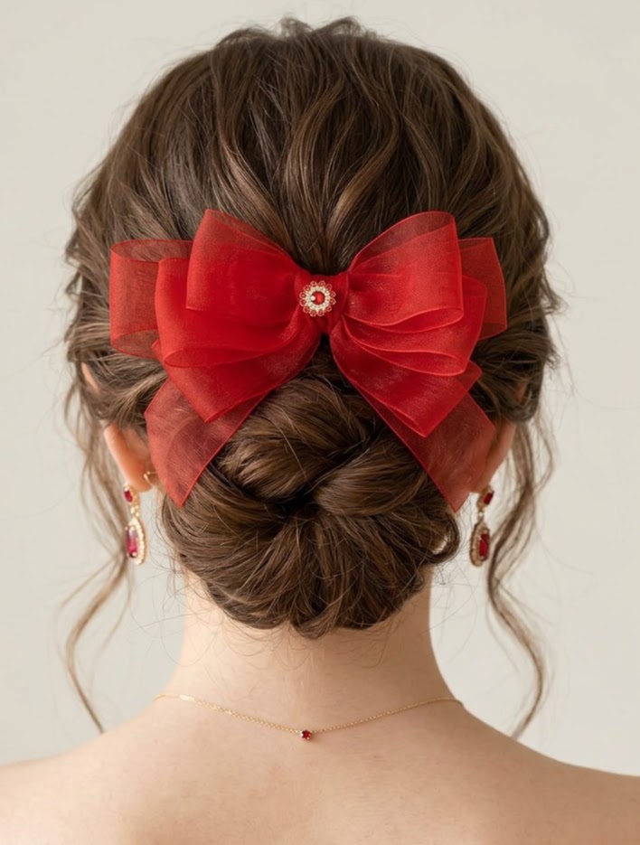 Mašľa vytvorená z jemnej organzy a doplnená o zdobený stred s červenými kamienkami dodá účesu nádych romantiky i slávnostnej noblesy.