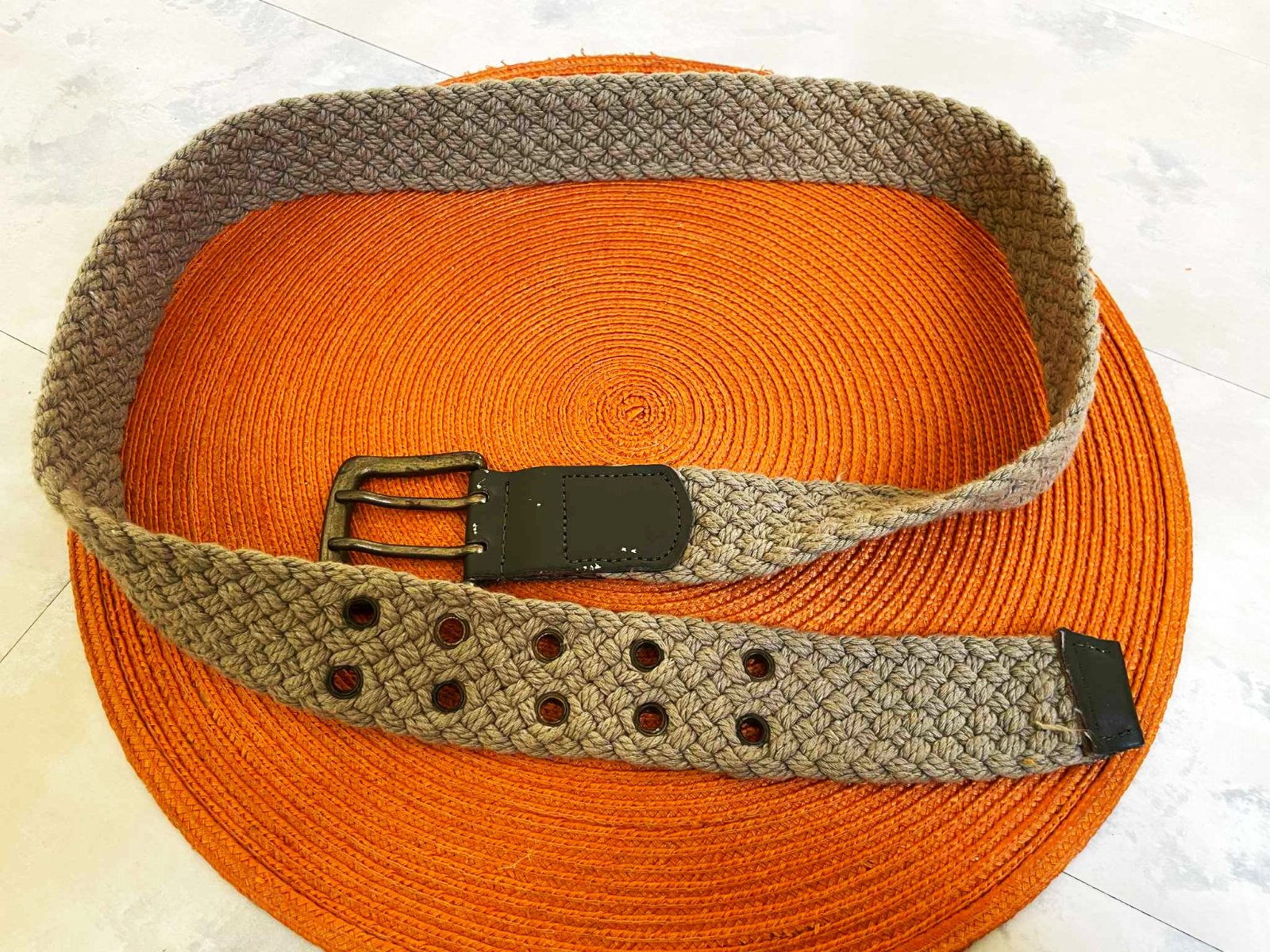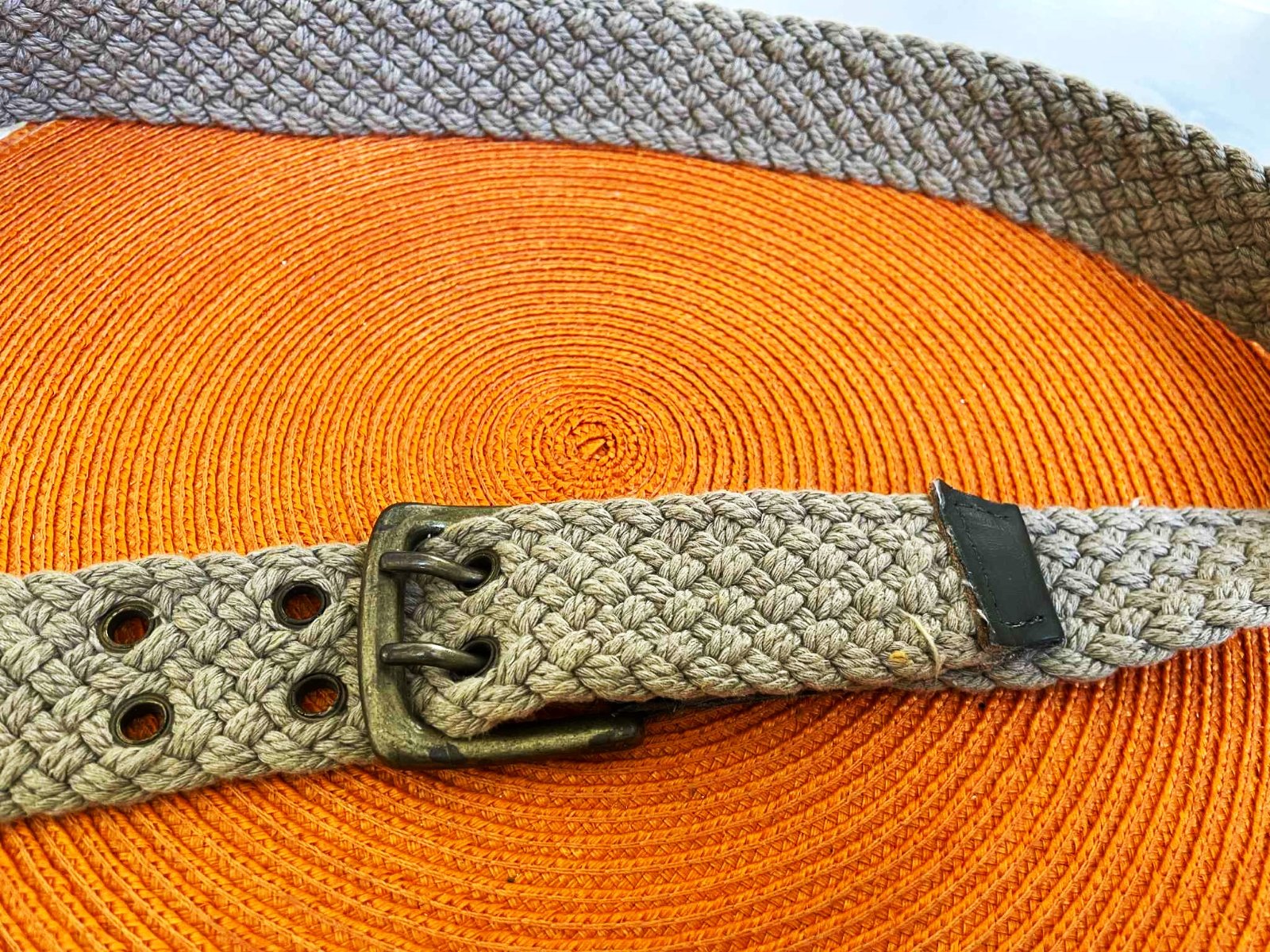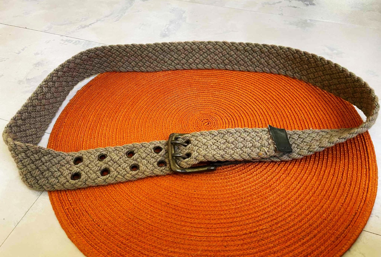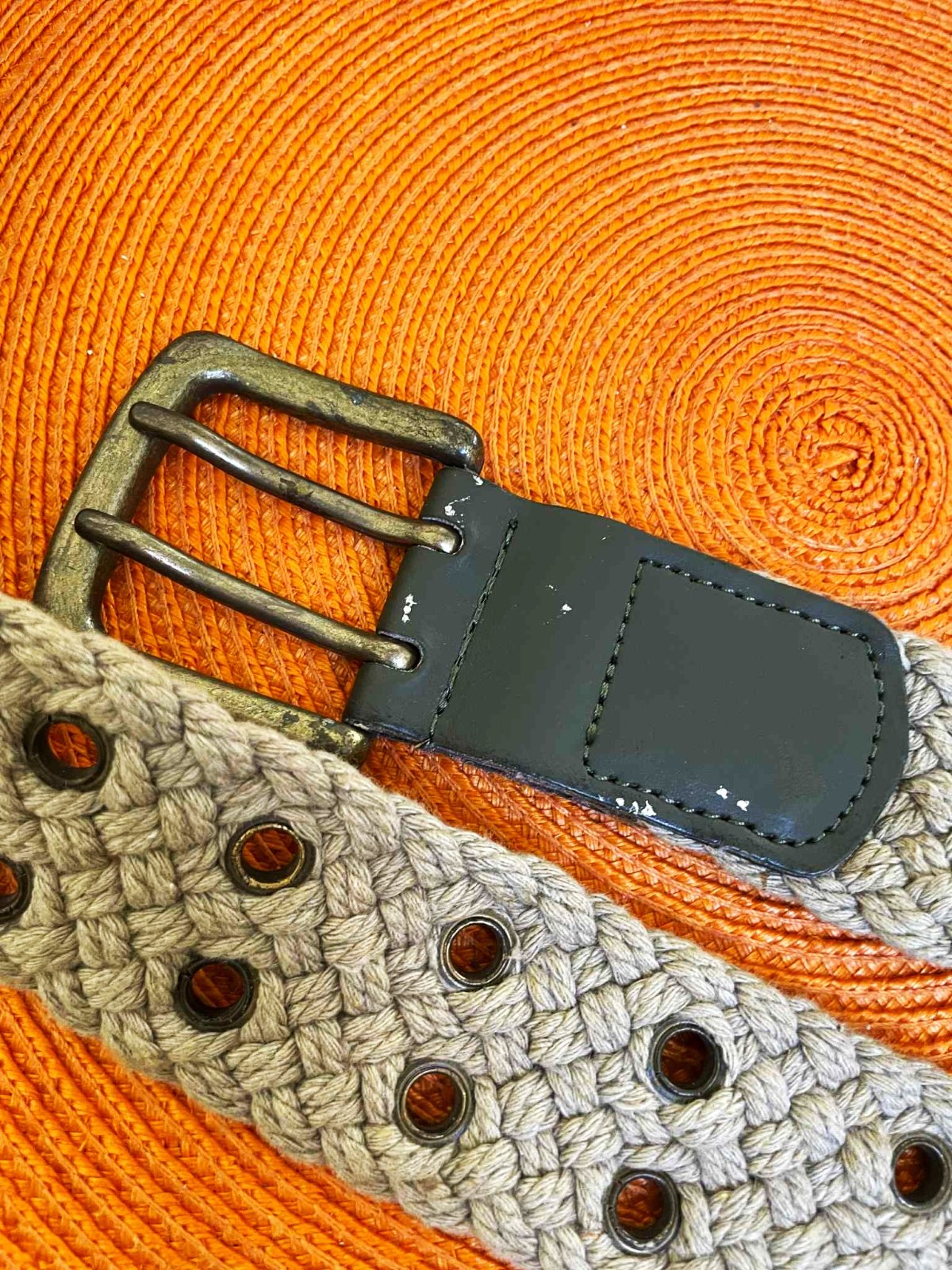 dostatočne dlhý,málo nosený unisex opasok,z jutoviny,dierky ošetrené kovaním,farba béžovo - olivová - ako ľan,jemne ošúchaná farba ( viď detailné posl 2 foto ), čo však absolútne nie je vidieť,keď sa zapne..keďže je to zo spodu,je veľmi efektný a zaujímavý...............