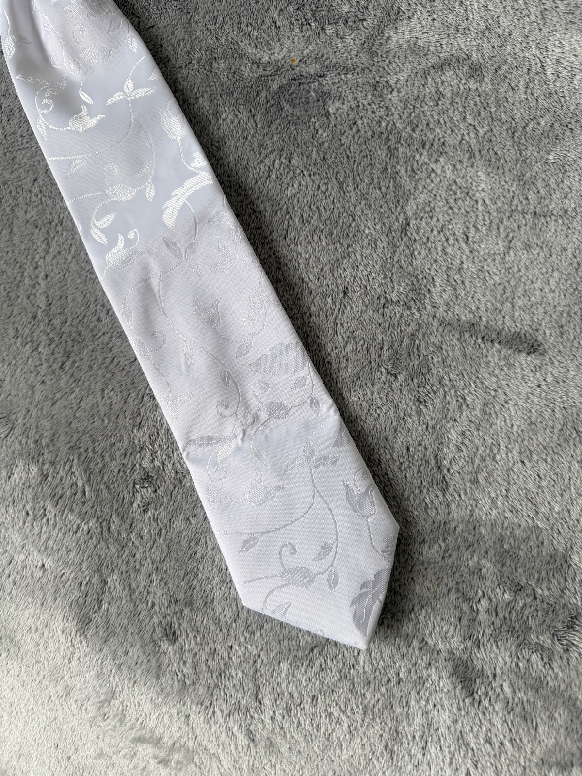 Predám raz použitú krásnu luxusnú pánsku kravatu, je naozaj krásna. Je ako nová. Je to biela svadobná francúzska kravata s jemným ornamentálnym vzorom. Kravata je ako nová, použitá len raz. Je predviazaná a má nastaviteľný popruh okolo krku, takže sa ľahko prispôsobí. Ideálny doplnok pre ženícha. Cena je 12,90€ plus poštovné