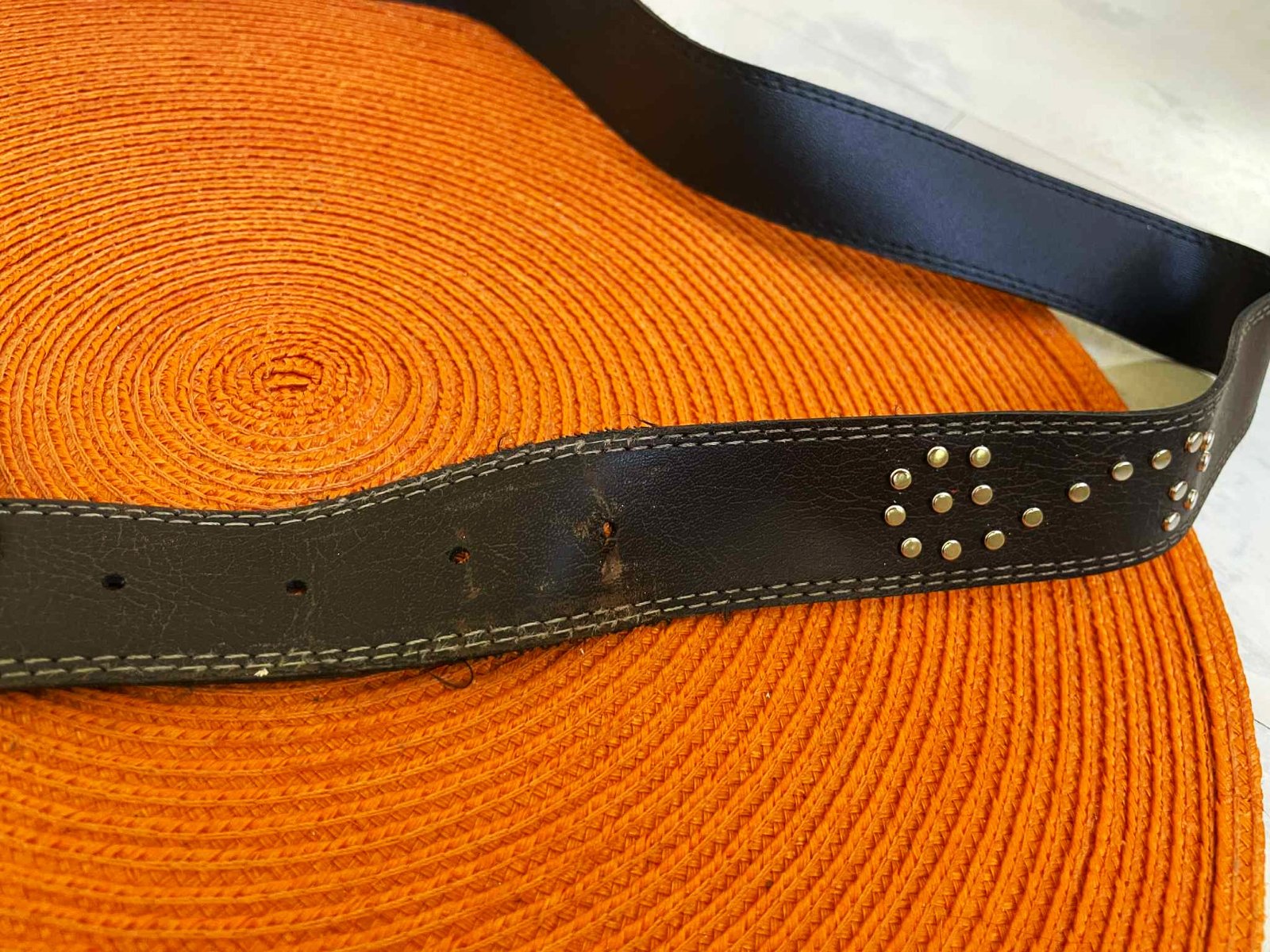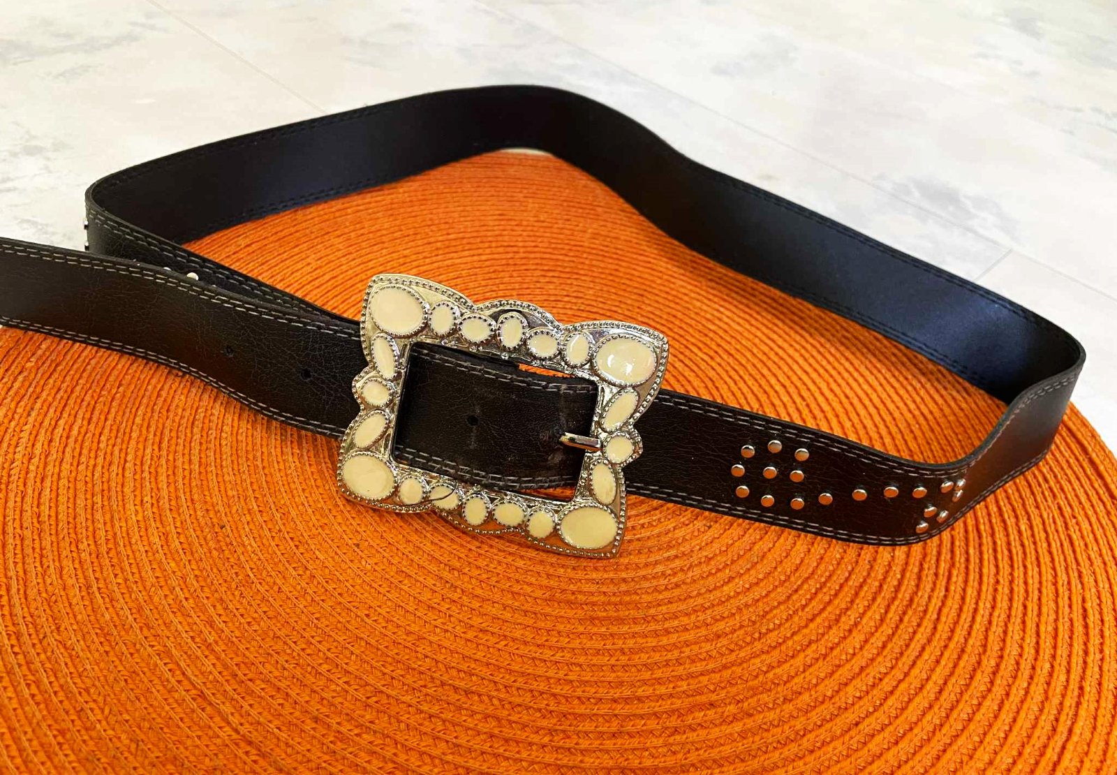 krásny opasok,syntetika a veľmi vernou štruktúrou kože,zaujímavá spona a po bokoch jemné kovanie,tam,kde sa dierka používala je jemne prešúchané,ale pri nosení to nie je absolútne vidieť,ale upozorňujem,dlžka = 105 cm,šírka = 3,2 cm
