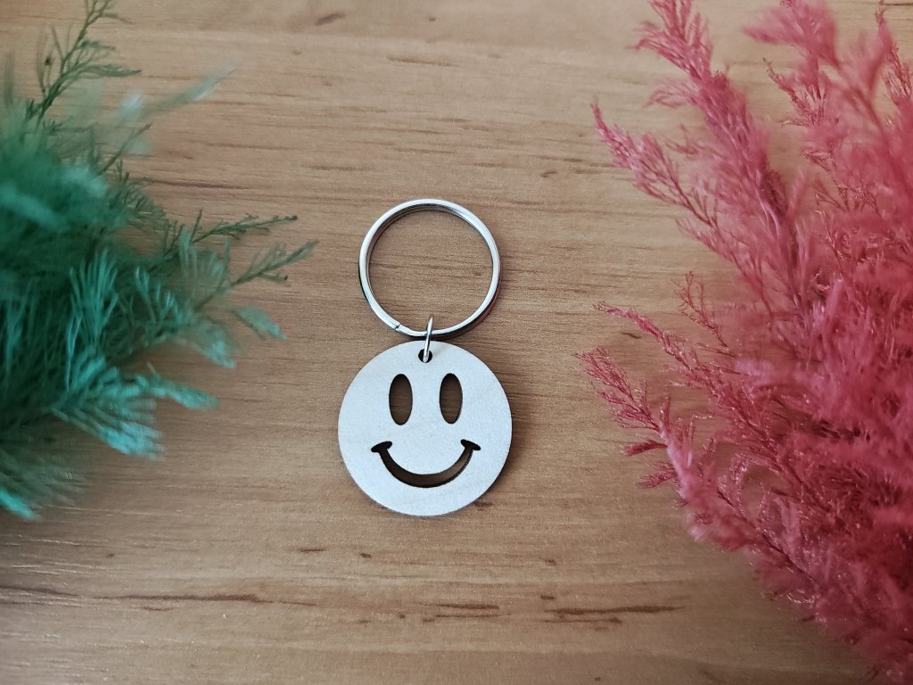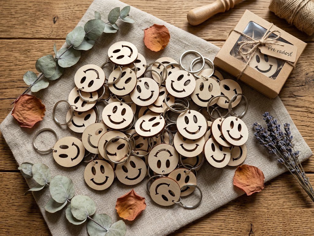 Prívesok na kľúče vyrobený z brezovej preglejky a s kolečkom na uchytenie.