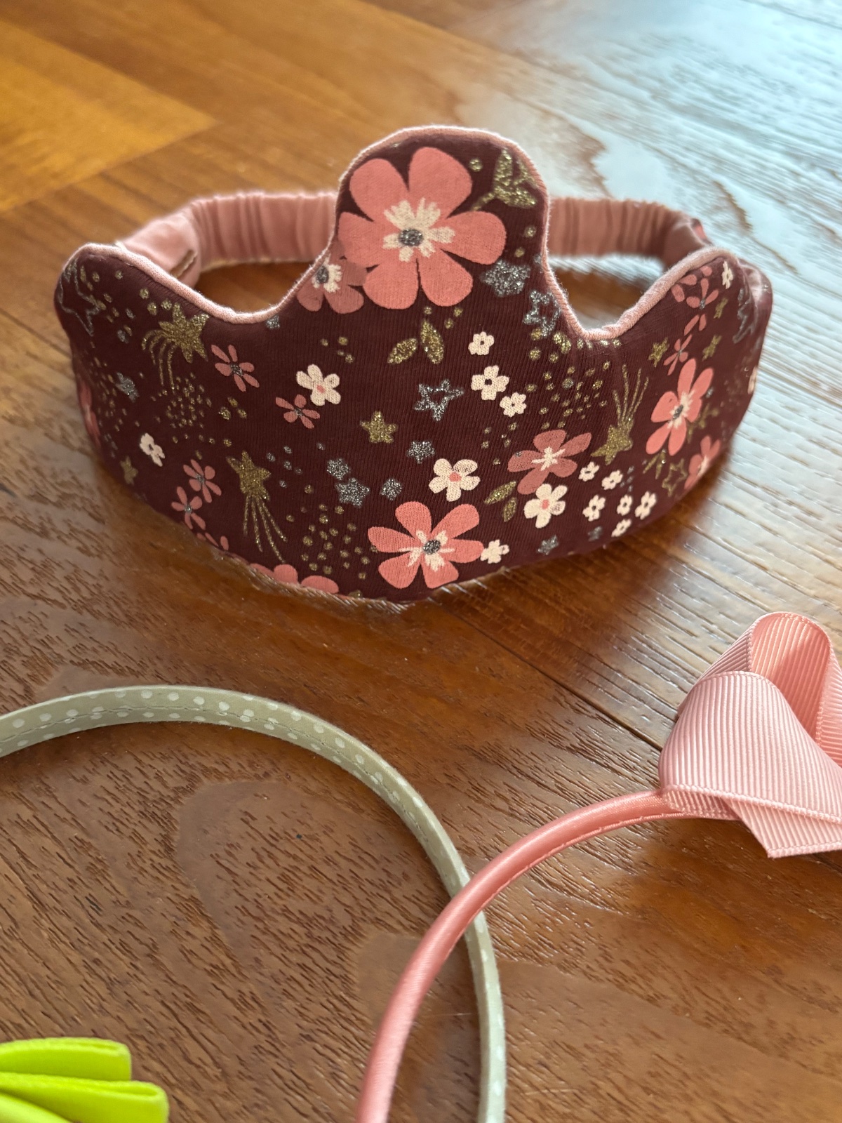 3x čelenka H&M, korunka na obojstranne nosenie kúpené v C&A, 3x pukacka, 1 gumicka a 1 sponka vyrobená ku kolekcii oblečenia značky Next. 1 saténová ozdoba na celenku.