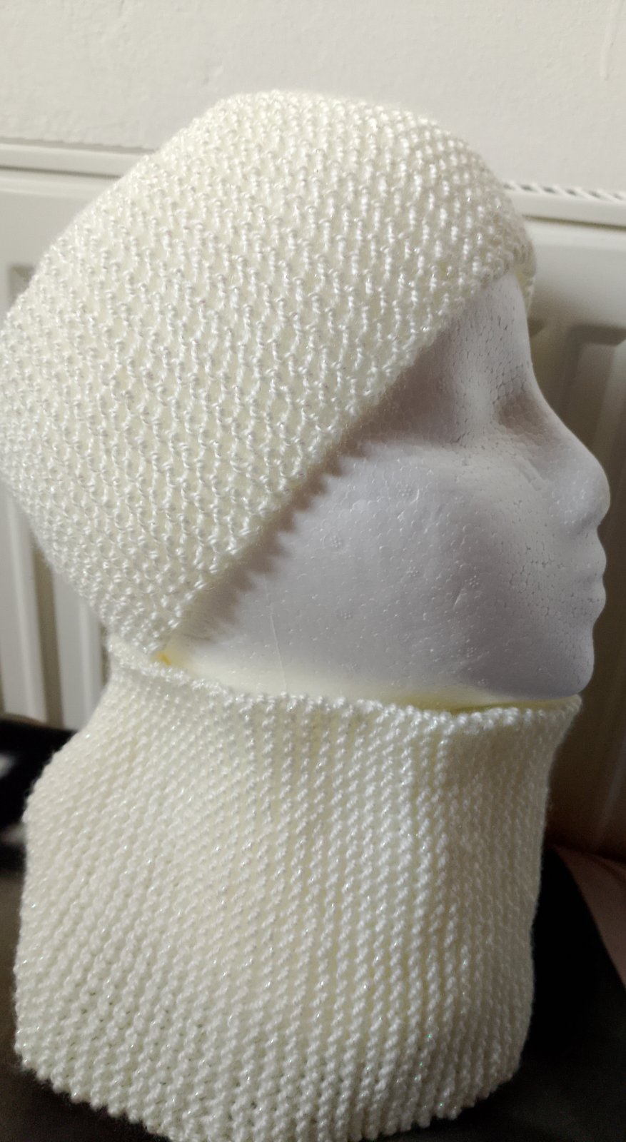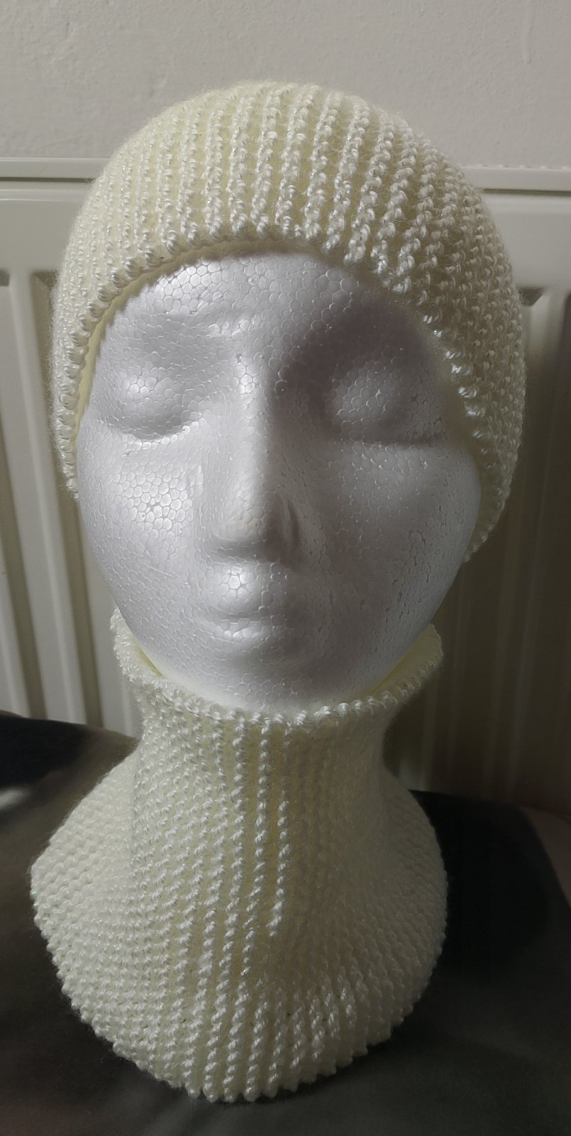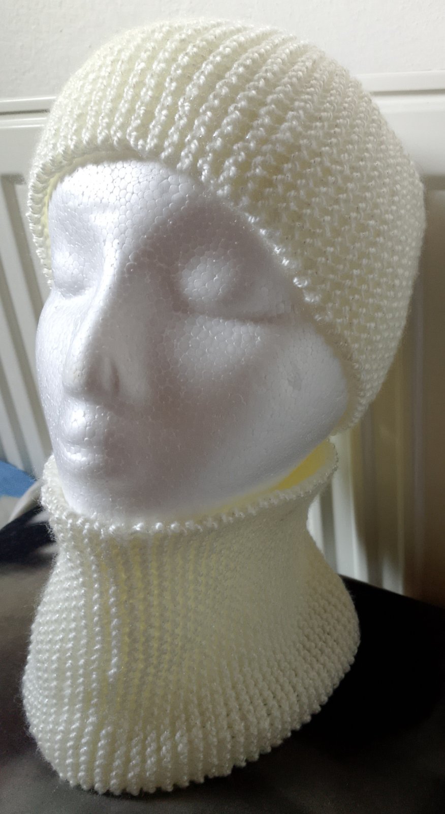 Čelenka s nákrčníkom z bielej vlny s jemným trblietavým efektom. Univerzálna veľkosť.