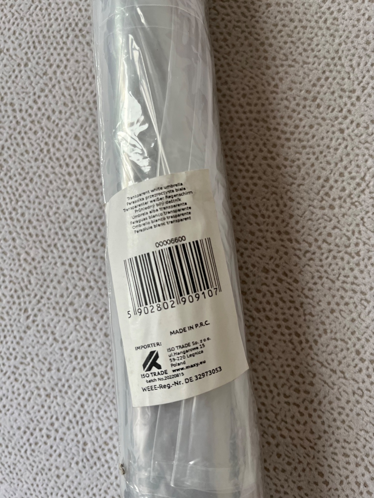Detaily • manuálne otváranie • priemer vystretého dáždnika je 64cm • dĺžka rúčky 62cm 100% PVC • top kvalita, plastová rúčka • dovoz EU