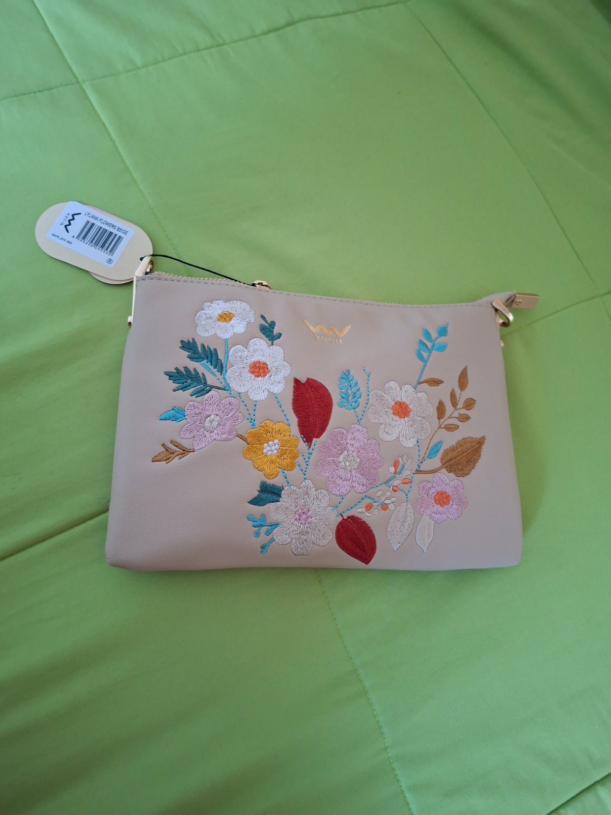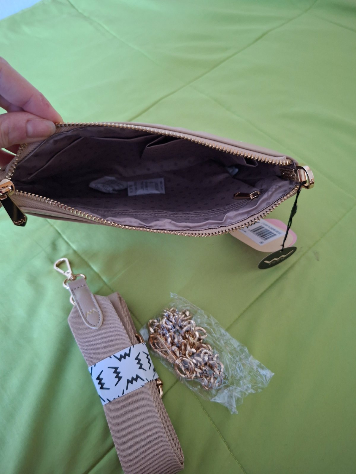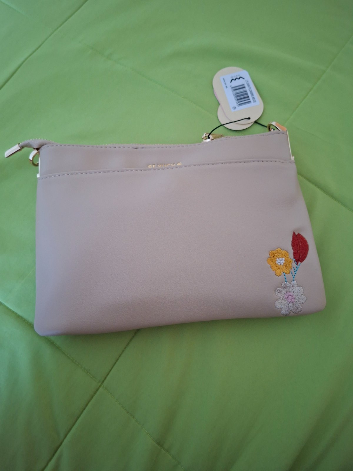 Predám béžovú koženkovú "patchwork" kabelku, do ruky/na plece. Skoro nová, málo nosená. 2 hlavné vnútorné priehradky na zips (1 - s vnútornou priehradkou na zips; 2 - s priehradkou na mobil a perá)...
