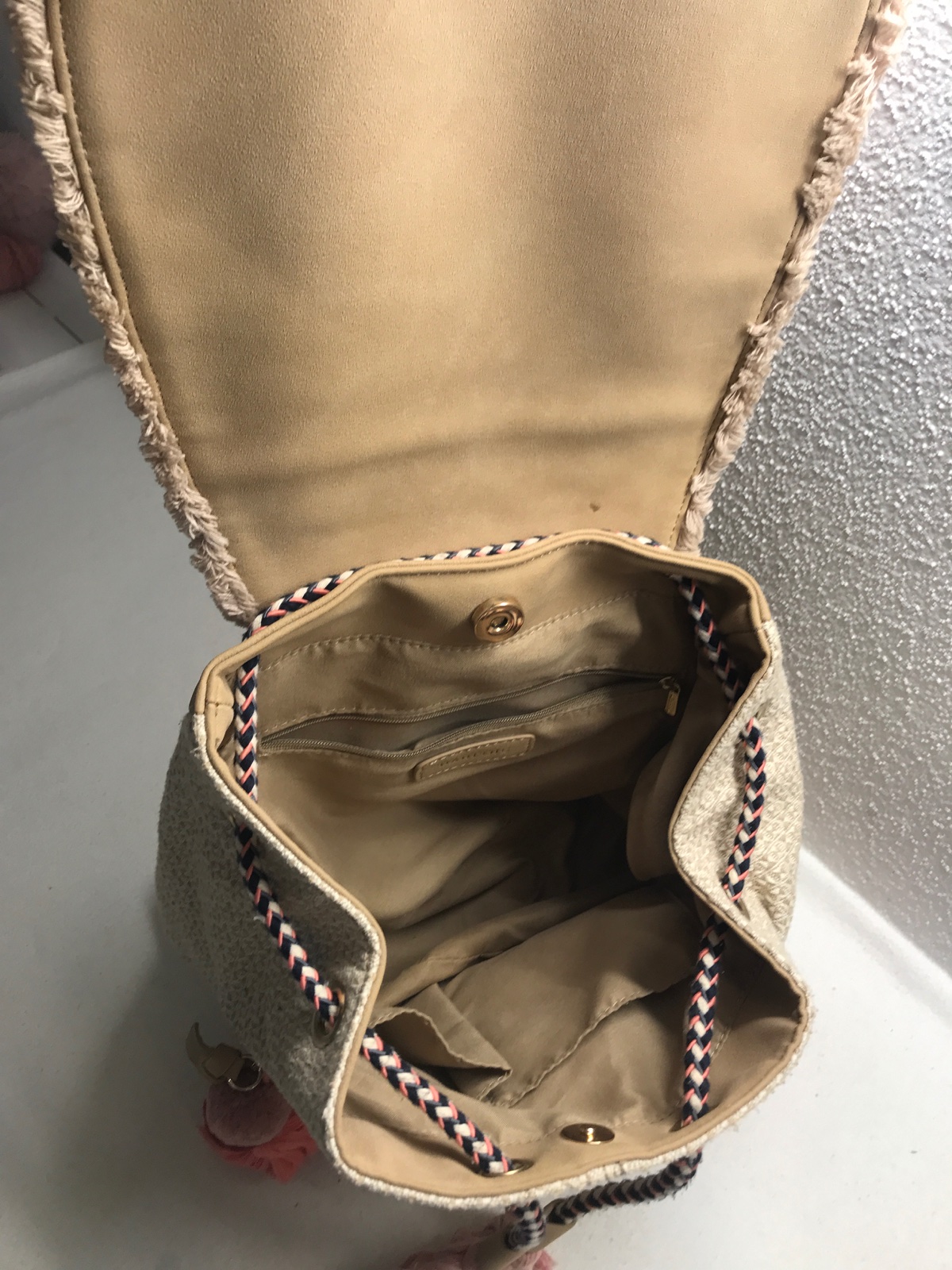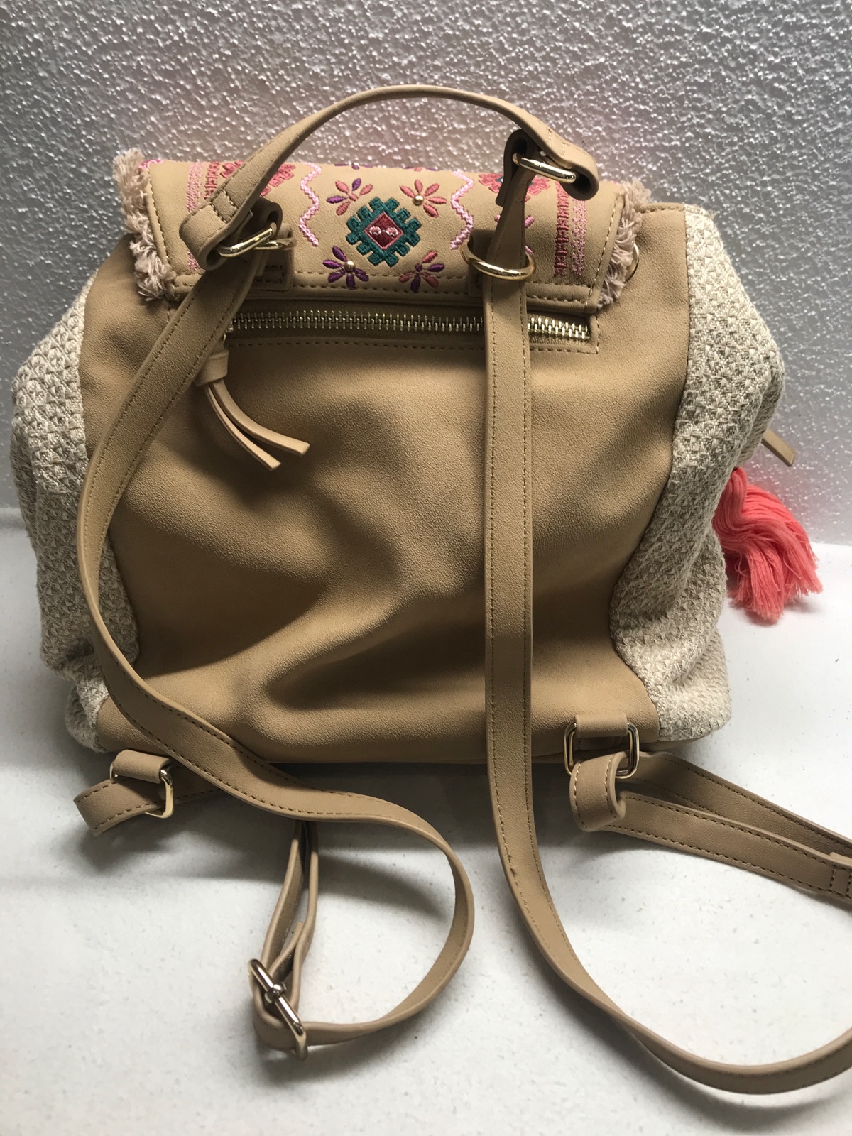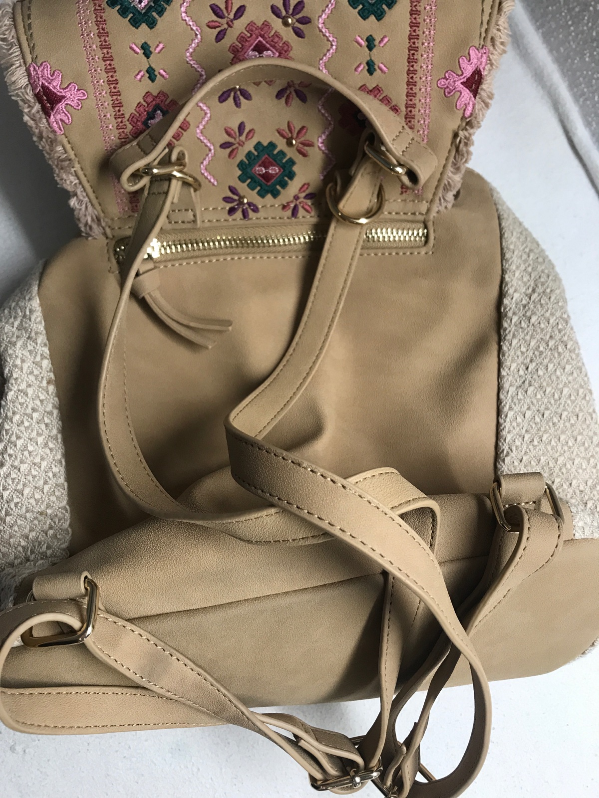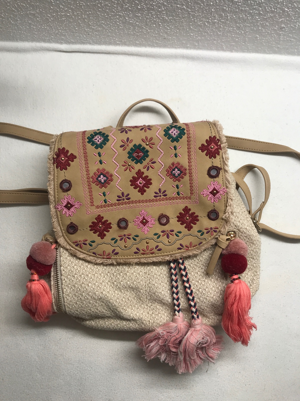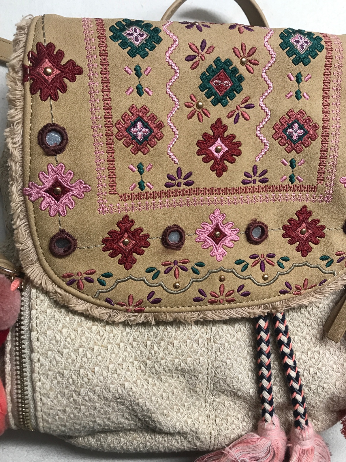 Krasny ruksak, kombinacia koza a latka, zdobene vysivanymi aplikaciami, strapcami, malimy zrkadielkami, je krasna, bohemska, dost priestranna a s vela roznymi vreckami