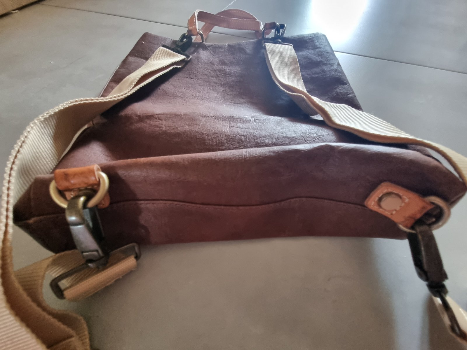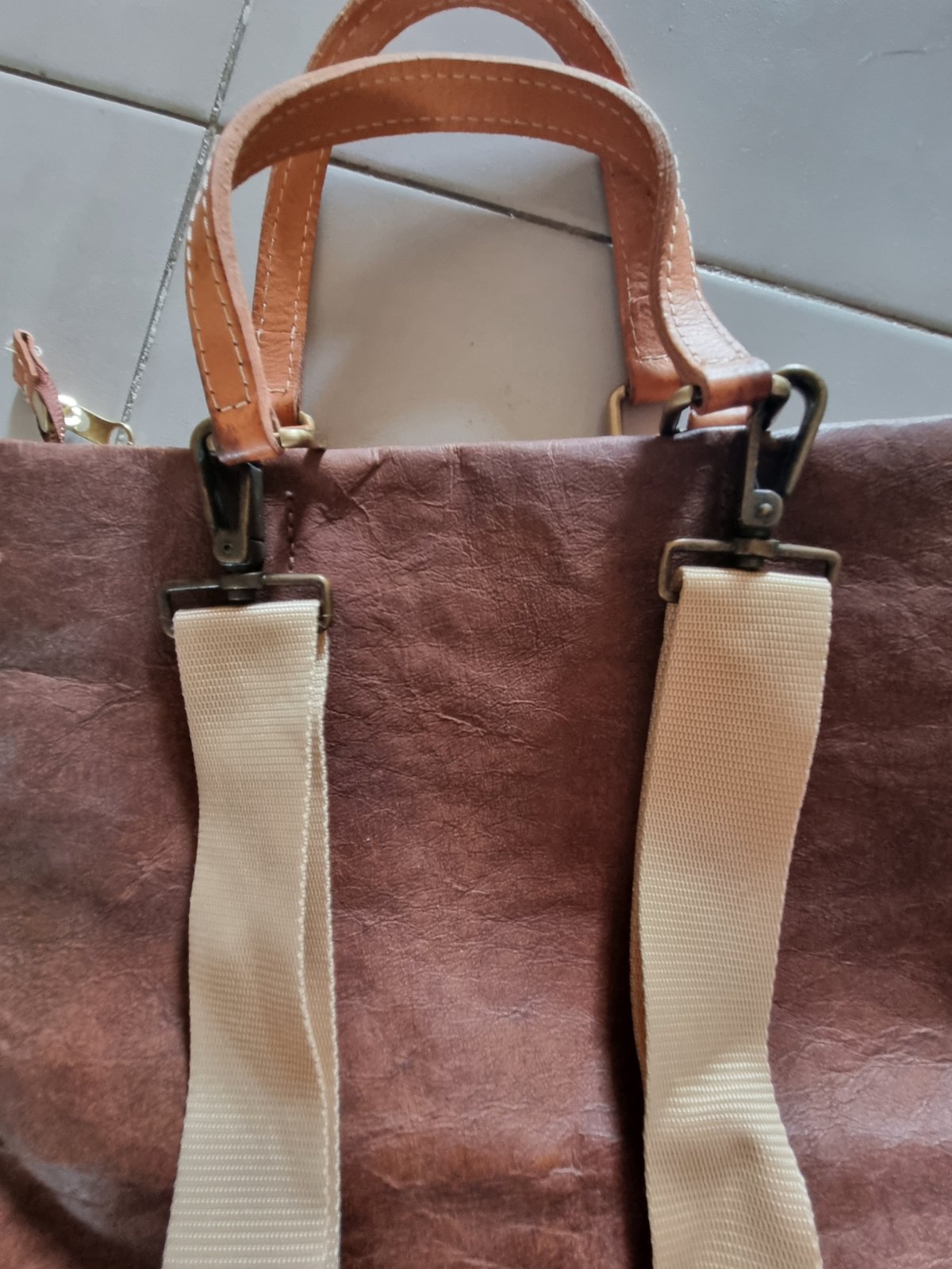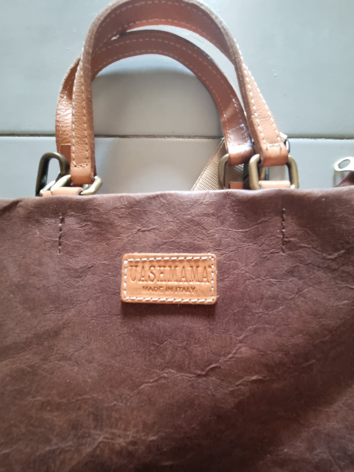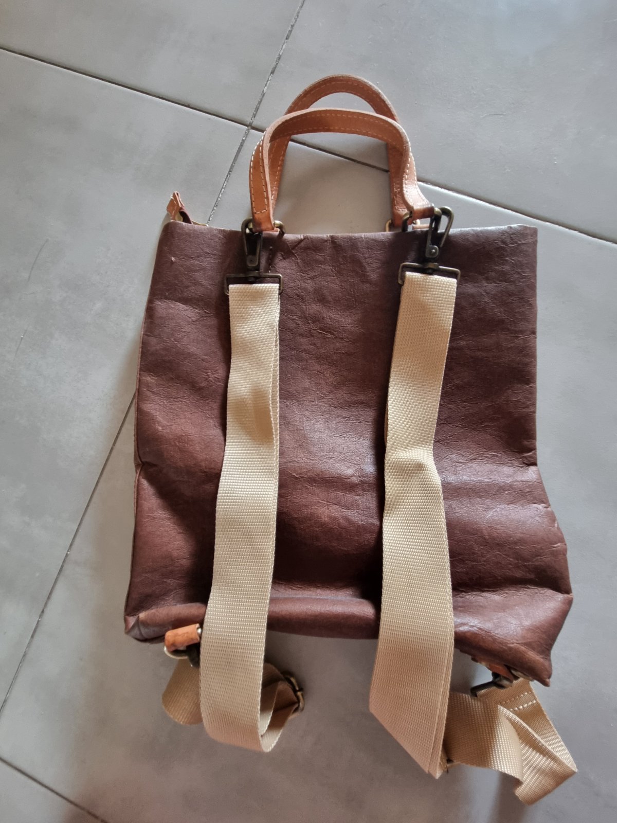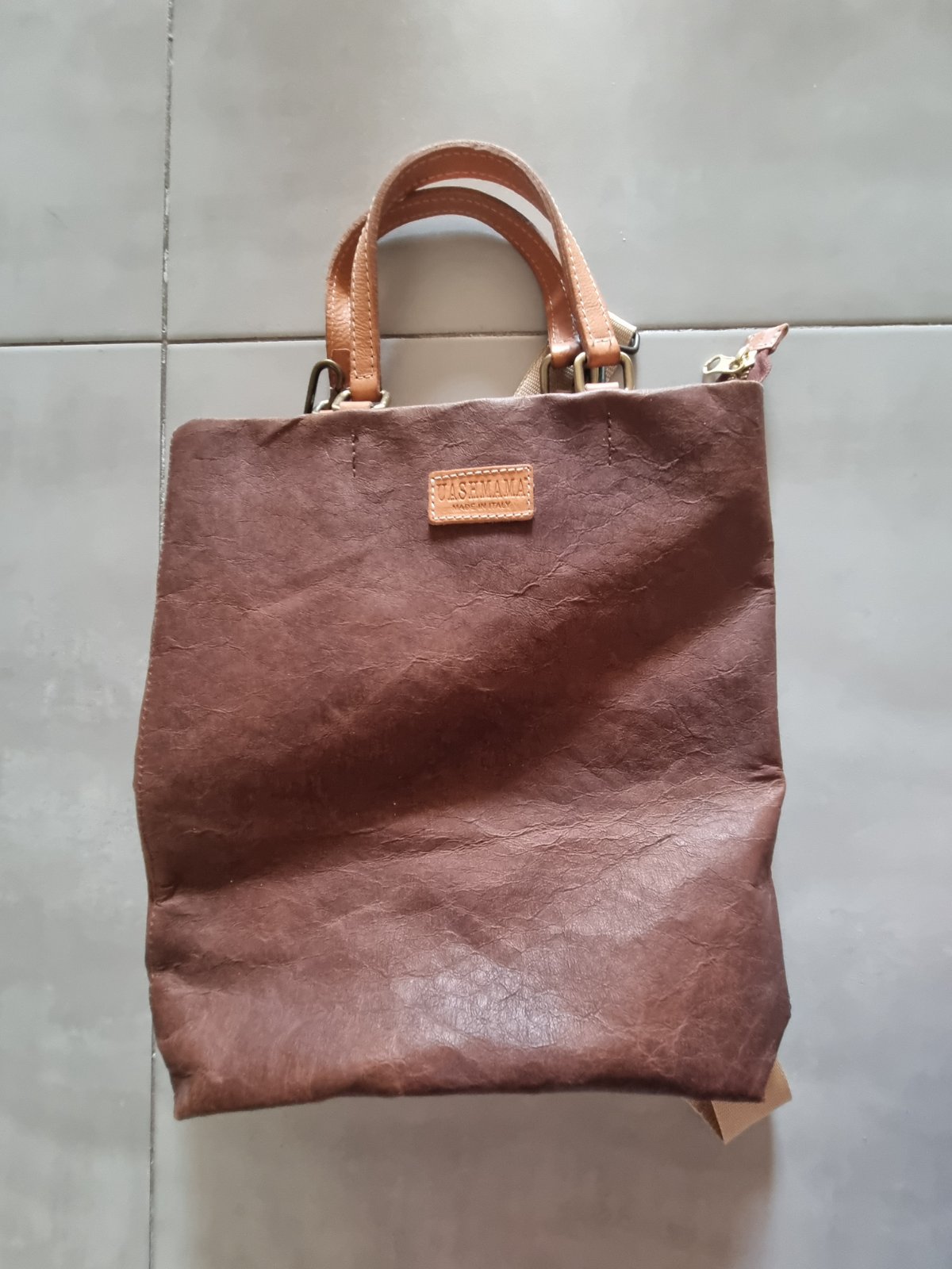 Nový, nenosený Uashmama batoh farby brandy. Možno ho nosiť v ruke alebo na chrbte ako batoh. Vyrobený z prateľného papiera.