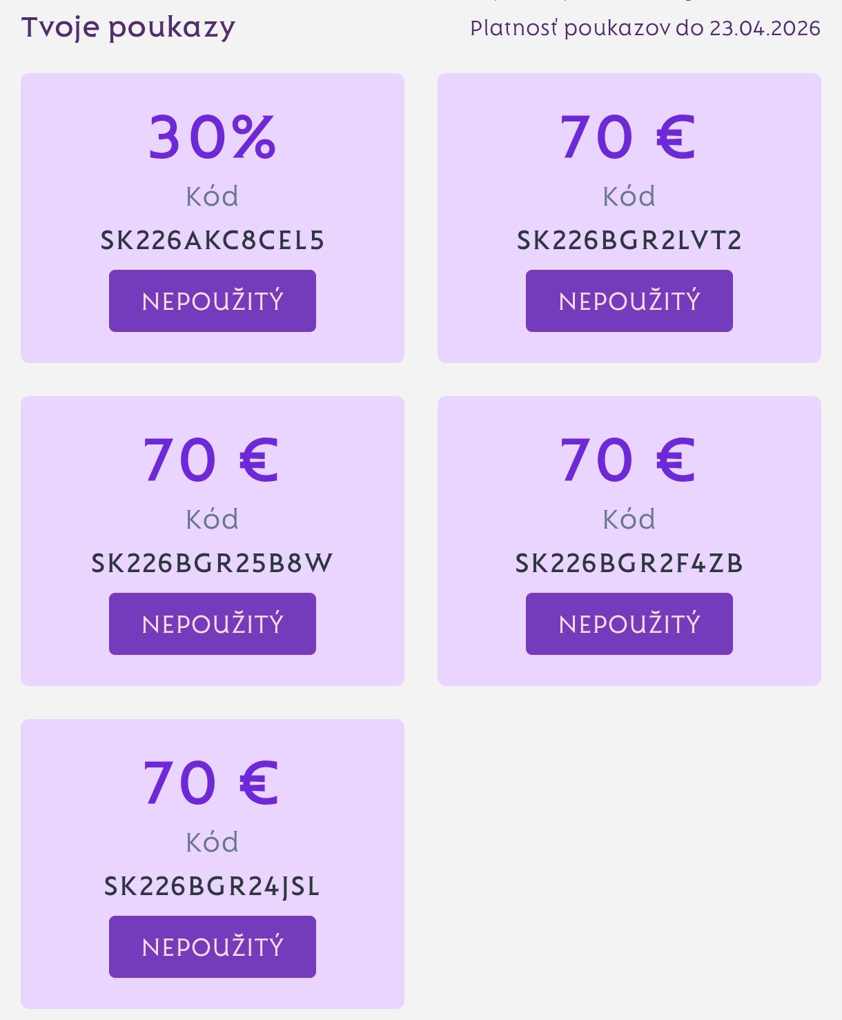 Darujem darčekové poukazy na nákup v obchode DAJANA RODRIGUEZ. Platné sú do 26.3.2026. Kupóny sú na zľavu 70€, uplatniť sa dajú v predajni alebo online na nákup nad 160 €. SK126CIZ481IQ SK126CIZ4...