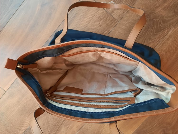 Nosená kabelka známej značky, chyby iba na ramienkach /treba dat opravit/ - zohladnene v cene, tmavomodra s hnedou koženkou a zlatymi aplikaciami, vyska 35cm, dlzka 40cm, zapínanie na zips