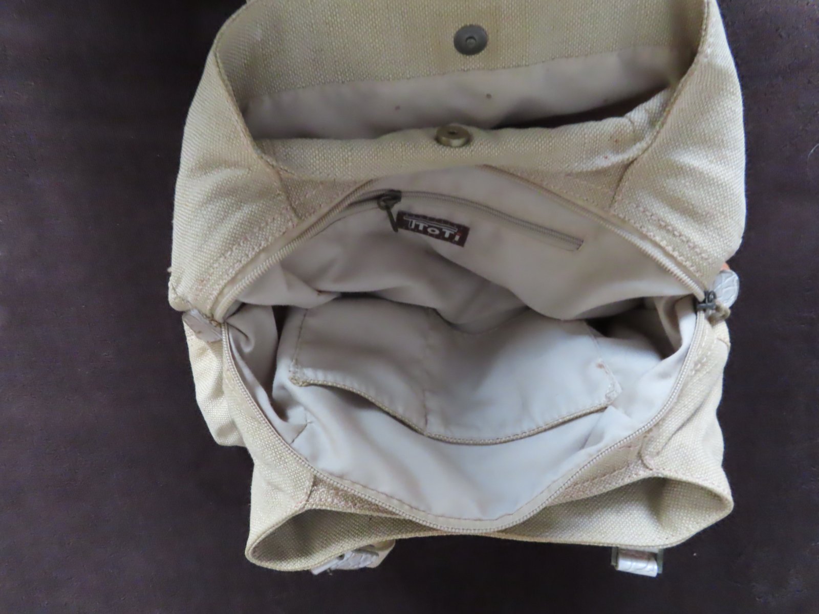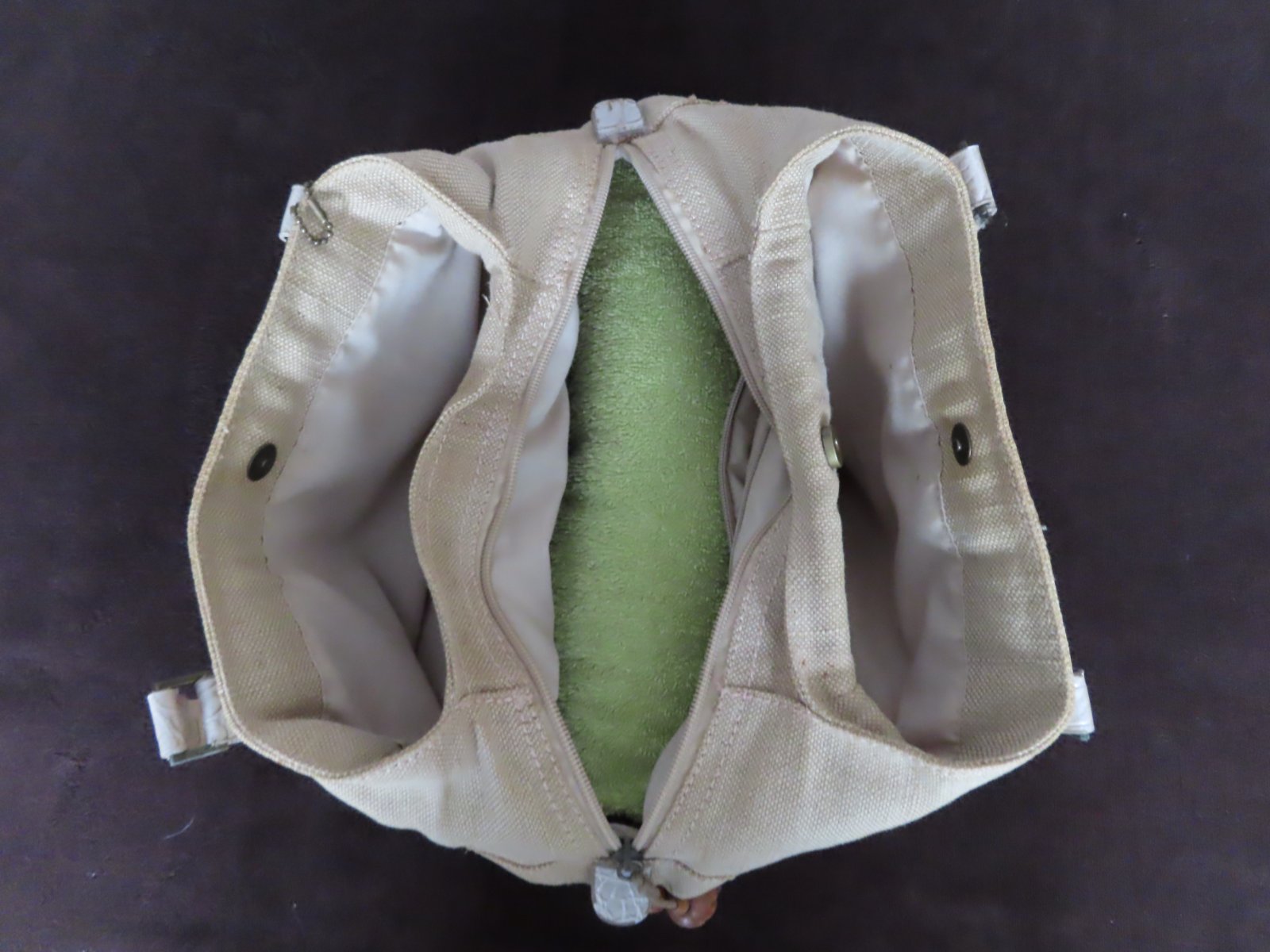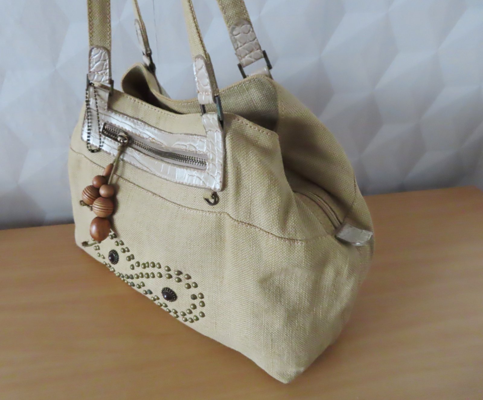 Kabelka s aplikáciou na prednom diele. Má 3 priečinky, hlavný - stredný na zips, bo bokoch hlboké priečinky so zatváraním na nity, vpredu vrecko na zips.
