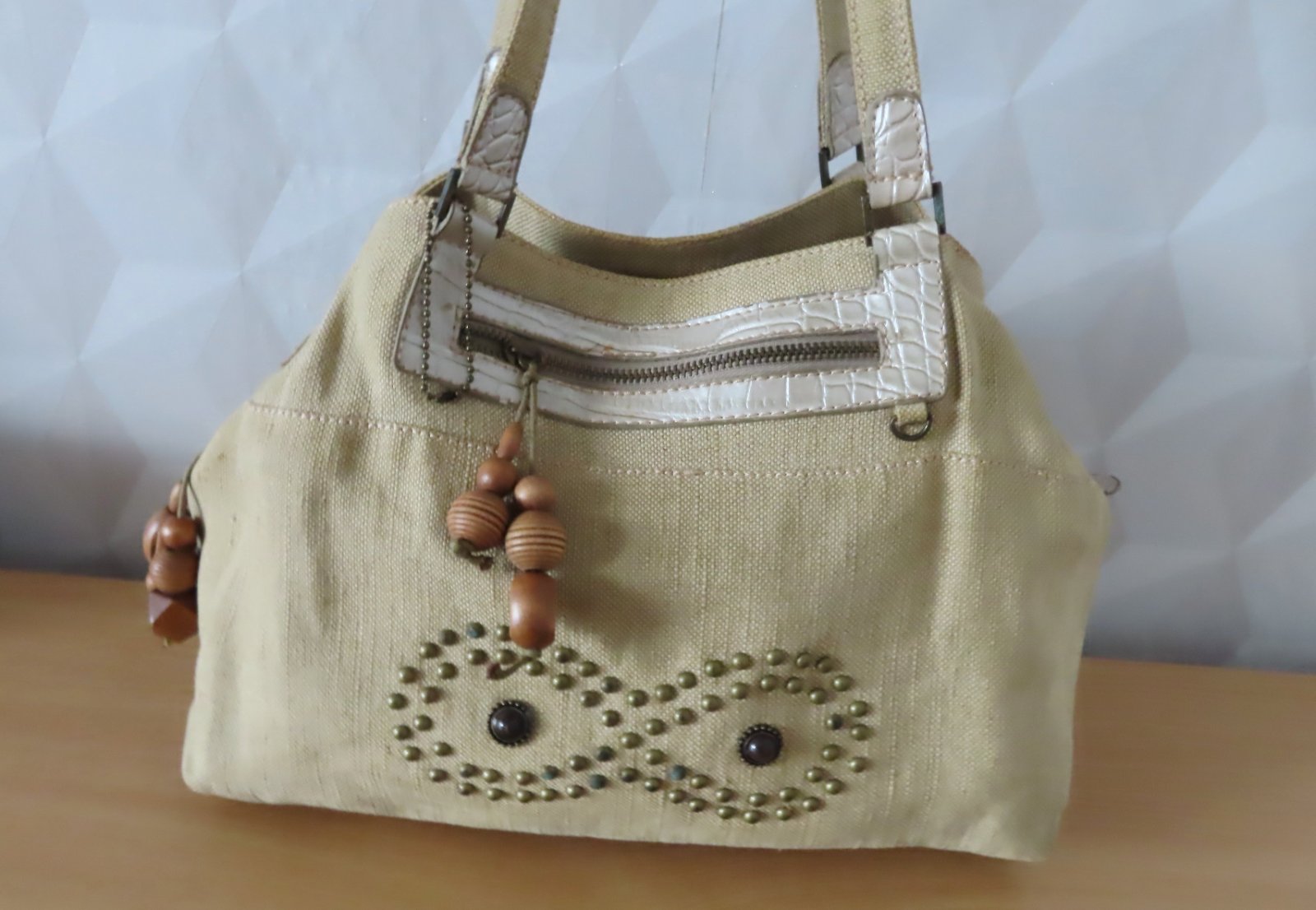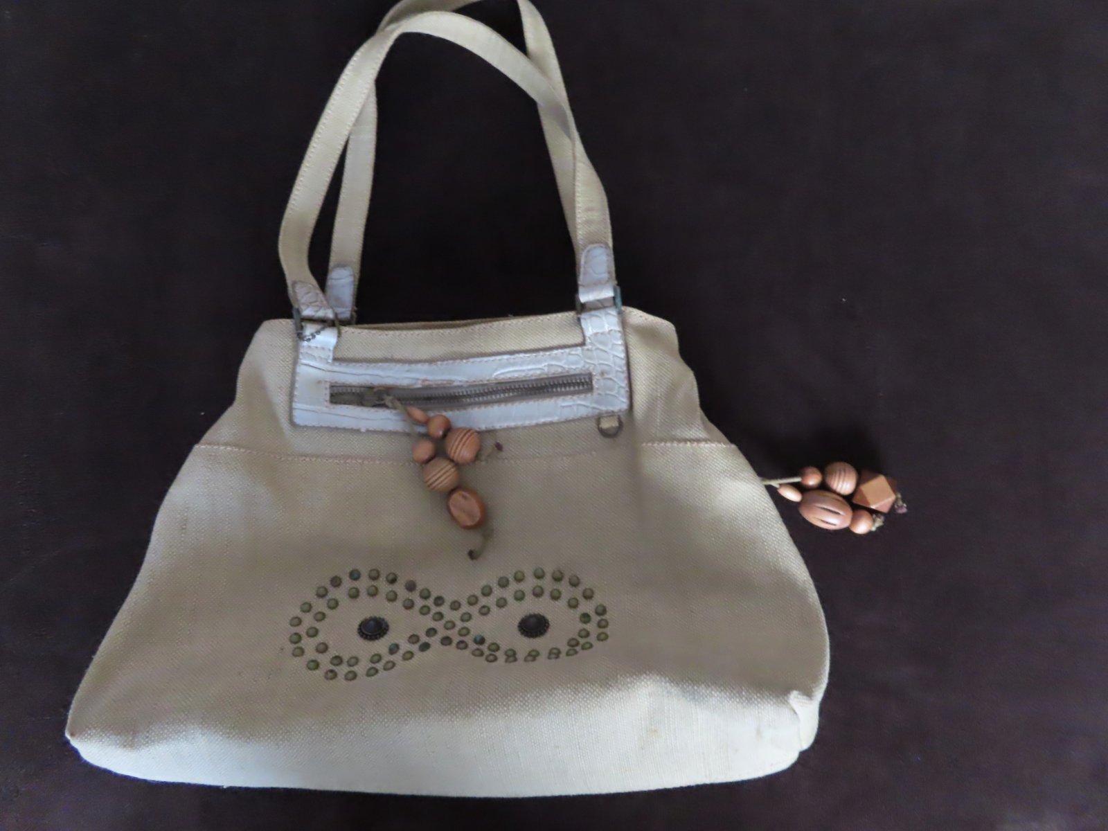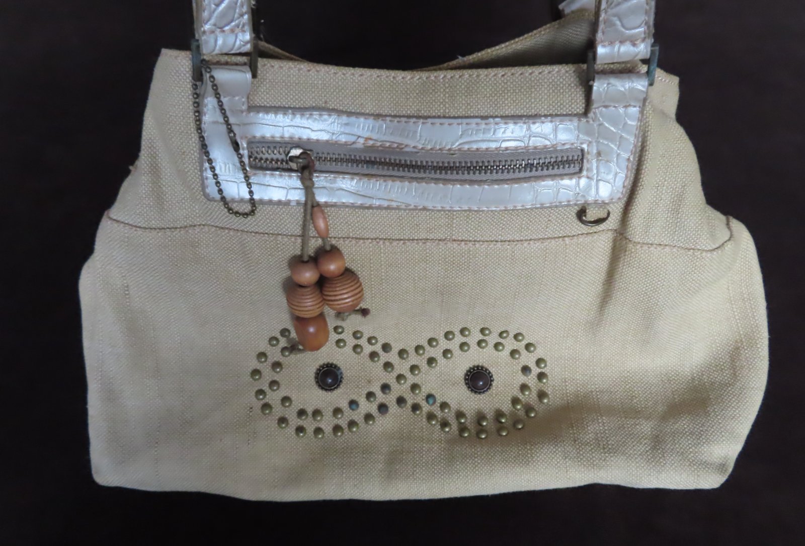 Dámska plátenná kabelka s peknými drevenými príveskami.