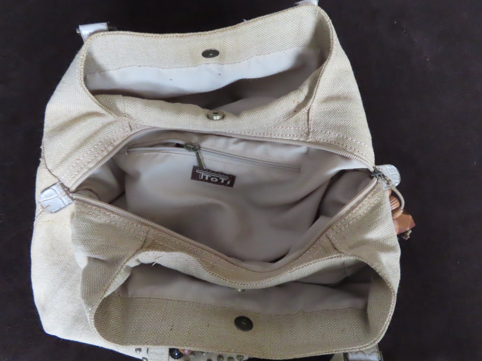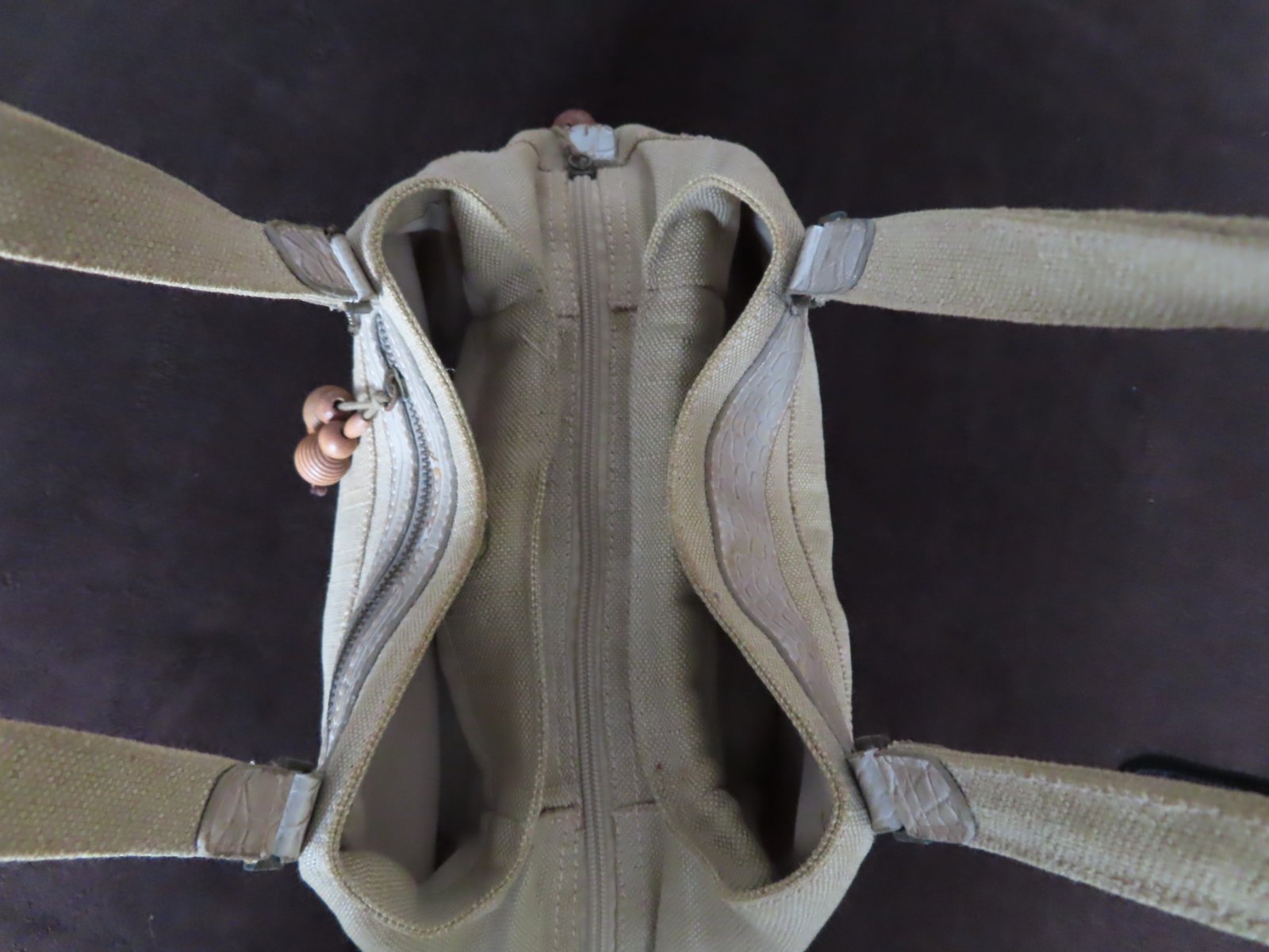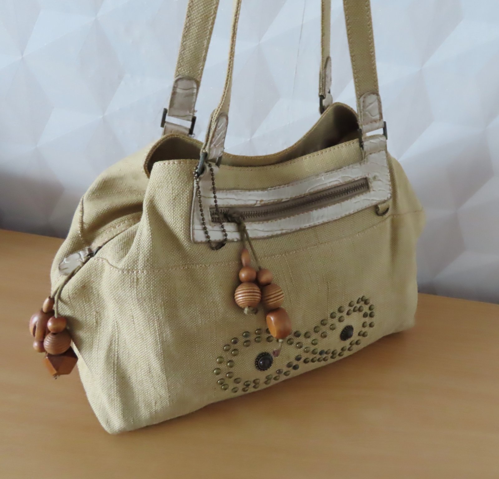 Dámska plátenná kabelka s peknými drevenými príveskami.