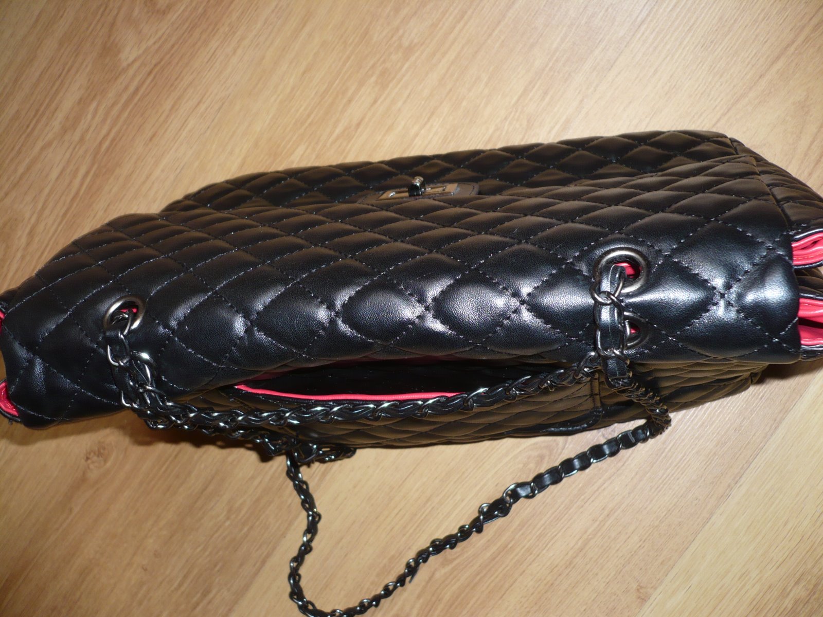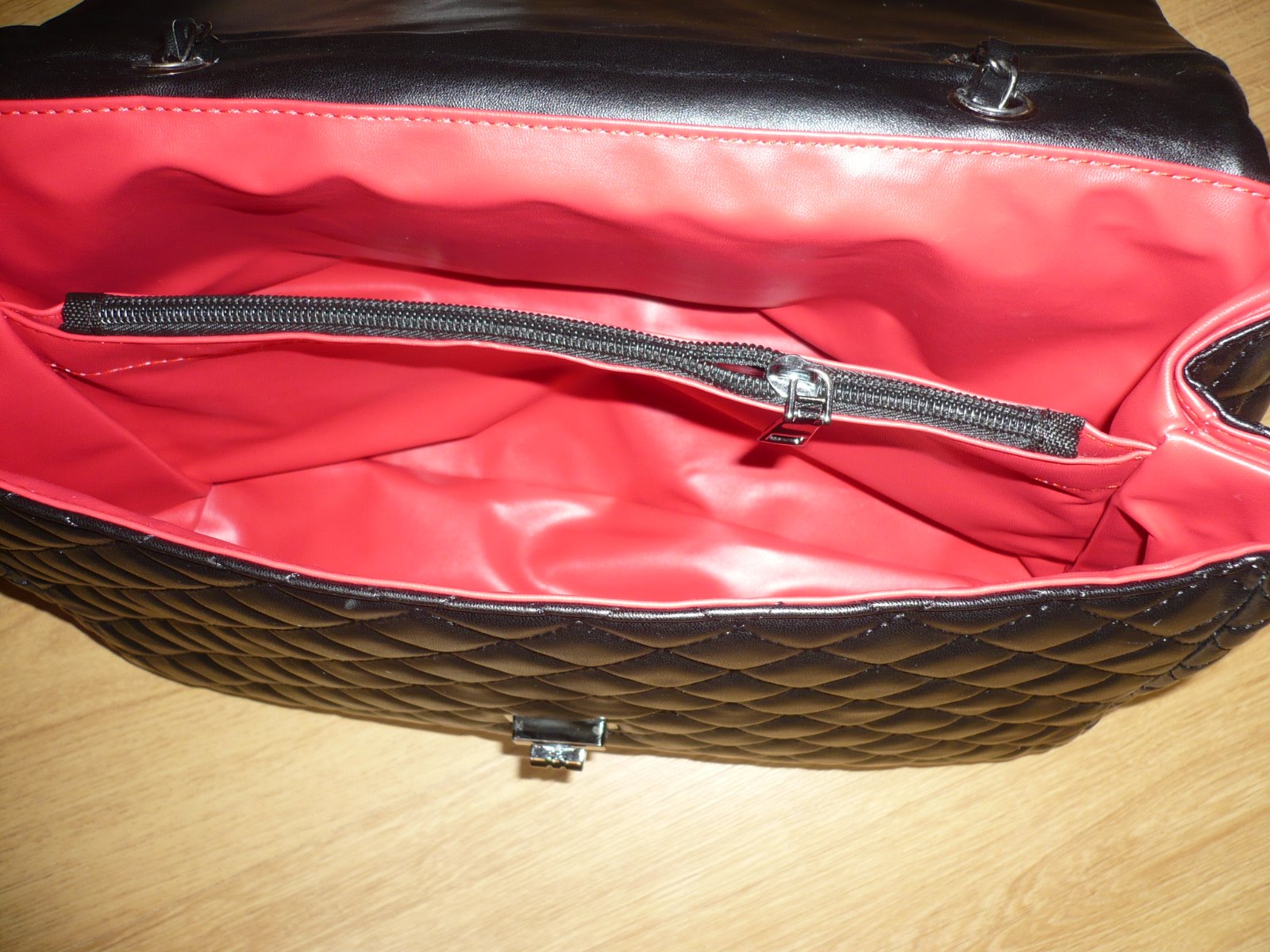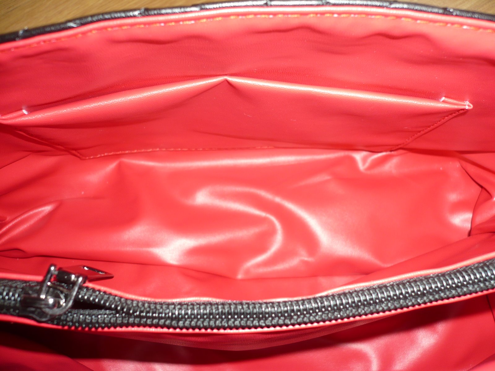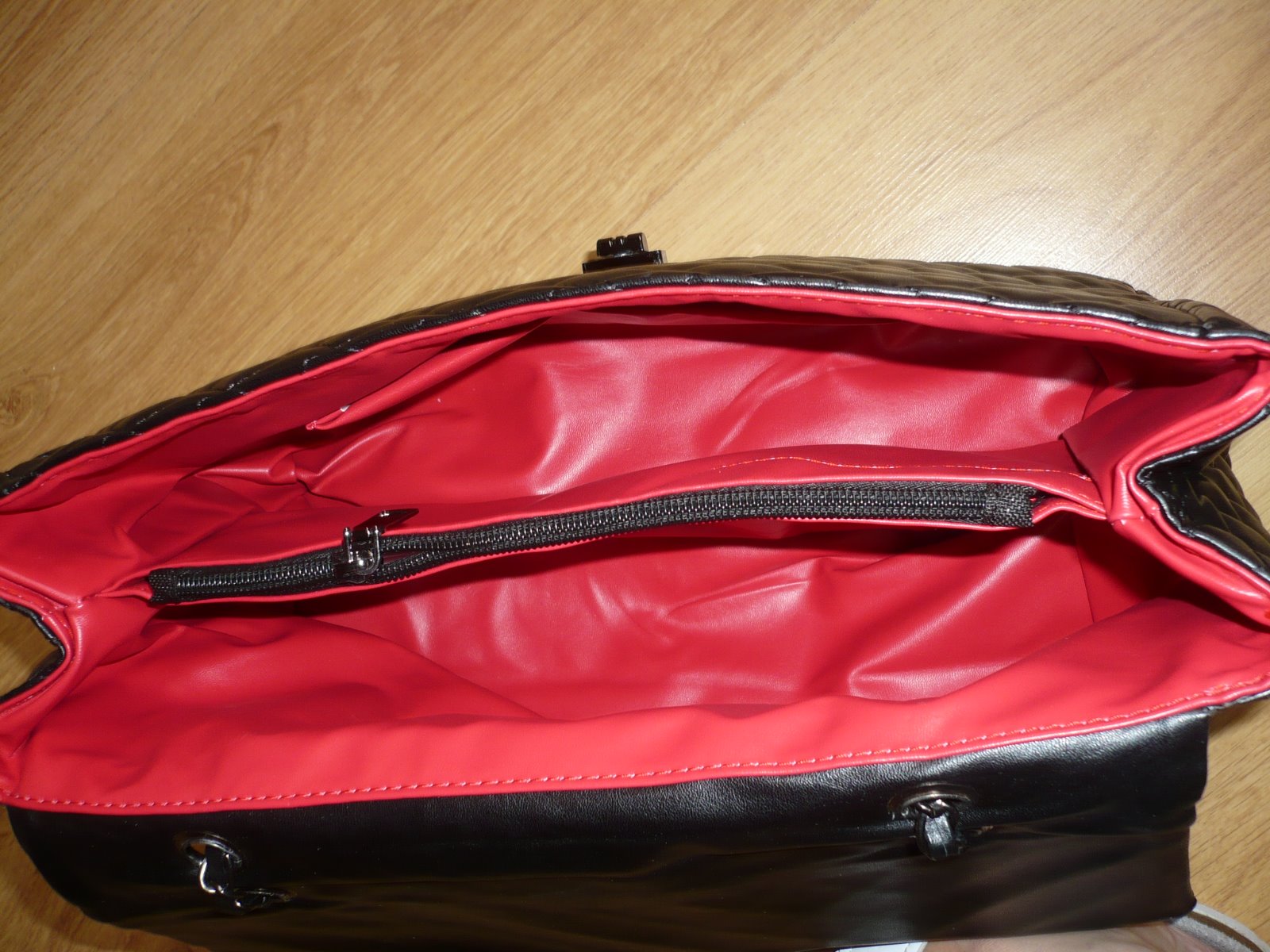 nenosená koženková priestranná kabelka, vnútri 3 oddelenia, 2 otvorené, 1 na zips, naspodku kovové "štuplíky" ochraňujúce pred ošúchaním, š.35cm, v.24cm, h.14cm, ramienko 95cm